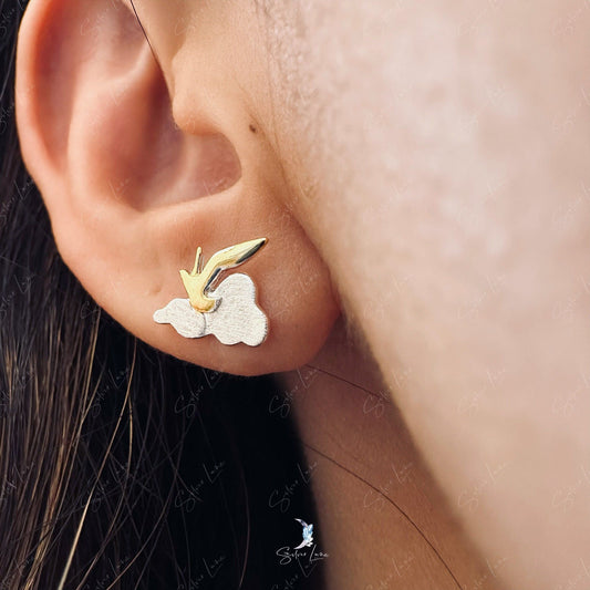 Swallow bird, sun, and cloud sterling silver stud earrings