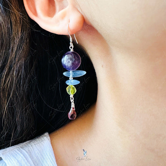 Amethyst, aquamarine, peridot, red garnet multi gemstone earrings