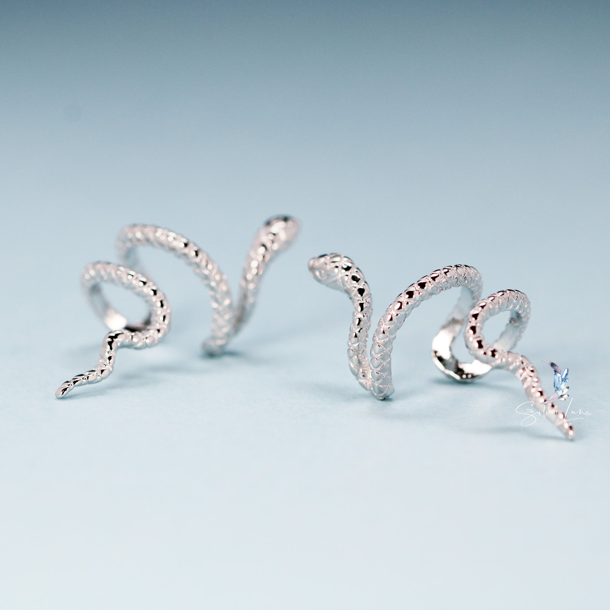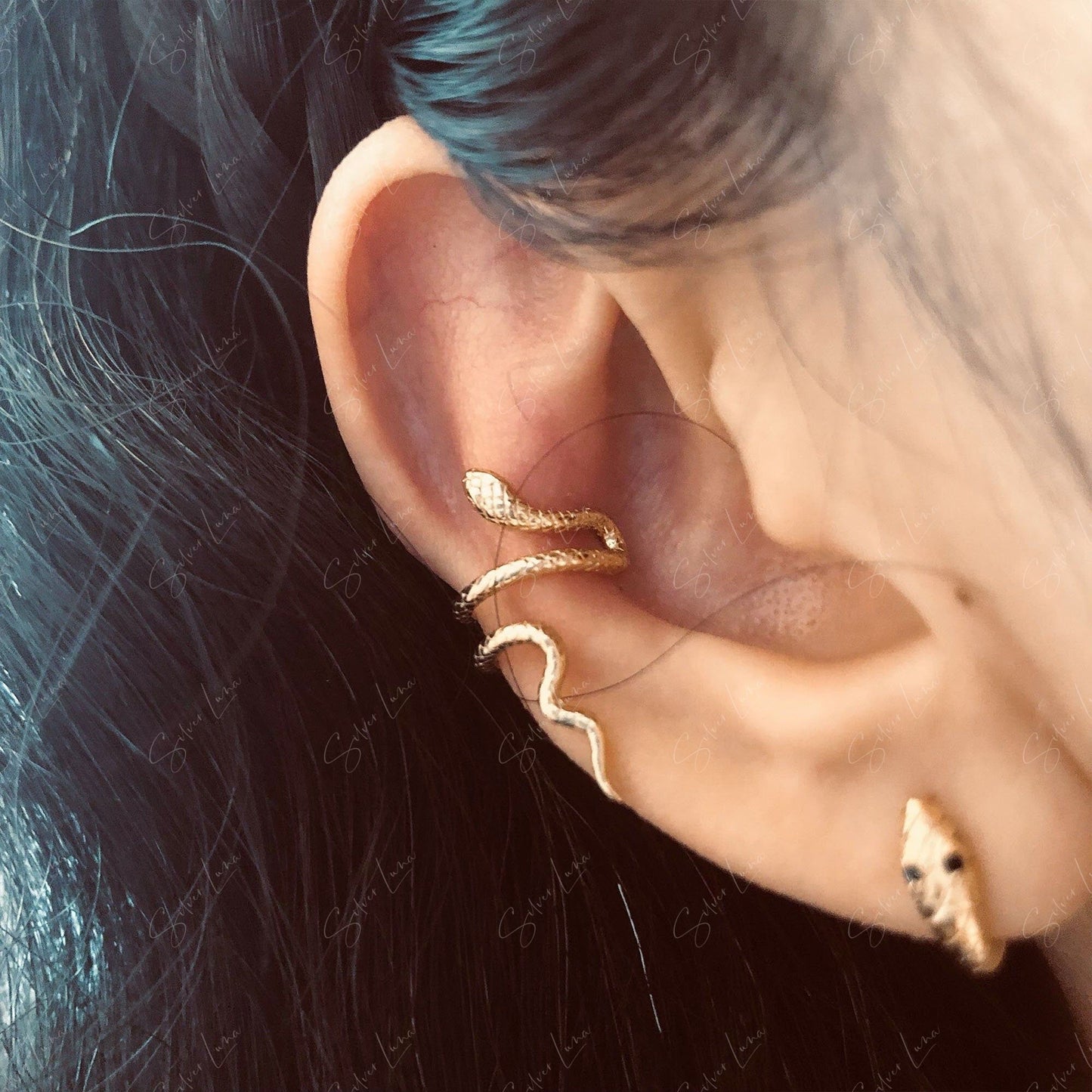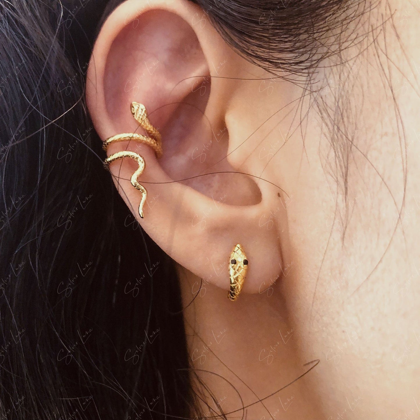 These sterling silver ear cuffs feature a snake body that wraps around the ear, providing a secure hold on the cartilage. They are crafted with solid 925 sterling silver and 18k gold plating for a luxurious appearance. The perfect accessory for a bold and confident look.