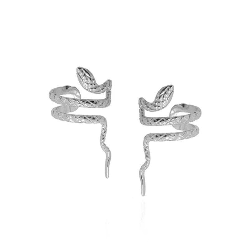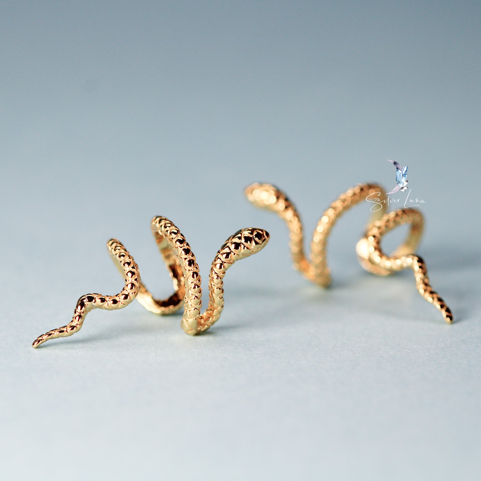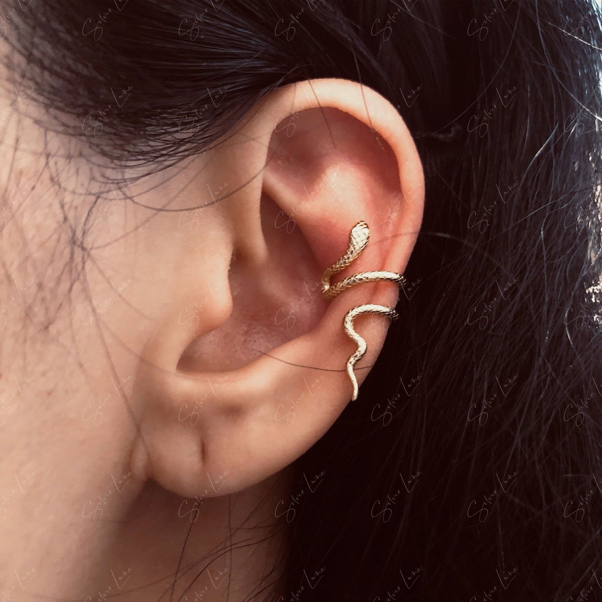 These sterling silver ear cuffs feature a snake body that wraps around the ear, providing a secure hold on the cartilage. They are crafted with solid 925 sterling silver and 18k gold plating for a luxurious appearance. The perfect accessory for a bold and confident look.