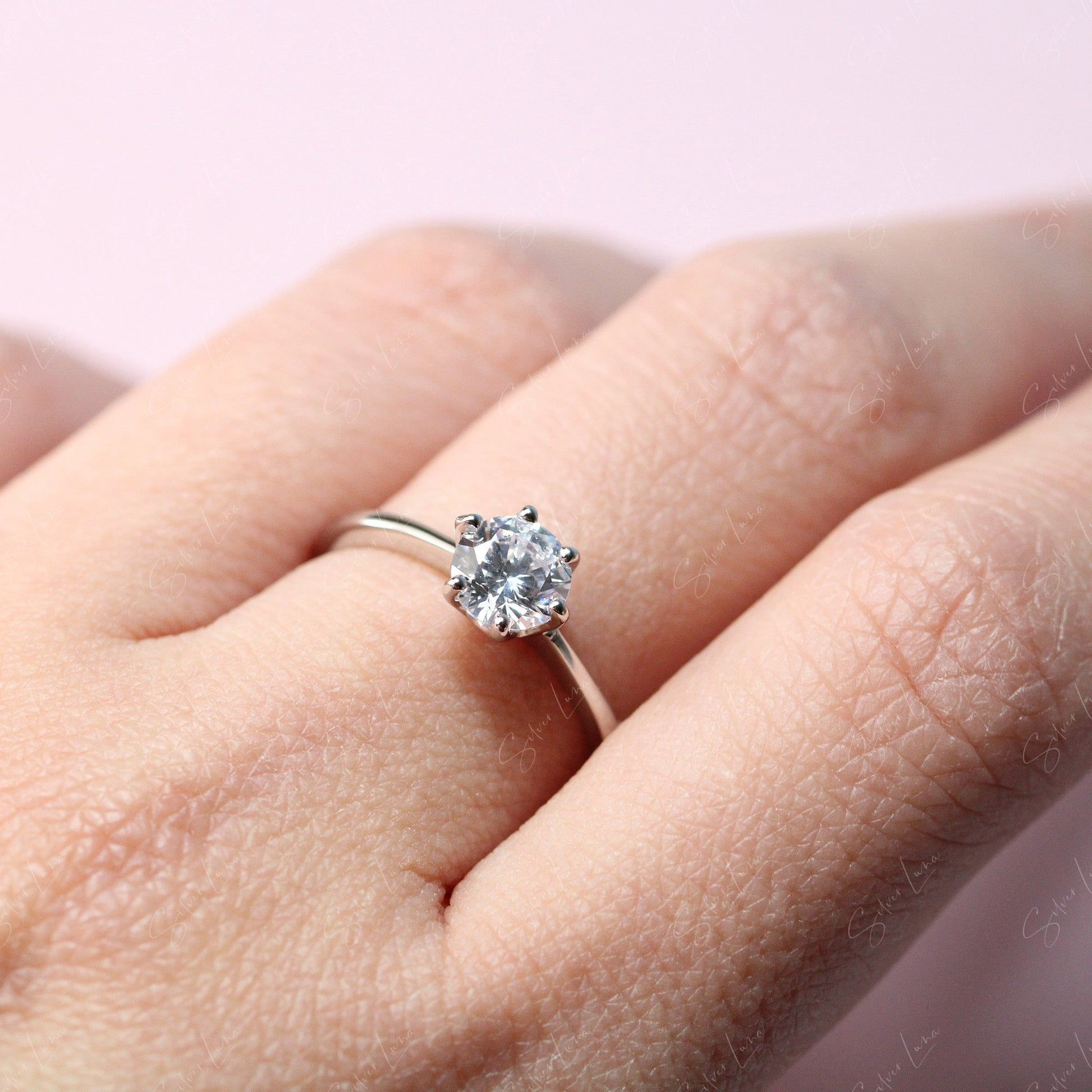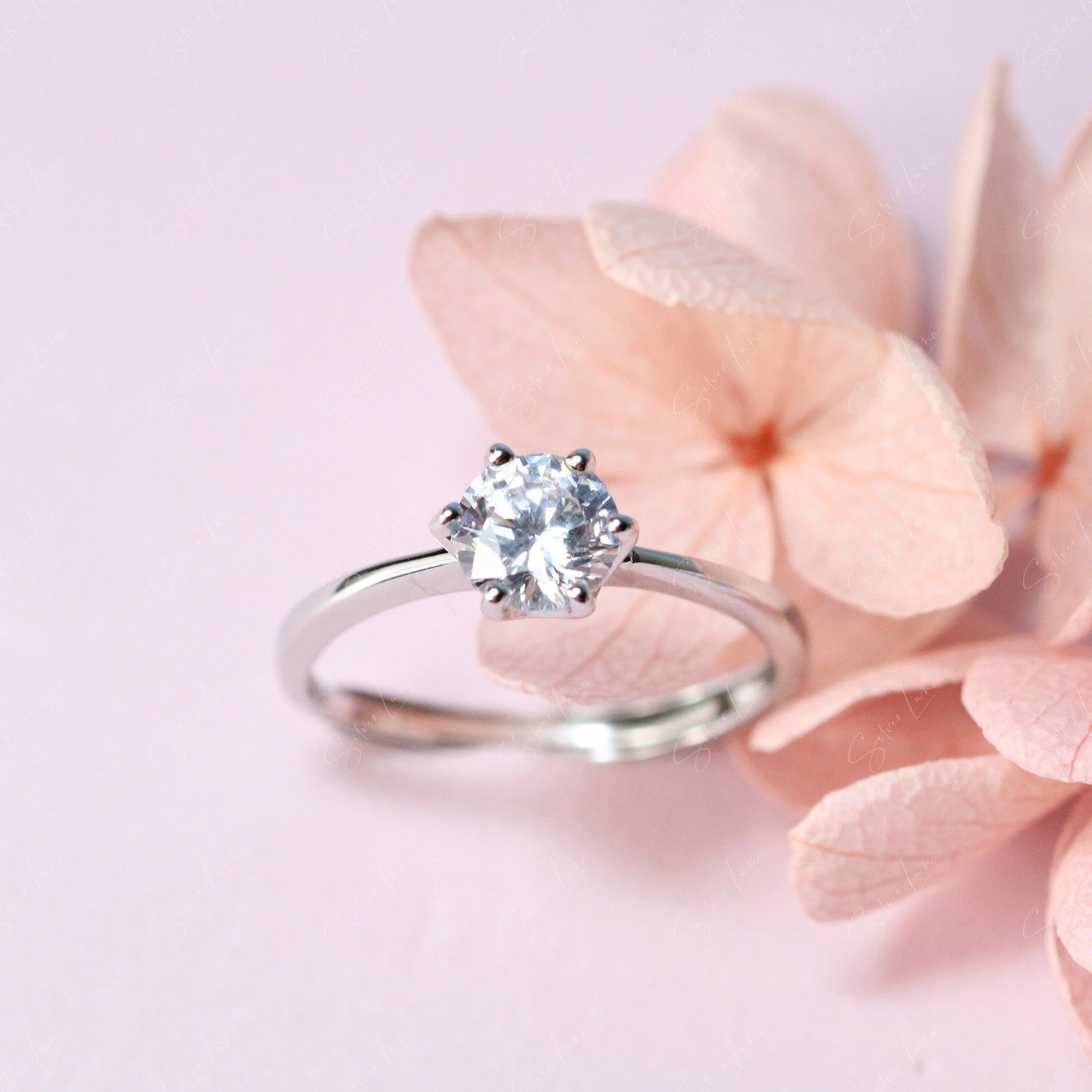 This stunning engagement ring boasts a 1.5 ct cubic zirconia gemstone on a solid 925 sterling silver band with platinum plating, giving it a luxurious and high-end appearance. The band is adjustable and can fit most finger sizes, making it a versatile choice for all.