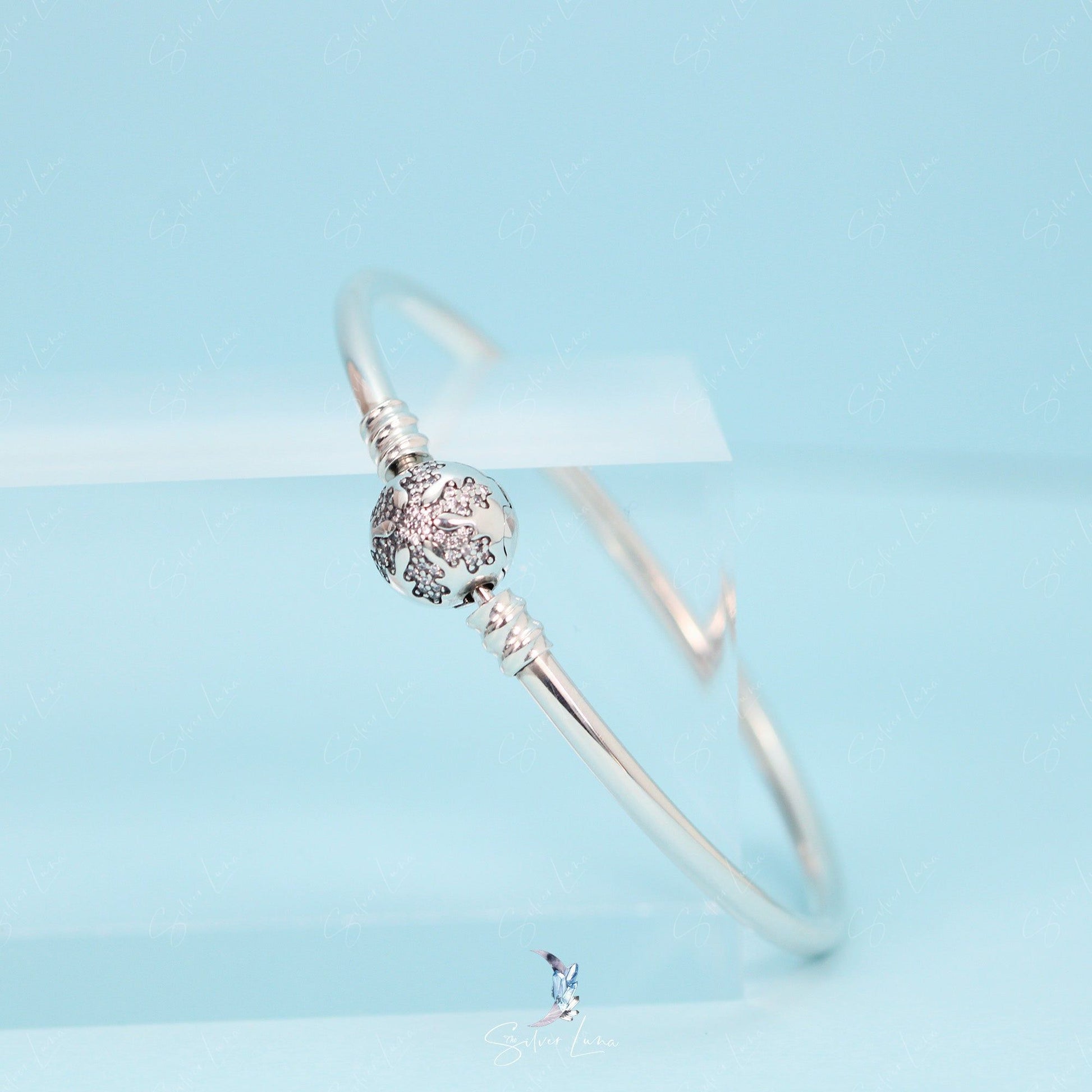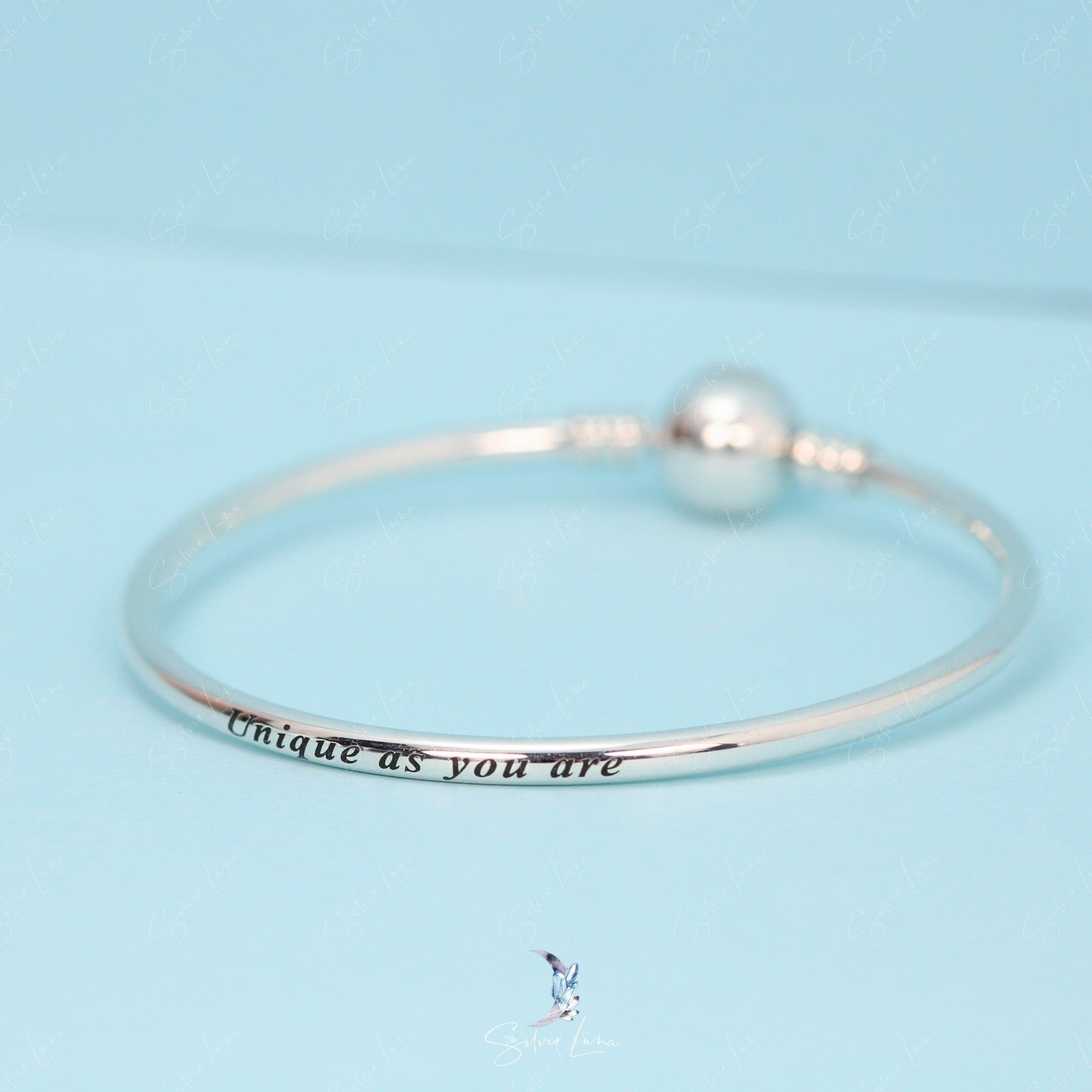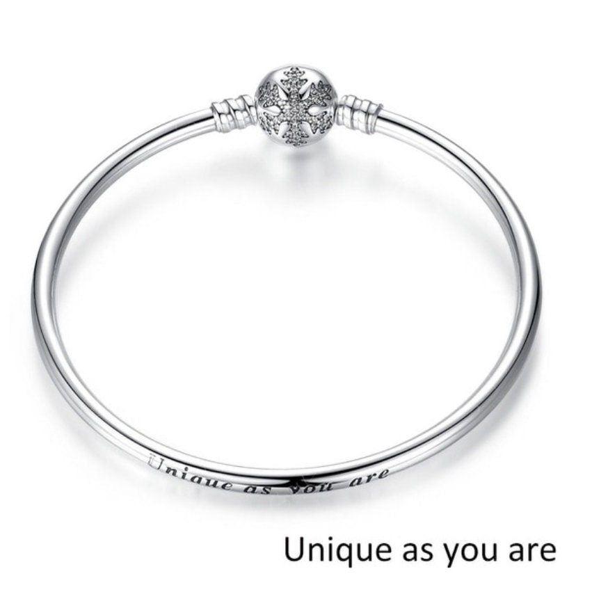 Indulge in the luxurious beauty of this solid 925 sterling silver bangle snowflake bracelet with a platinum plate, reminiscent of the iconic charm bracelet. The intricate snowflake clasp, adorned with sparkling cubic zirconia stones, adds a touch of elegance to the design. And with the inspiring phrase "Unique as you are" engraved on the bangle, it's the perfect gift for someone special. Personalize it with meaningful charms to create a one-of-a-kind bracelet that tells their unique story.