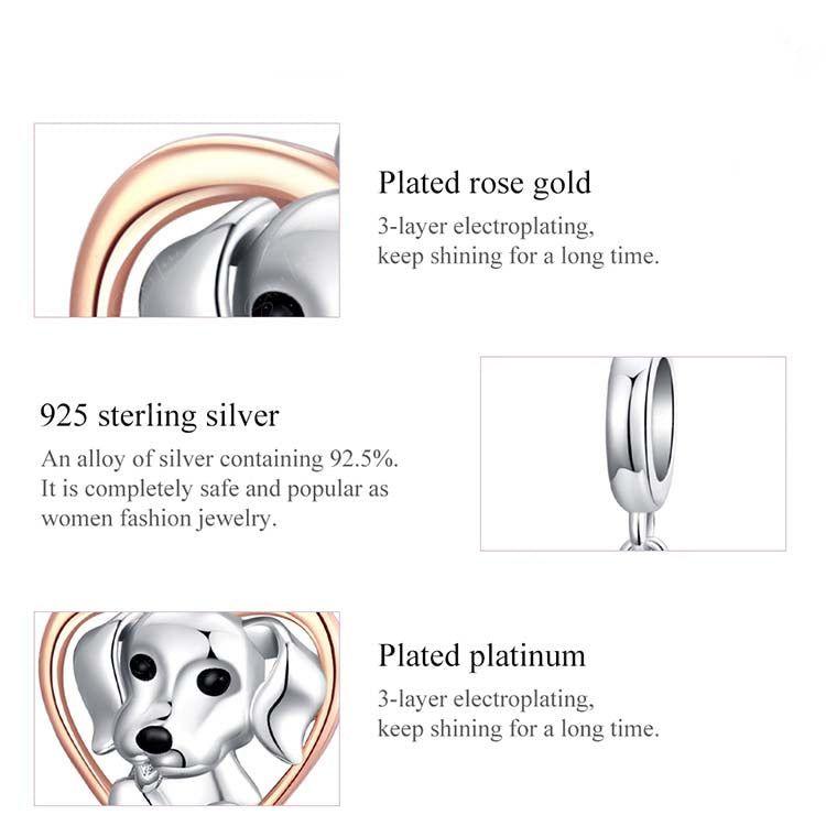 This stunning dog heart pendant charm for bracelets showcases a charming purple and rose gold heart, crafted from durable 925 sterling silver and coated in platinum. Add this adorable charm to your current bracelet or surprise a loved one with a thoughtful gift.