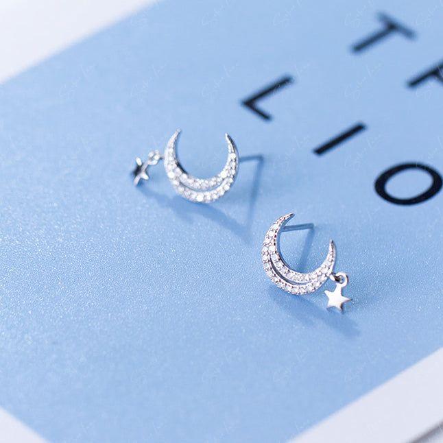 Indulge in the breathtaking beauty of these exquisite crescent moon stud earrings, accompanied by a delicate dangling star. Made of premium 925 sterling silver and adorned with sparkling cubic zirconia, these earrings exude a luxurious charm with platinum plating. A must-have addition to your fine jewelry collection or a perfect gift for a special someone.