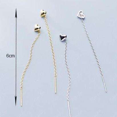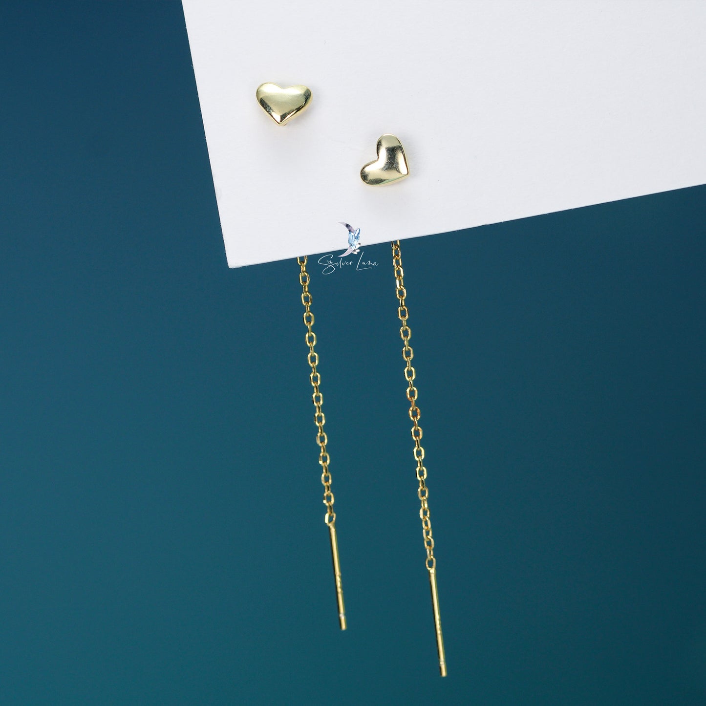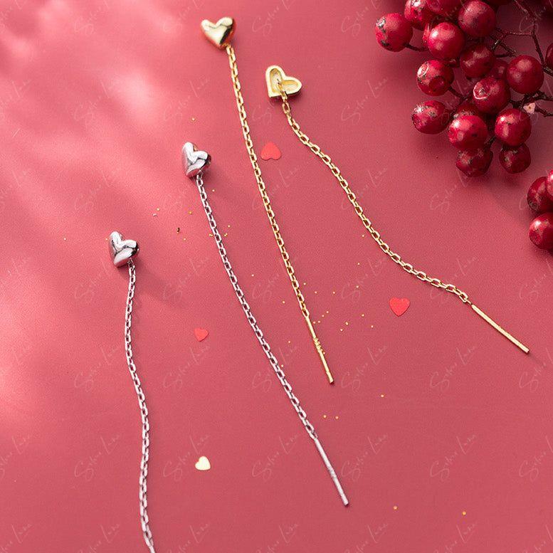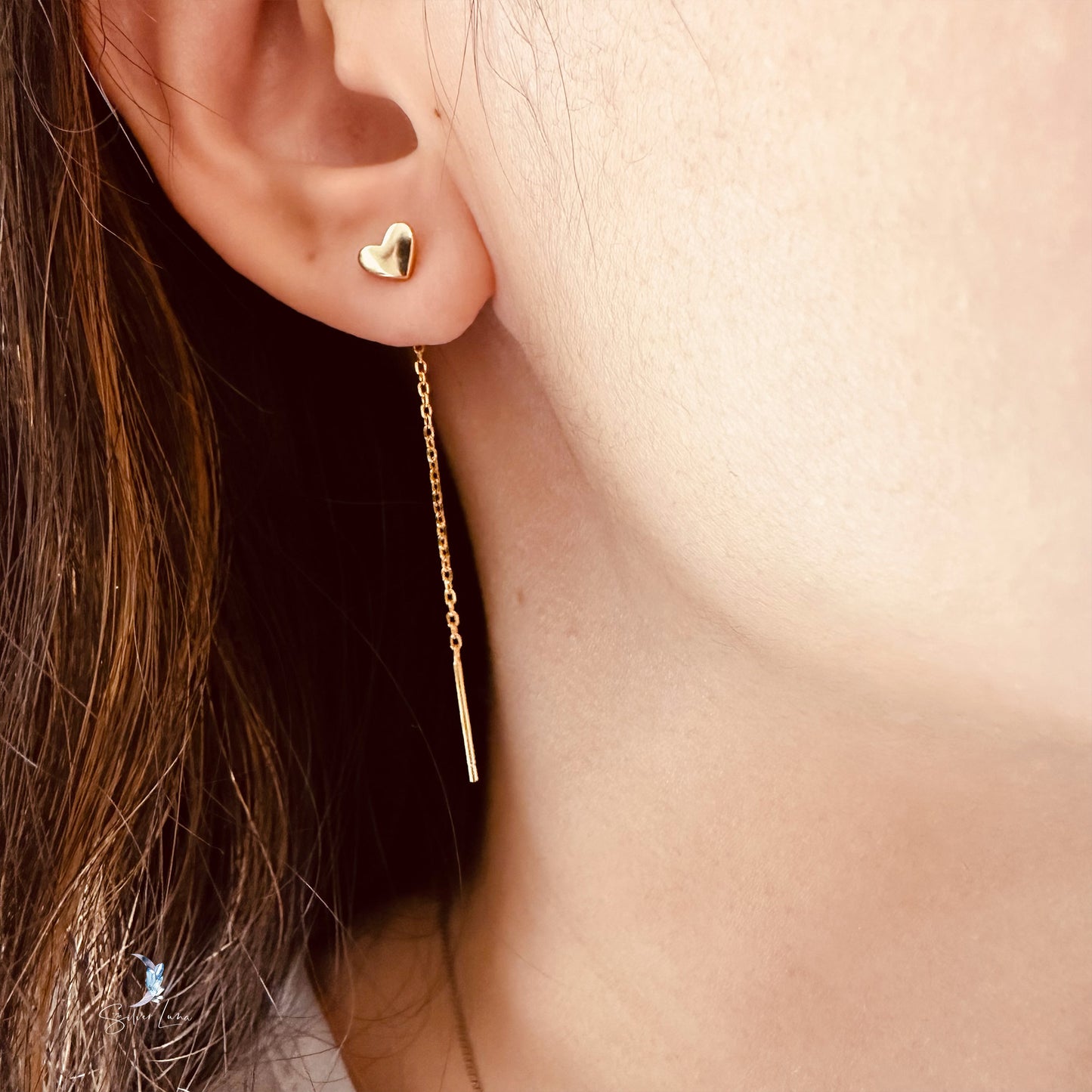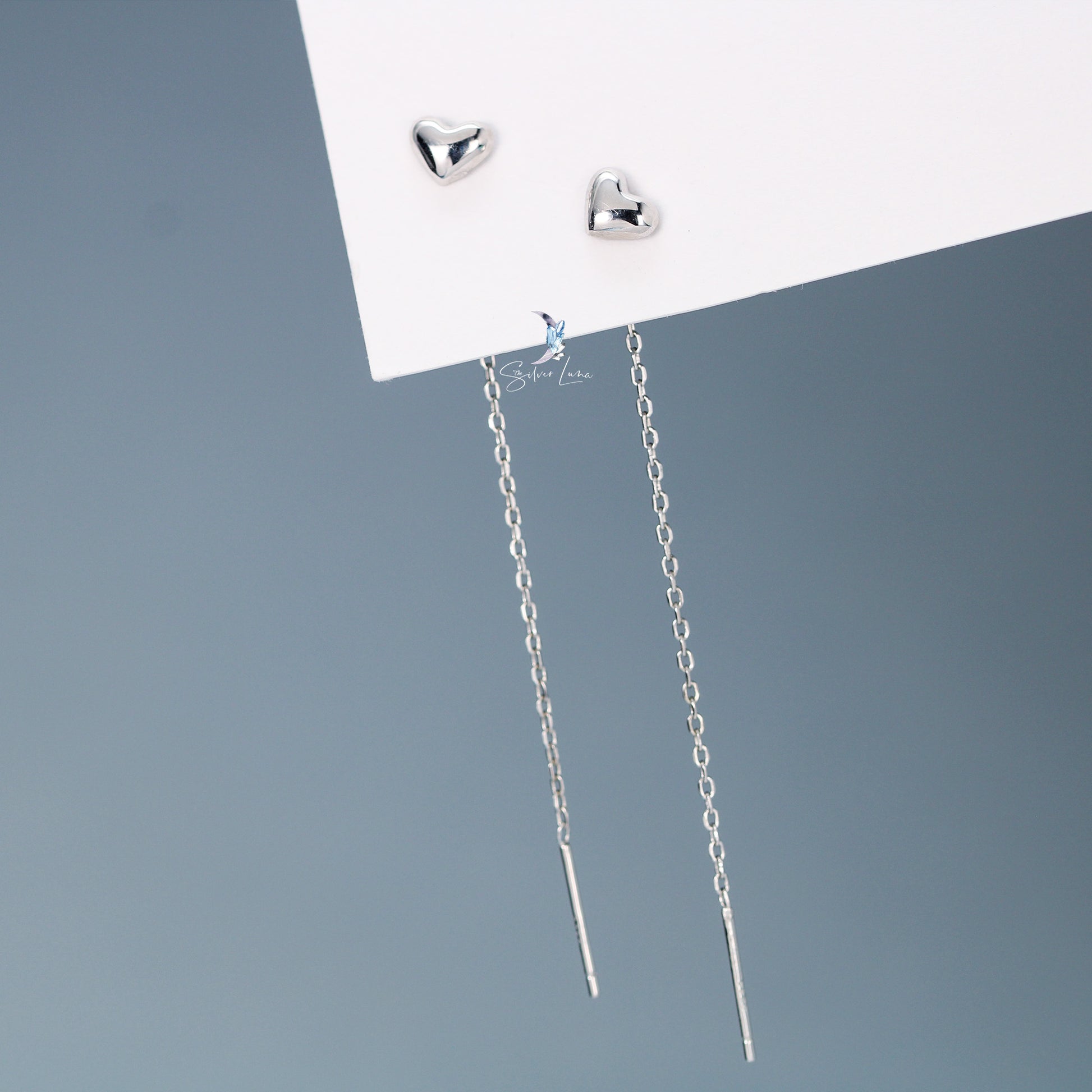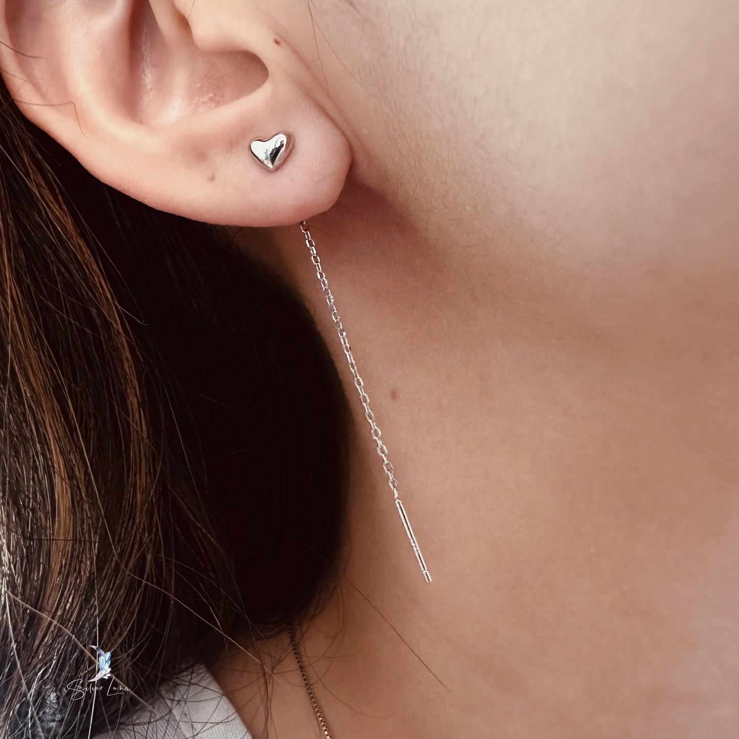 Indulge in a touch of simplicity with these elegant Dainty Heart Threader Earrings, available in silver and rose gold. Made with solid 925 sterling silver and a platinum/gold plate, these earrings feature a delicate heart head and a long thread chain for a stylish and comfortable look. Add them to your everyday collection or gift them to a loved one!
