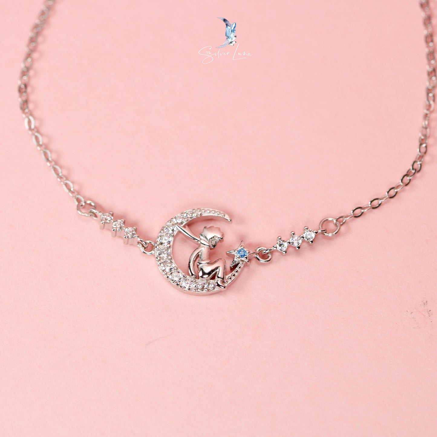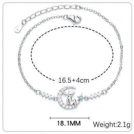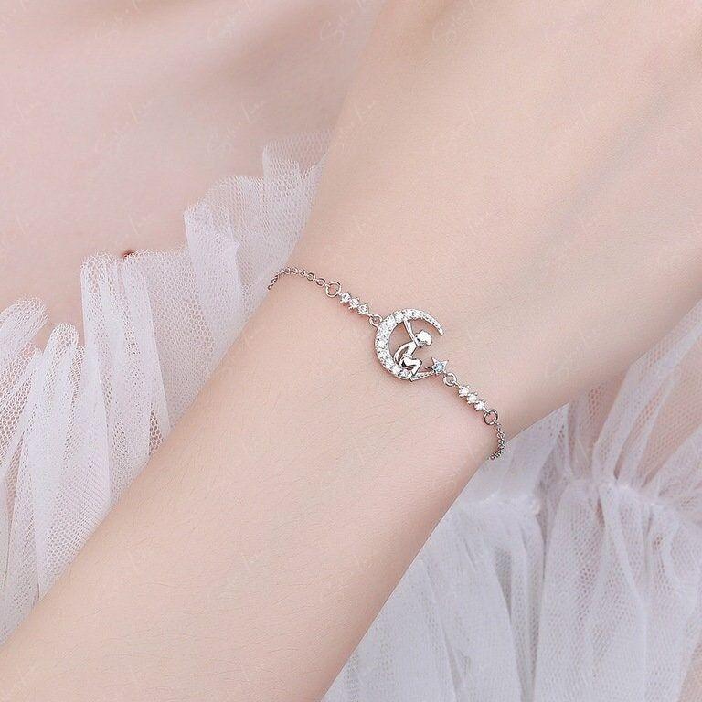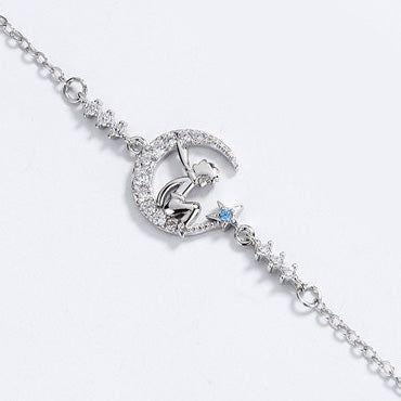 This beautiful sterling silver bracelet showcases a fairy resting on a crescent moon charm, crafted with 925 silver and embellished with sparkling cubic zirconia accents. With its platinum plating, this piece exudes a luxurious sheen that will last. Embrace this enchanting crescent moon fairy bracelet as a stunning addition to your daily jewelry rotation, or gift it to someone special.