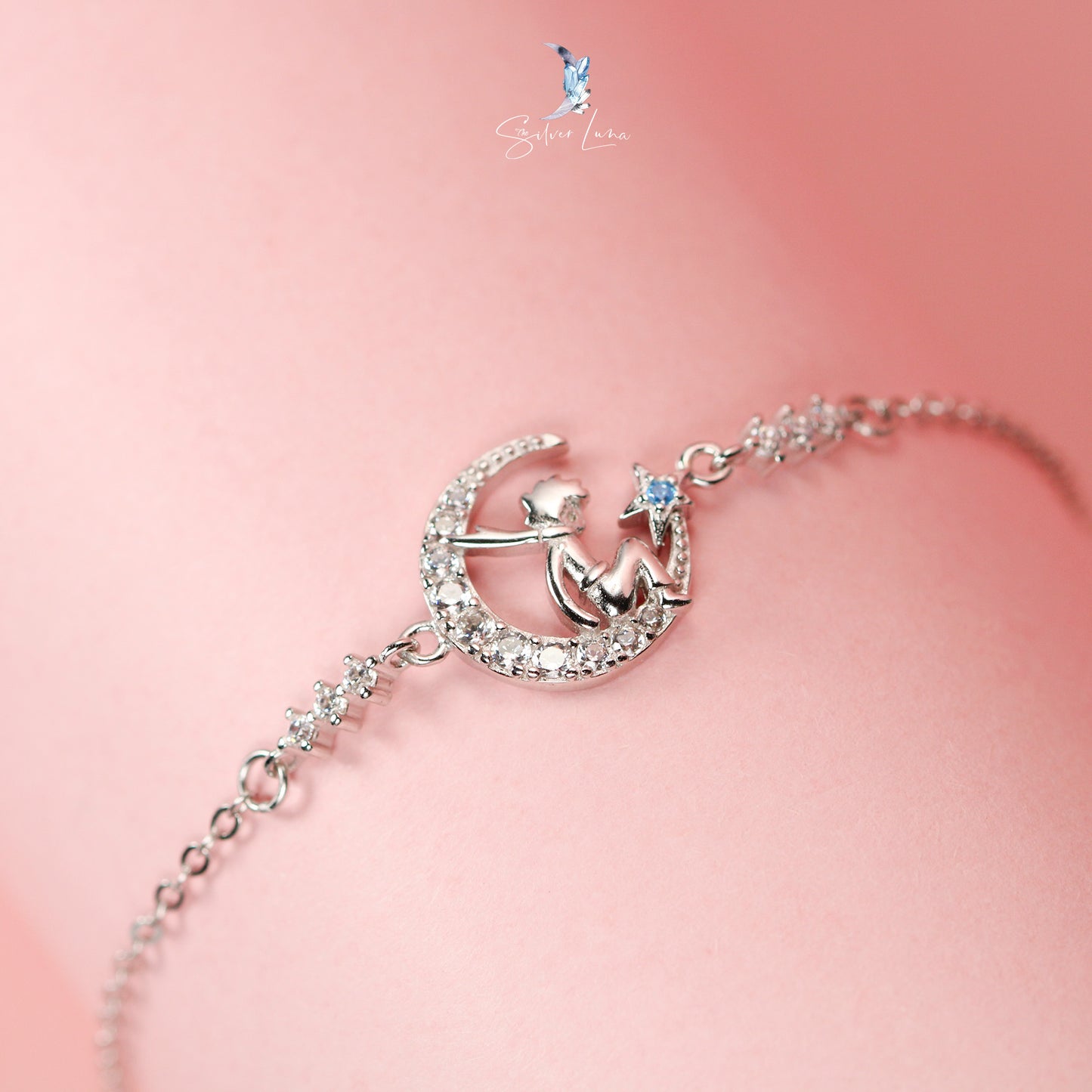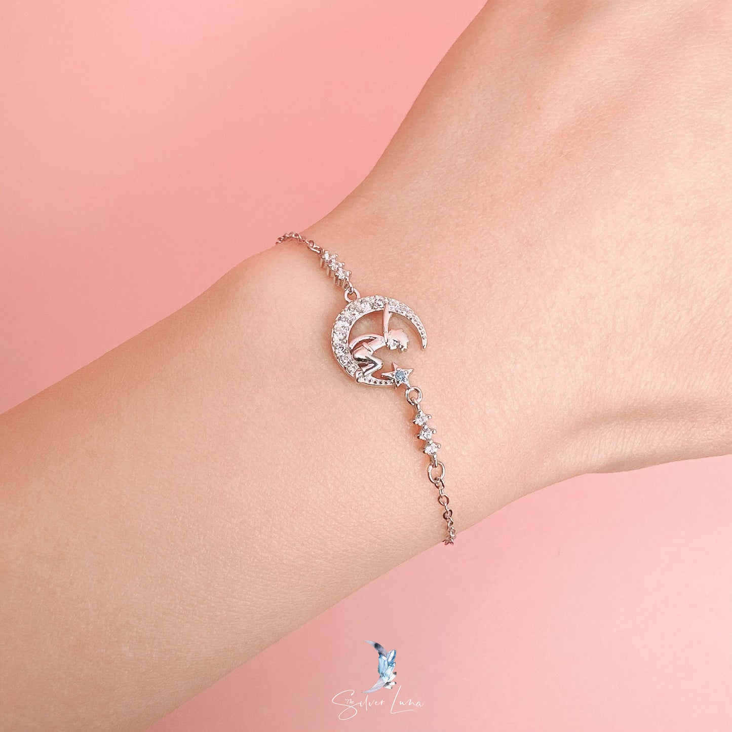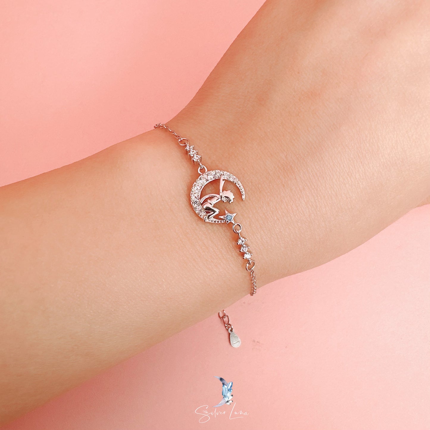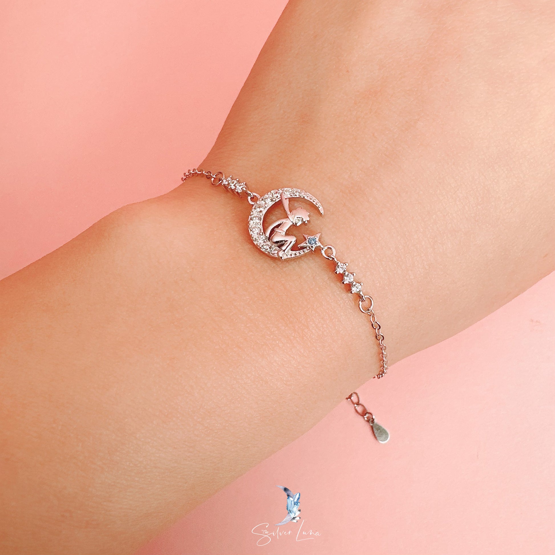 A fairy on crescent moon sterling silver bracelet
