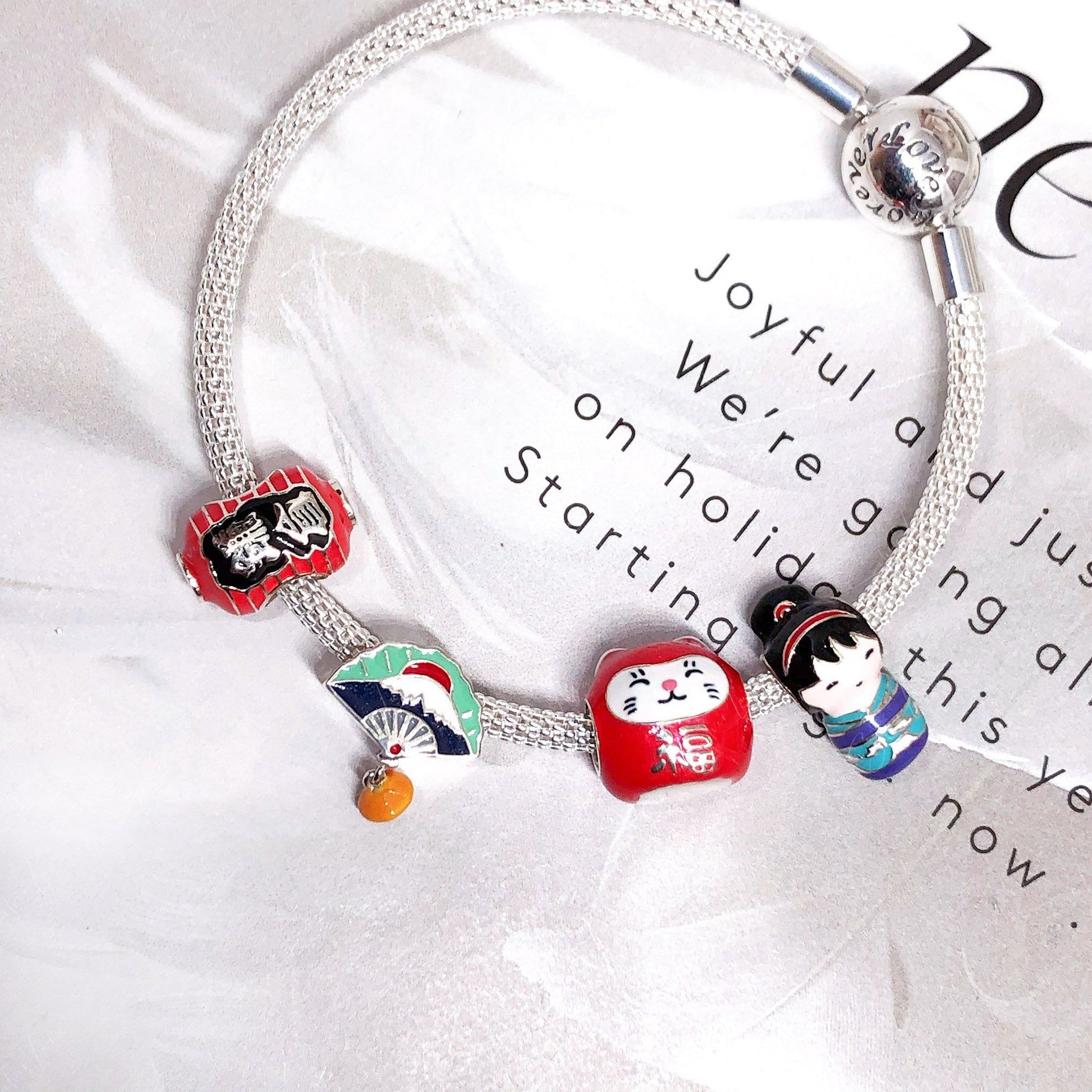 Add a touch of Japanese culture to your charm bracelet with these adorable sterling silver enamel charms. Featuring traditional motifs such as a kimono girl, Fuji mountain fan, lucky cat, and red lantern, these miniature objects are intricately detailed and sure to inspire a love for Japanese culture.
