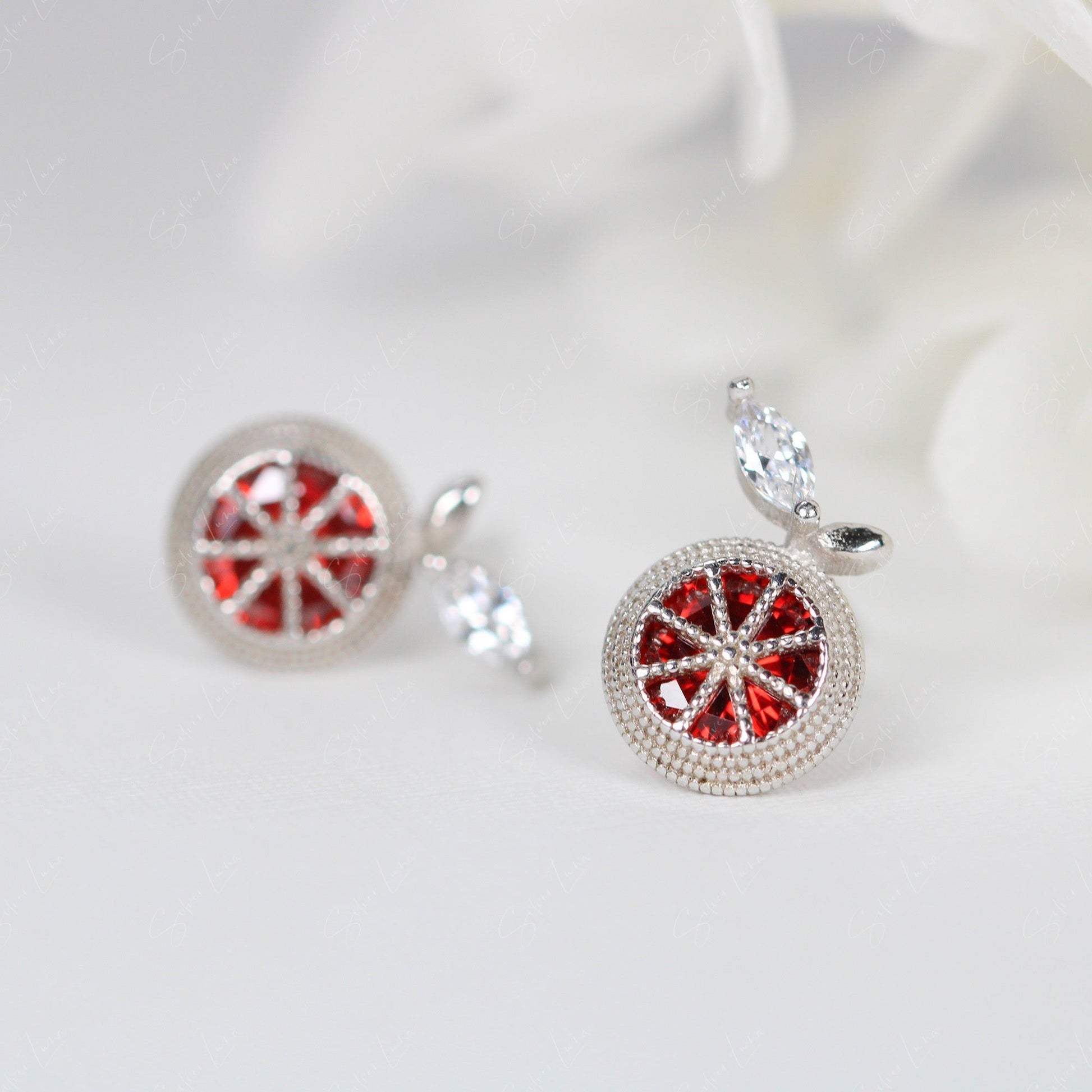 These gorgeous pomegranate stud earrings are delicate, dainty, and adorable - perfect for anyone who values simple, everyday beauty. Their design reflects everyday objects and will add a touch of charm to any outfit. Add a pop of color and sparkle to your wardrobe with these stunning pomegranate stud earrings! Their intricate design, inspired by everyday objects, adds a unique and charming touch to any outfit, making them a must-have for those who appreciate simple, everyday beauty. With delicate and dainty details, these earrings are perfect for adding a touch of elegance and beauty to your everyday look.