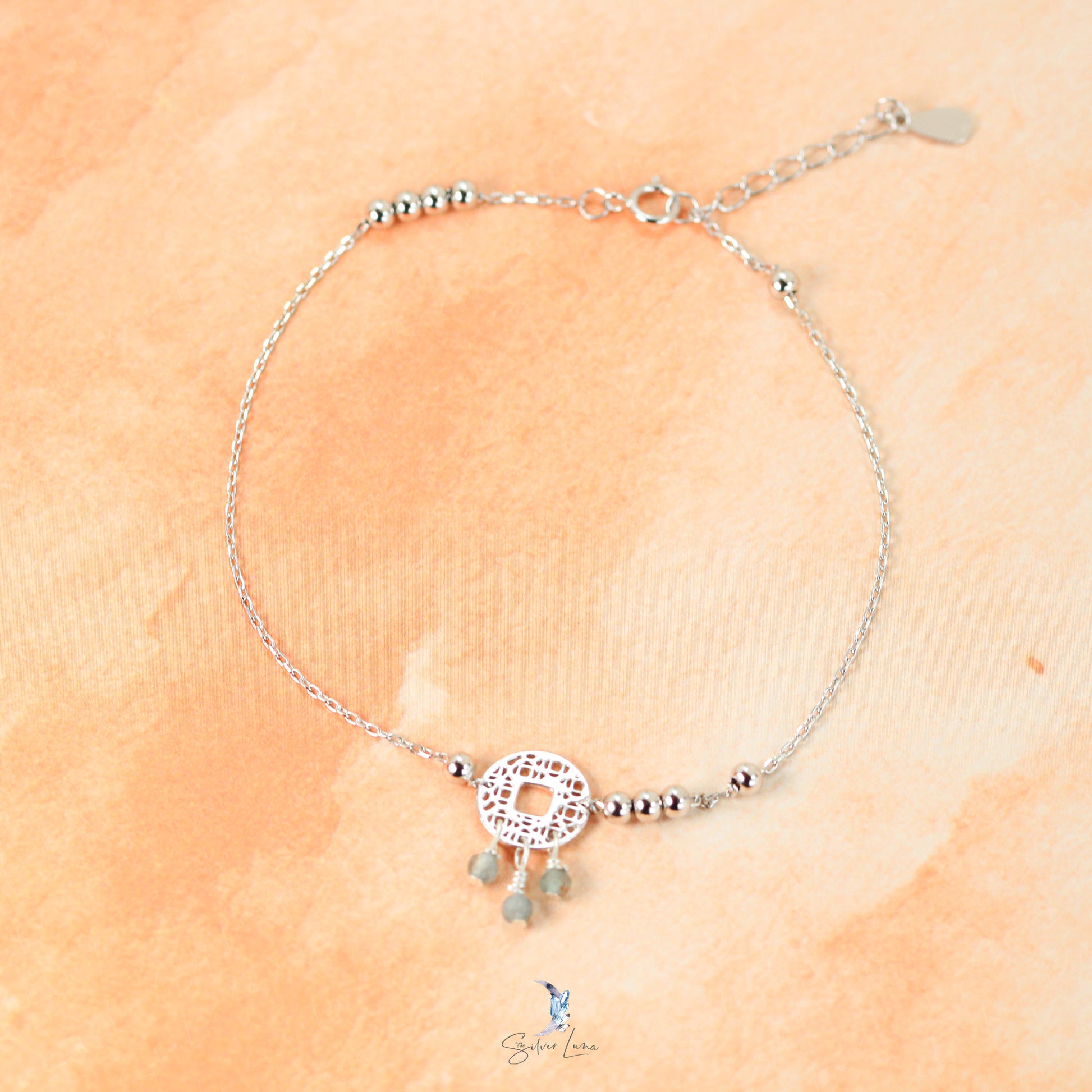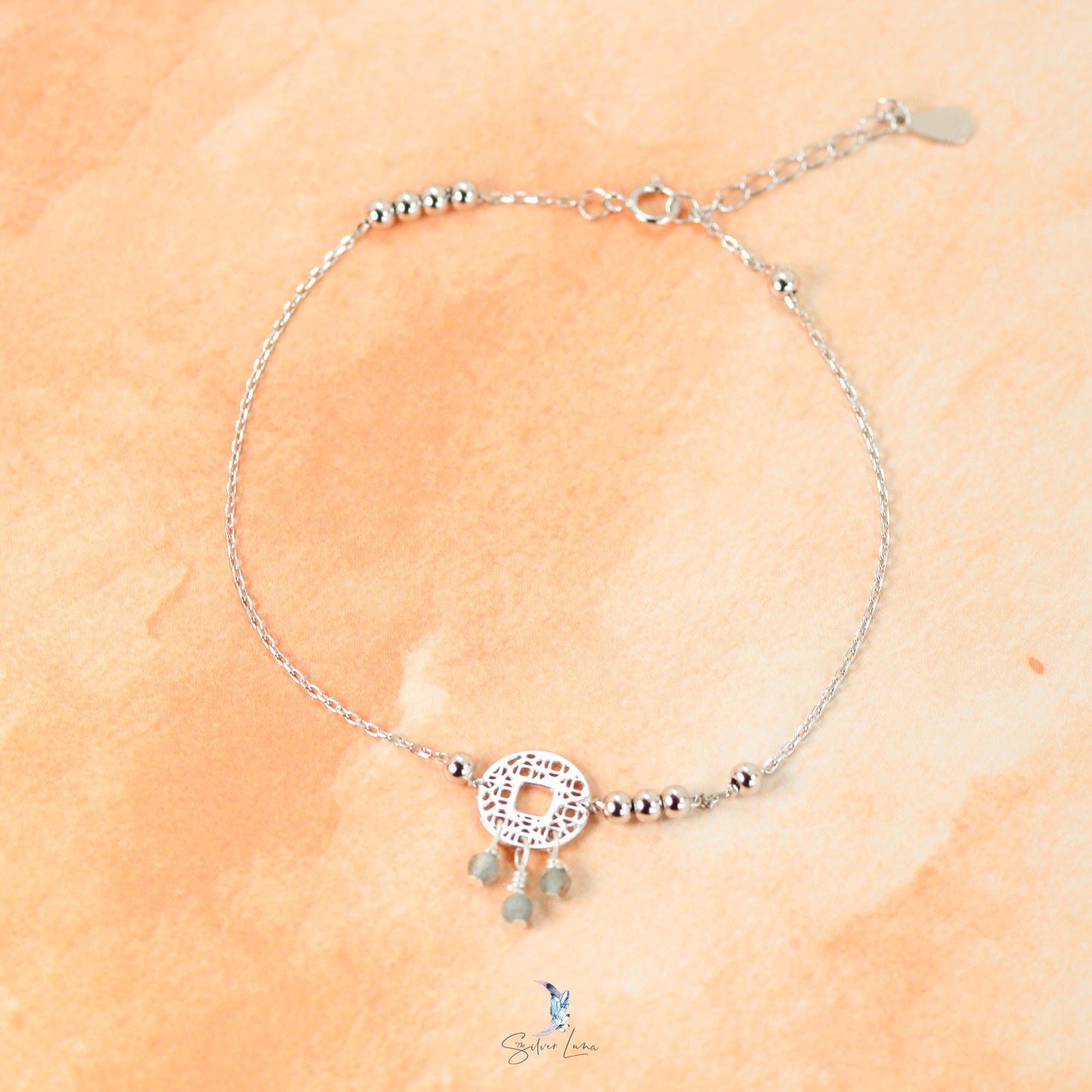This bohemian lucky coin charm anklet is made of solid 925 sterling silver and platinum plating, features a lucky coin money and ball charms on cable chain. Add this boho lucky money ankle bracelet to your everyday fine jewelry collection or as gift for your love one.