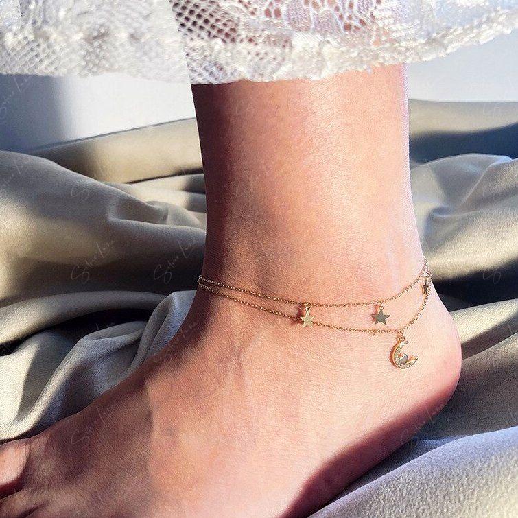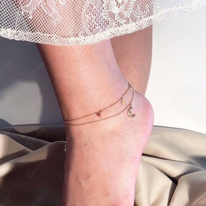 Double layer moon and star charms ankle bracelet in solid 925 sterling silver and 14k gold plated. Add this cute dazzling celestial moon and star anklet to your everyday fine jewelry collection or as gift for your love one.