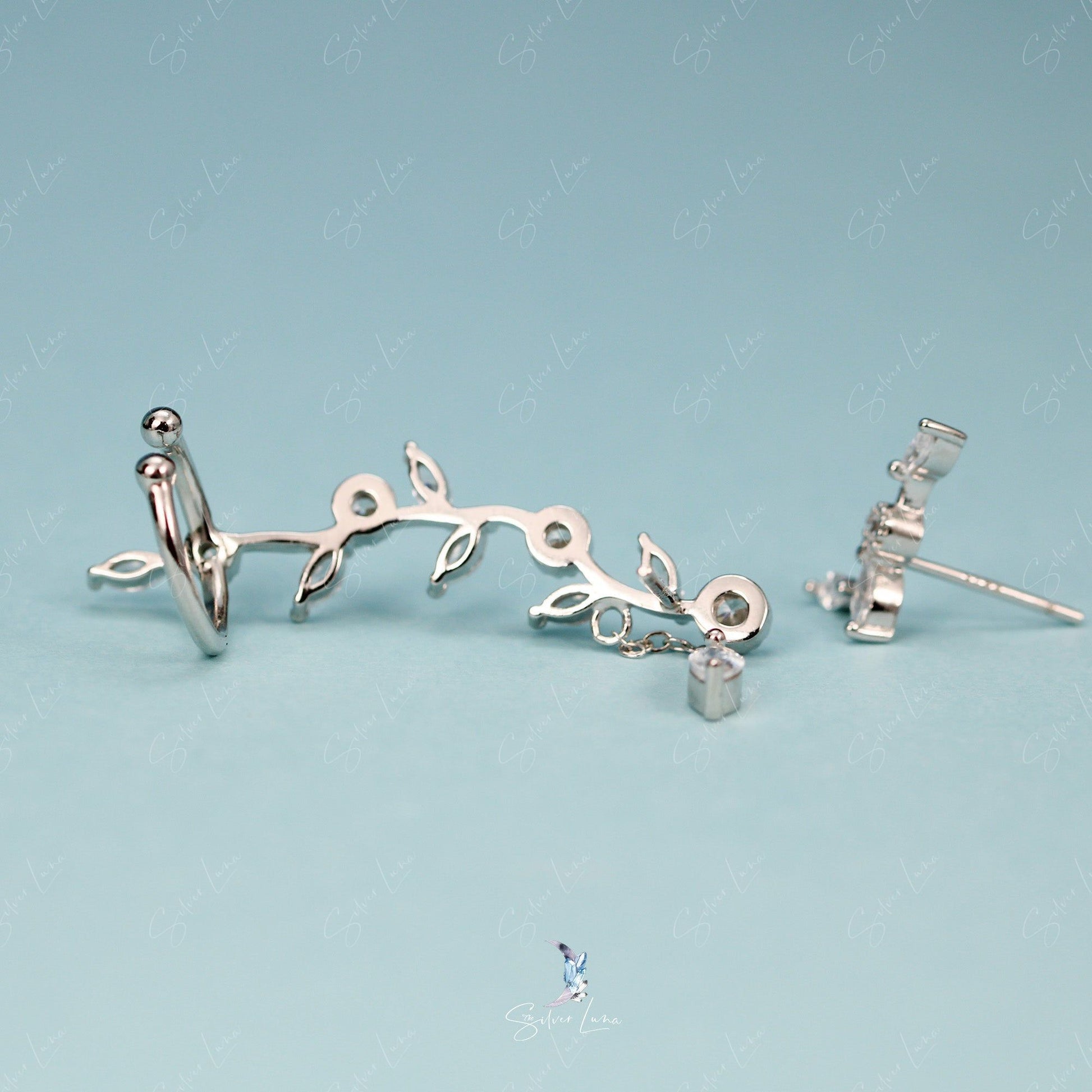 Elevate your style with these stunning asymmetric flower branch stud earrings and ear cuff. One earring boasts a long, elegant floral branch with a delicate tear drop dangle, while the other is a simple stud earring. Crafted from solid 925 sterling silver with platinum plating and adorned with sparkling cubic zirconia stones, these earrings exude both luxury and sophistication. Don't miss out on adding this unique pair to your collection!