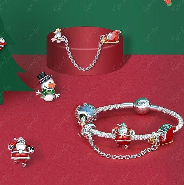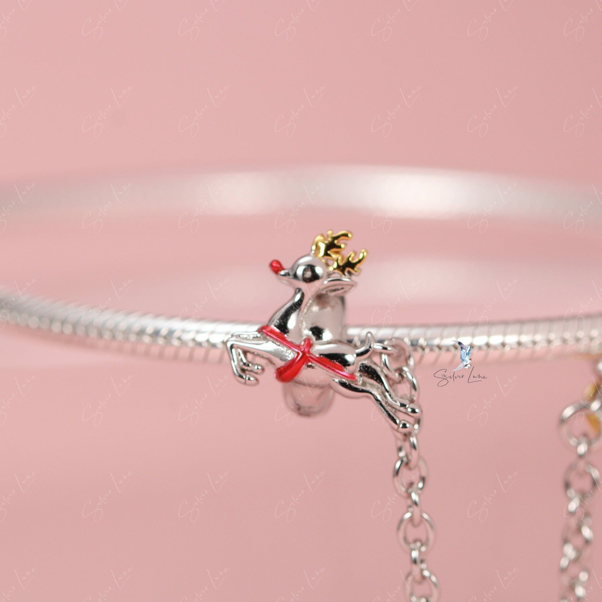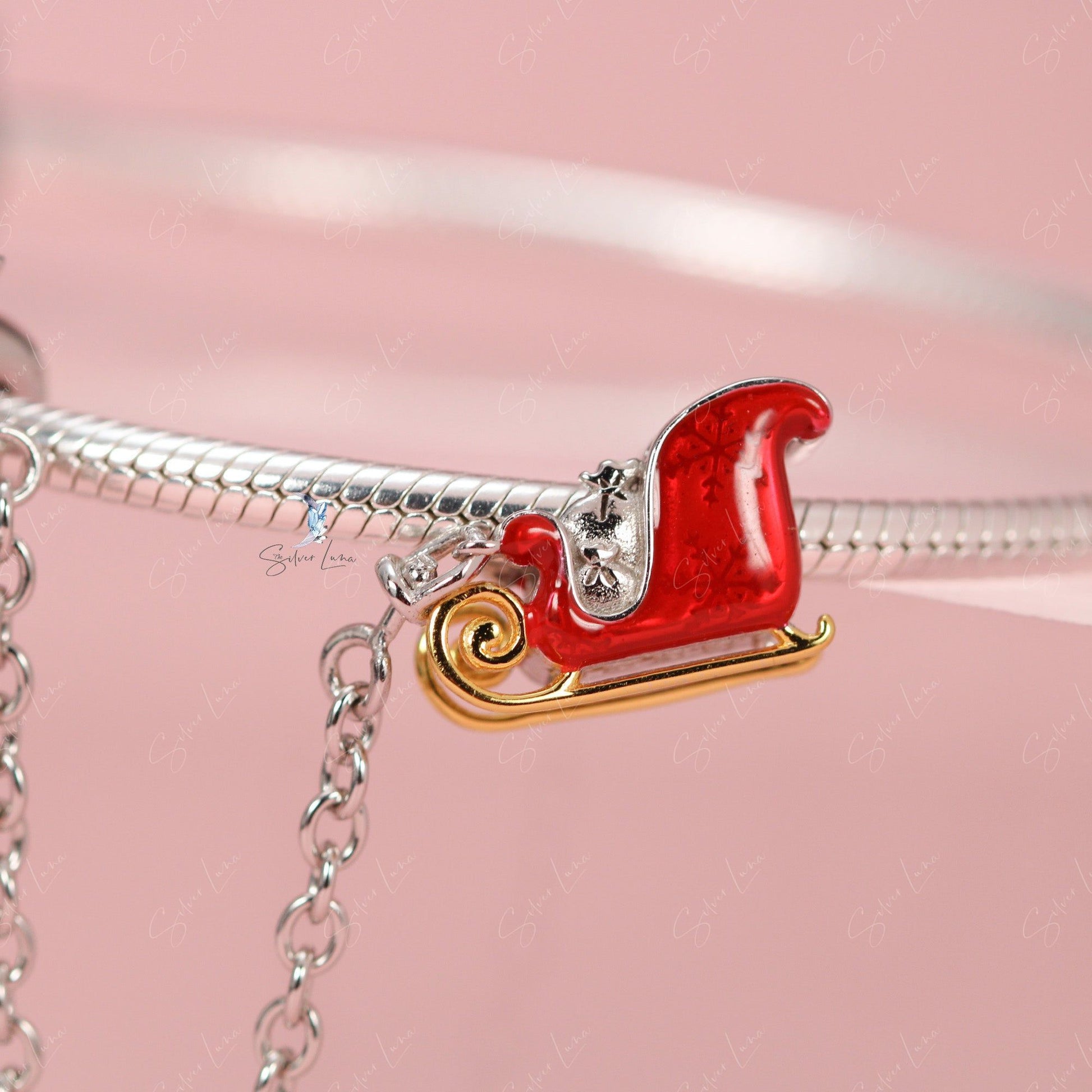 A Santa Claus sleigh full of surprised gifts is on the way to your home this Holiday season. This security chain for bracelet features a reindeer pulling Santa Claus's gift sleigh, made of solid 925 sterling silver with platinum plating and enamel color. Get ready to add some holiday magic to your wardrobe! Now you can wear Santa's iconic sleigh and reindeer wherever you go with our beautifully crafted sterling silver bracelet chain. A perfect gift for yourself or a loved one this holiday season.