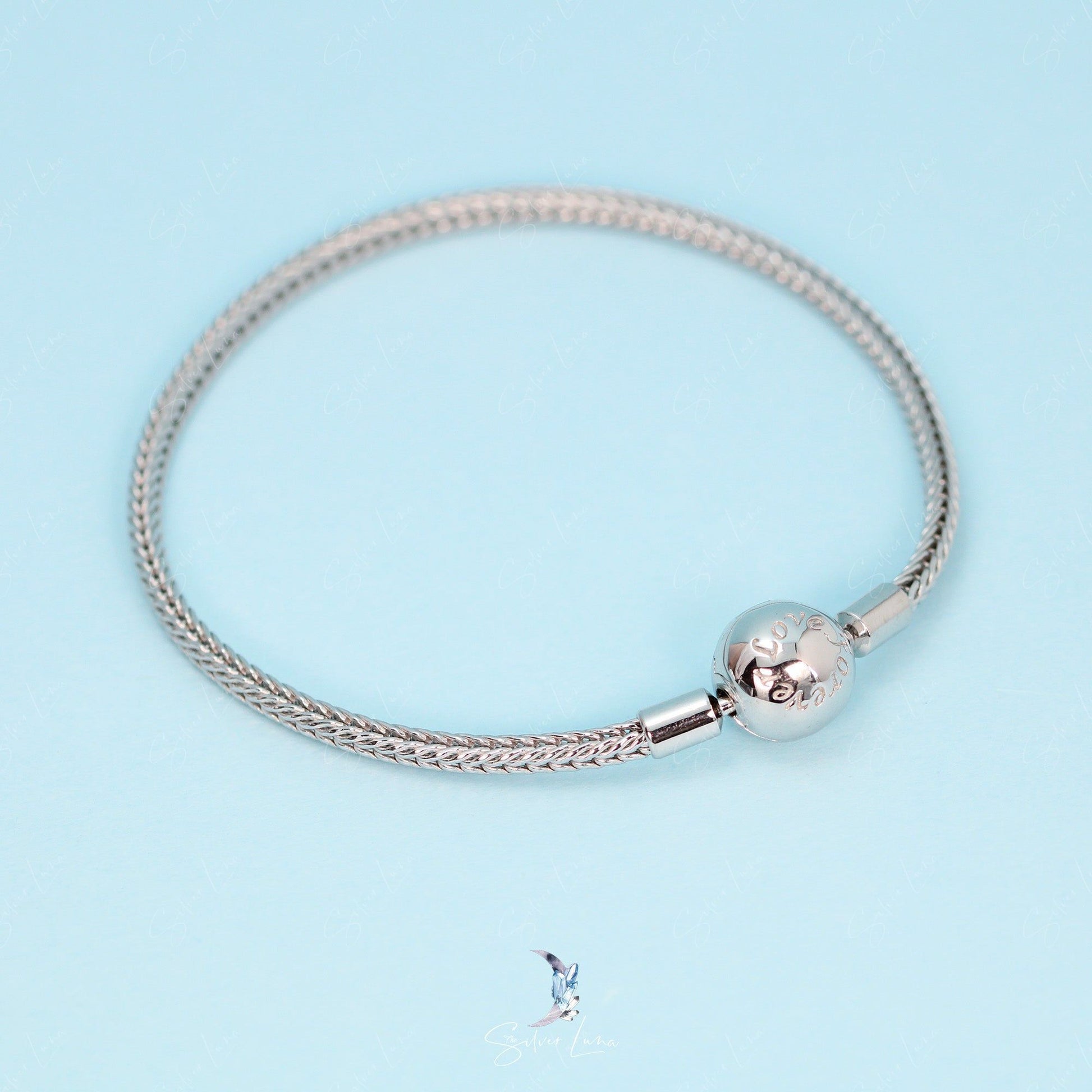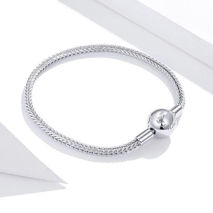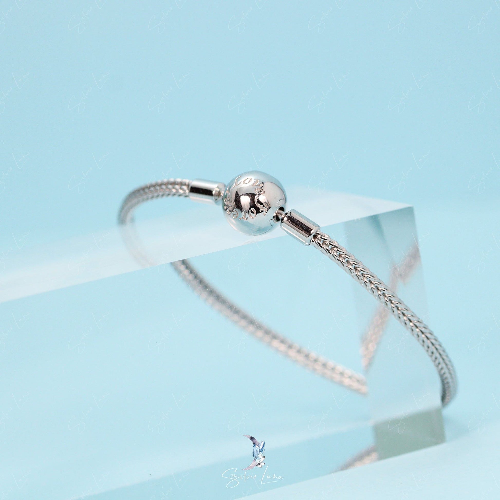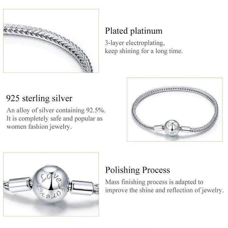 This sterling silver charm bracelet is made with a solid 925 silver base and a platinum plating process to maintain its shine over time. Its soft and flexible chain is perfect for large hole charms, enhancing their shine with its unique texture.