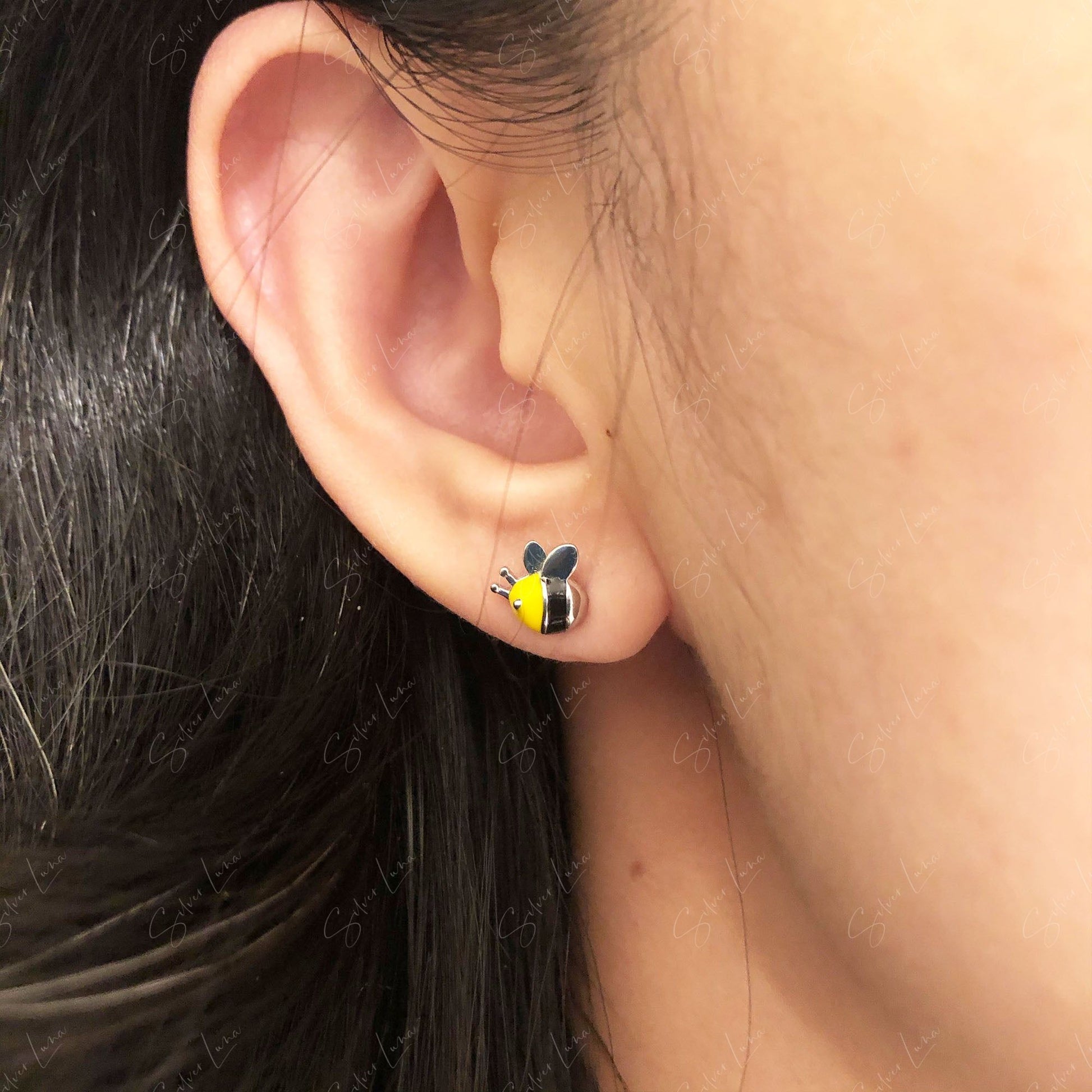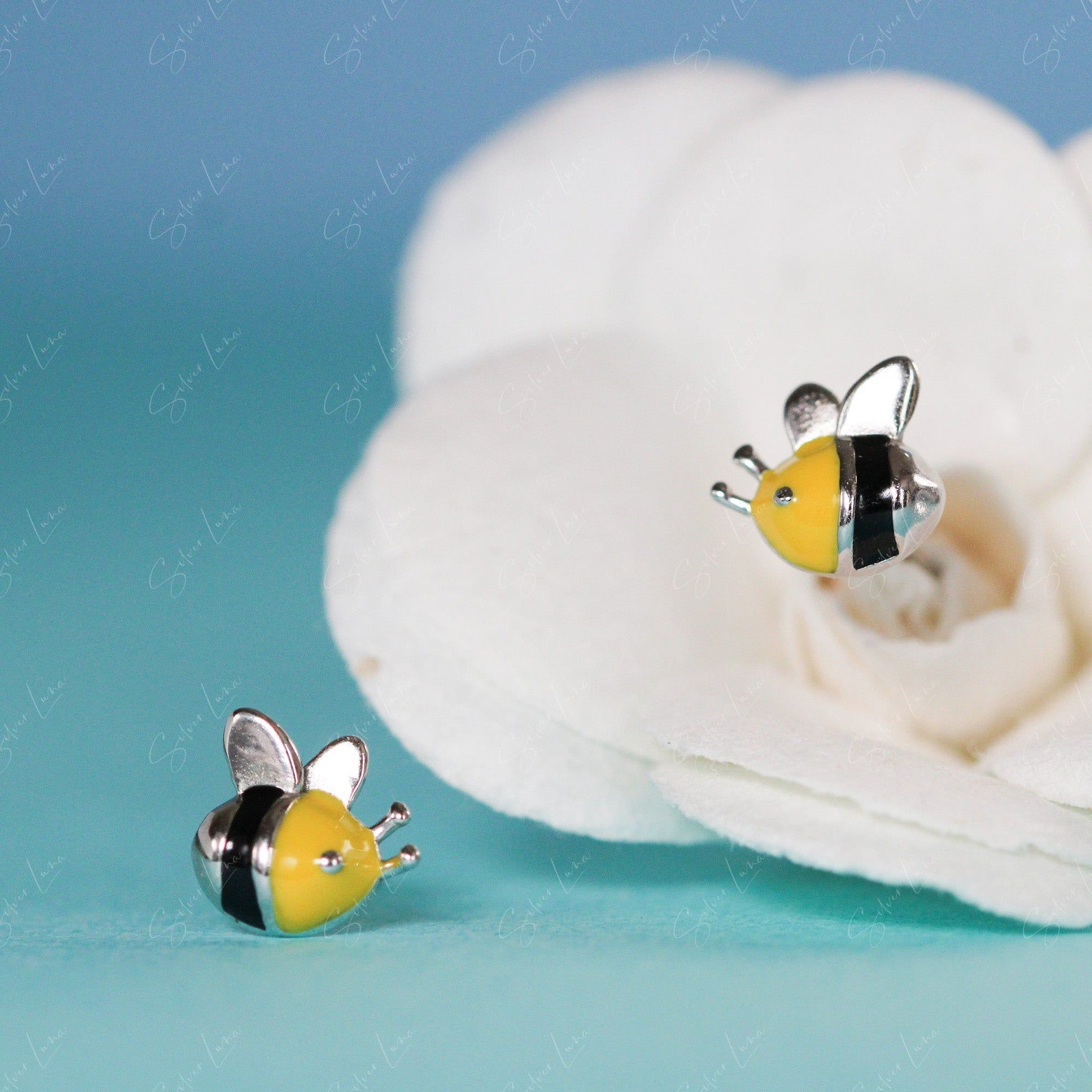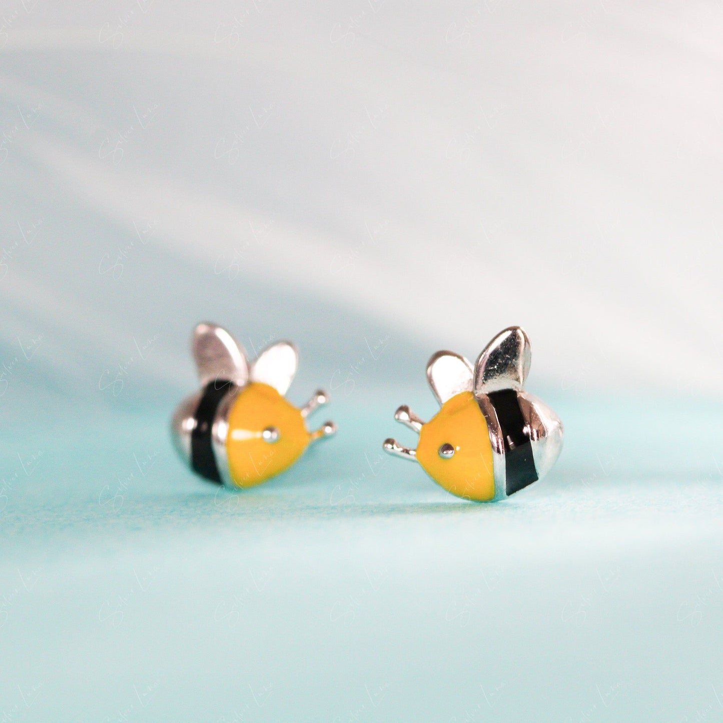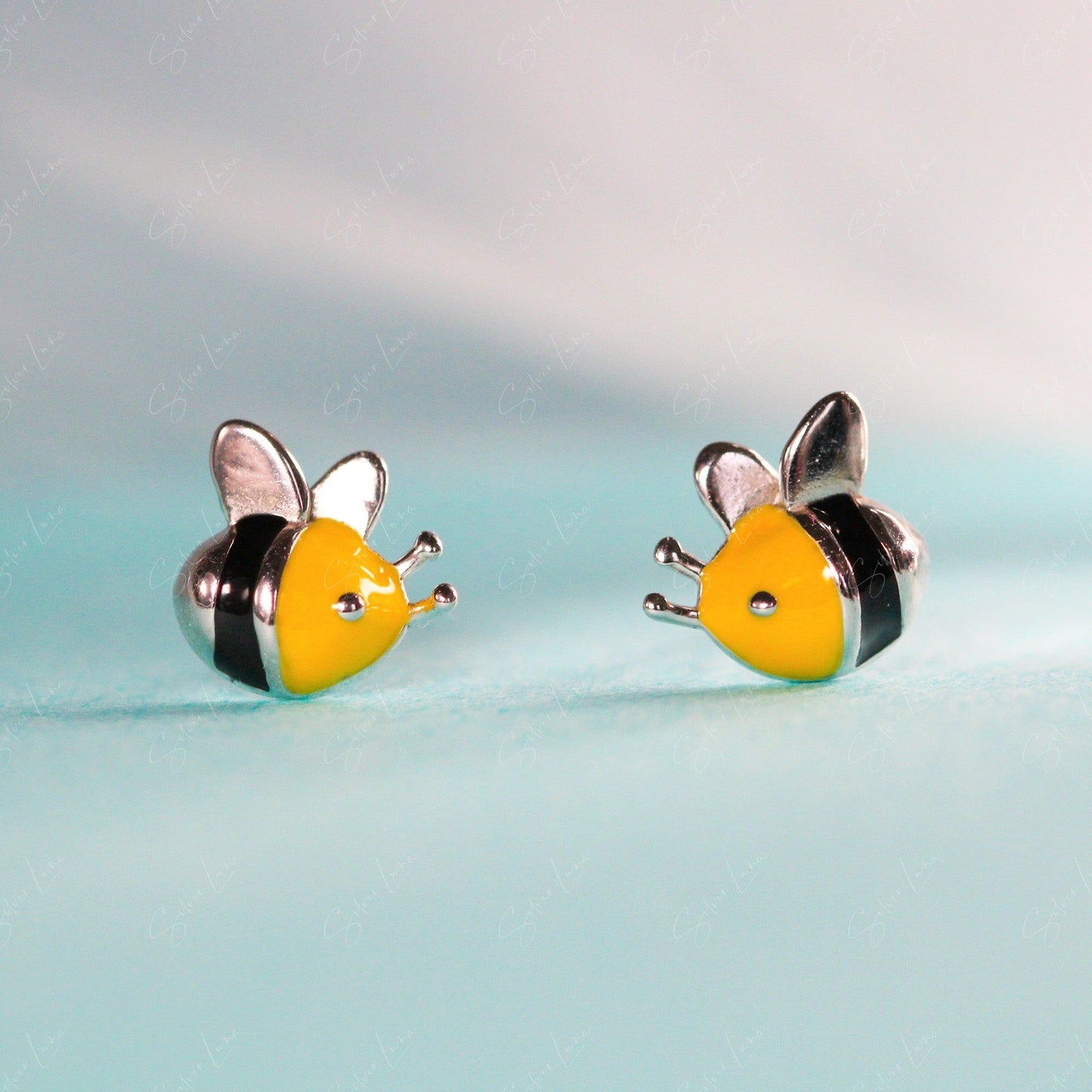 Elevate your everyday look with our Enamel Silver Honey Bees Stud Earrings. Made from solid 925 sterling silver, these dainty and minimalist earrings feature a cute honey bee design with enamel decoration. Perfect for gifting or adding to your own collection. Order now and enjoy the subtle beauty of these stud earrings.