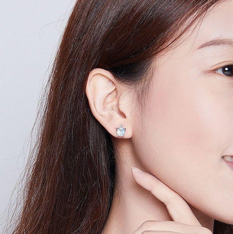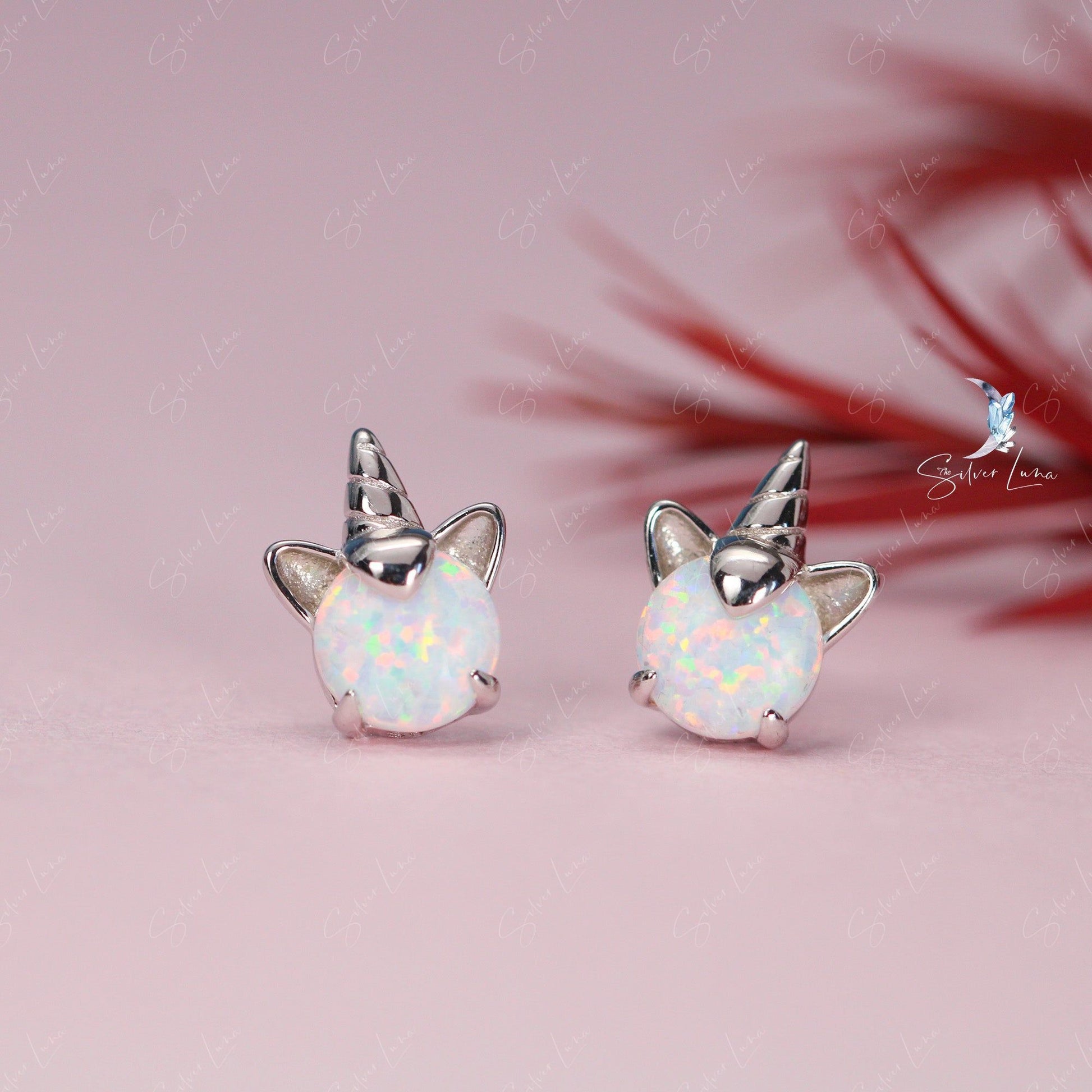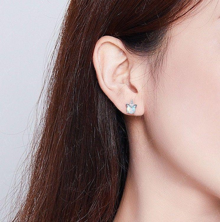These cute, dainty, unicorn stud earrings features rainbow opal stone, in unicorn silhuoette shape. The unicorn stud earrings are made of solid 925 sterling silver with platinum plating that will keep them shine for a long time. Add these cute, dainty opal stone stud earrings to your everyday fine jewelry collection or as gift for your love one. Magical, elegant and timeless, these unicorn opal stone stud earrings are made from high quality materials and plated with platinum for long lasting shine. Add a touch of whimsy to your jewelry collection or give a special someone a heartfelt gift.