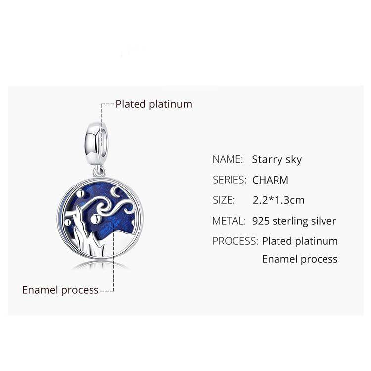 Experience the allure of Van Gogh's iconic "Starry Night" every day with this exquisite dangle charm. Featuring a stunning blue sky and a silhouette landscape design, this charm is the perfect addition to any bracelet or gift for a loved one. Don't miss out on the chance to own this unique piece inspired by one of the most famous paintings in the world!