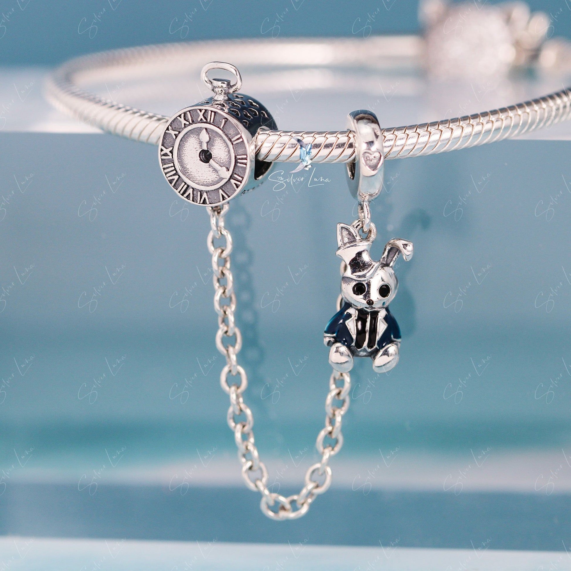 Add this beautifully detailed security chain to your jewelry collection! Featuring the lovable White Rabbit from Alice in Wonderland, this solid 925 sterling silver chain is plated with enamel color and platinum for a stunning finish. A must-have for any fan of the classic fairy tale, this charm bracelet security chain makes a perfect gift for a loved one or a charming addition to your charm bracelet.
