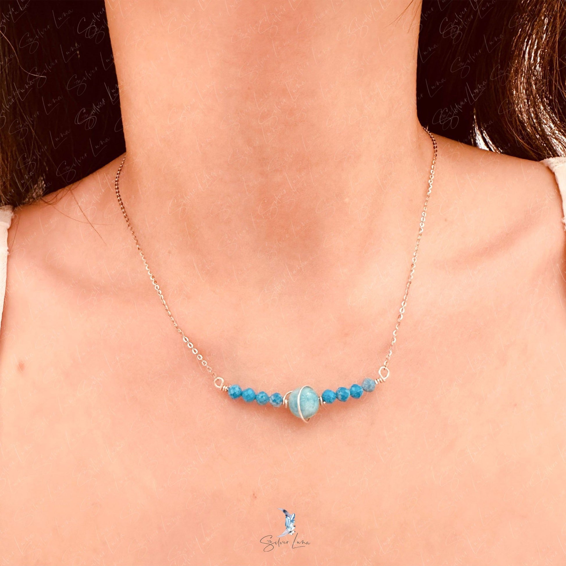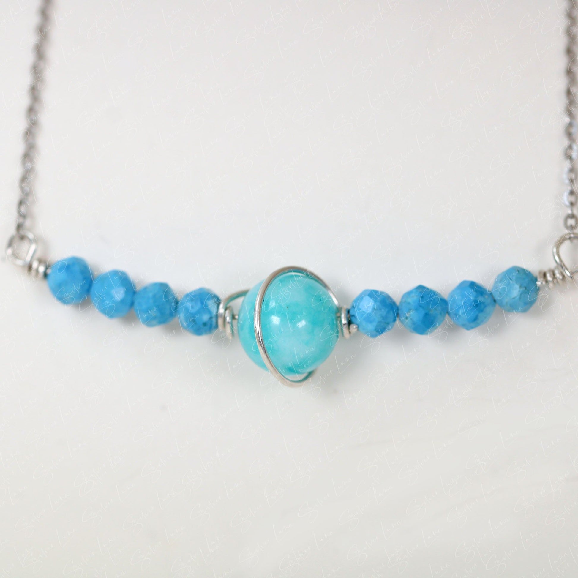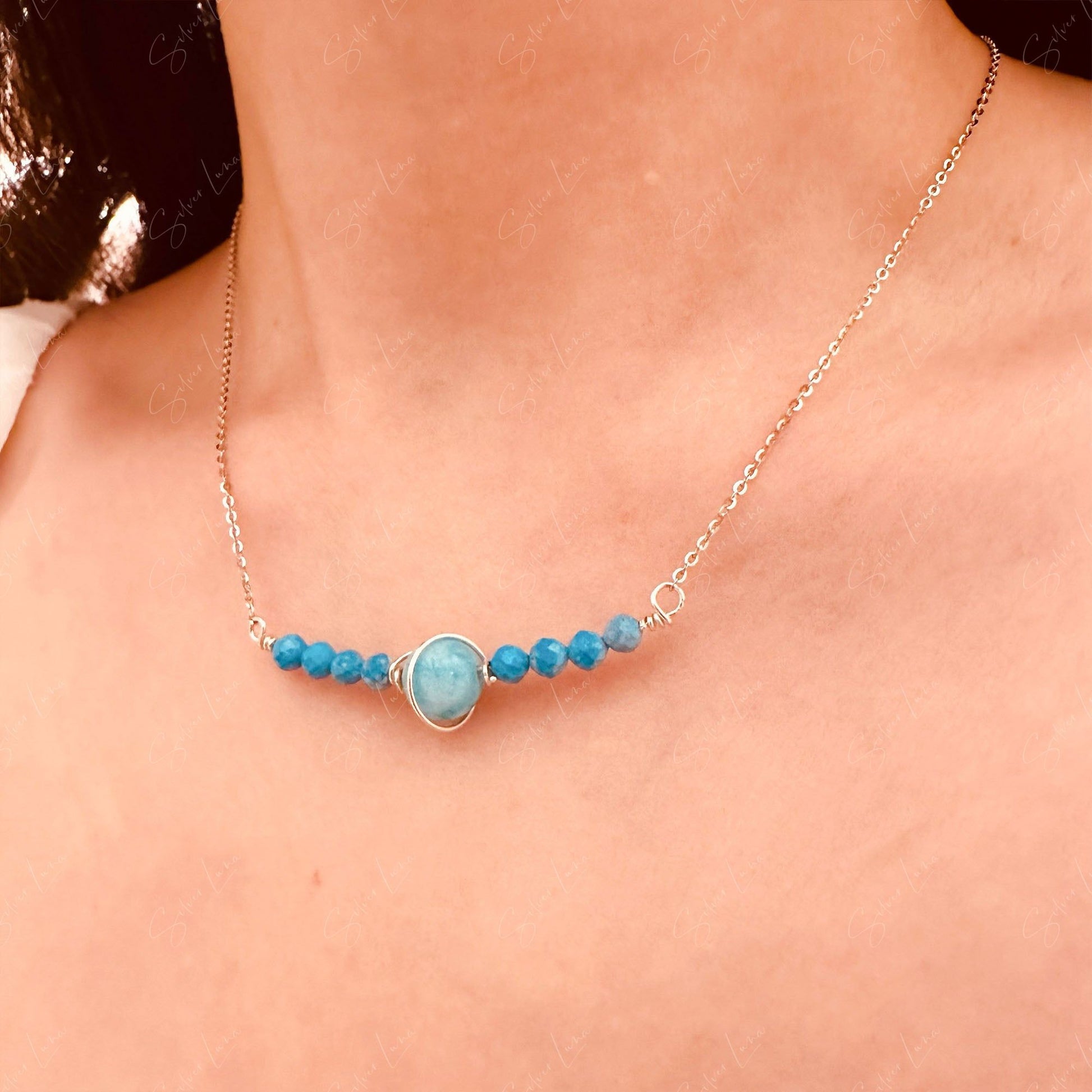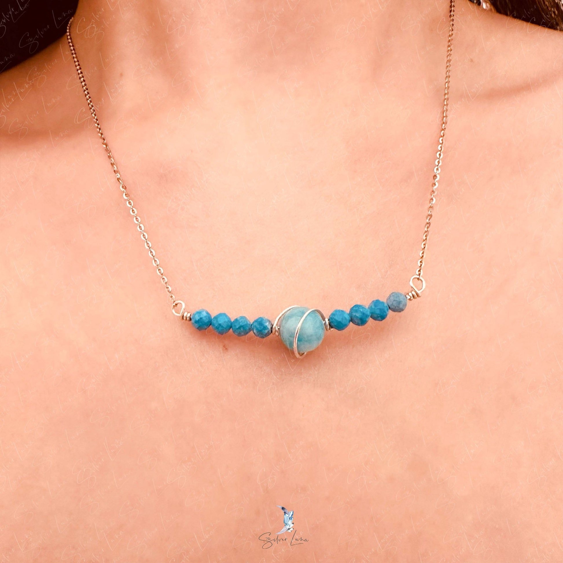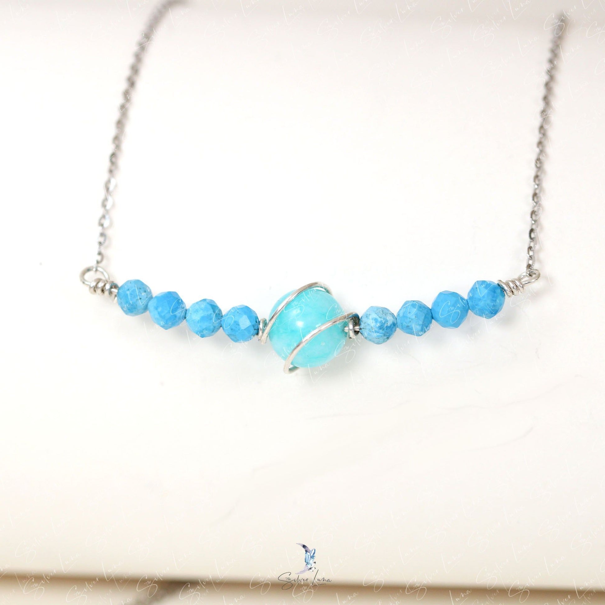 Indulge in the captivating beauty of this handcrafted pendant necklace, adorned with a striking Amazonite jade bead as its centerpiece, delicately wrapped in spiral silver wire and accented with dainty faceted turquoise beads. Suspended on a 925 sterling silver cable chain, every aspect of this piece exudes sophistication and elegance. Crafted entirely from 925 sterling silver, indulge in the luxury of this unique and natural stone necklace.