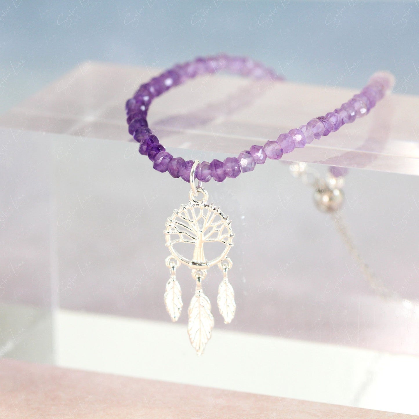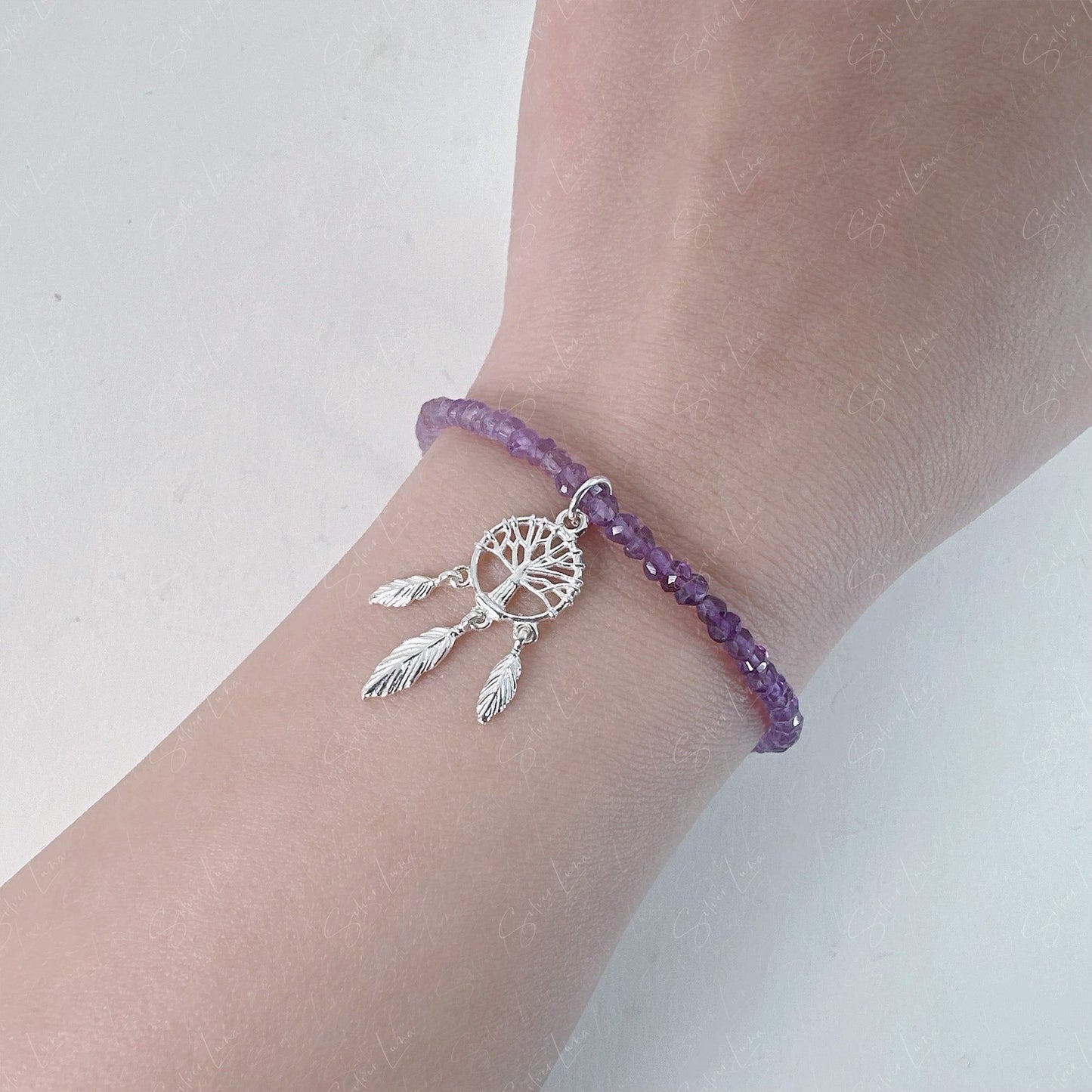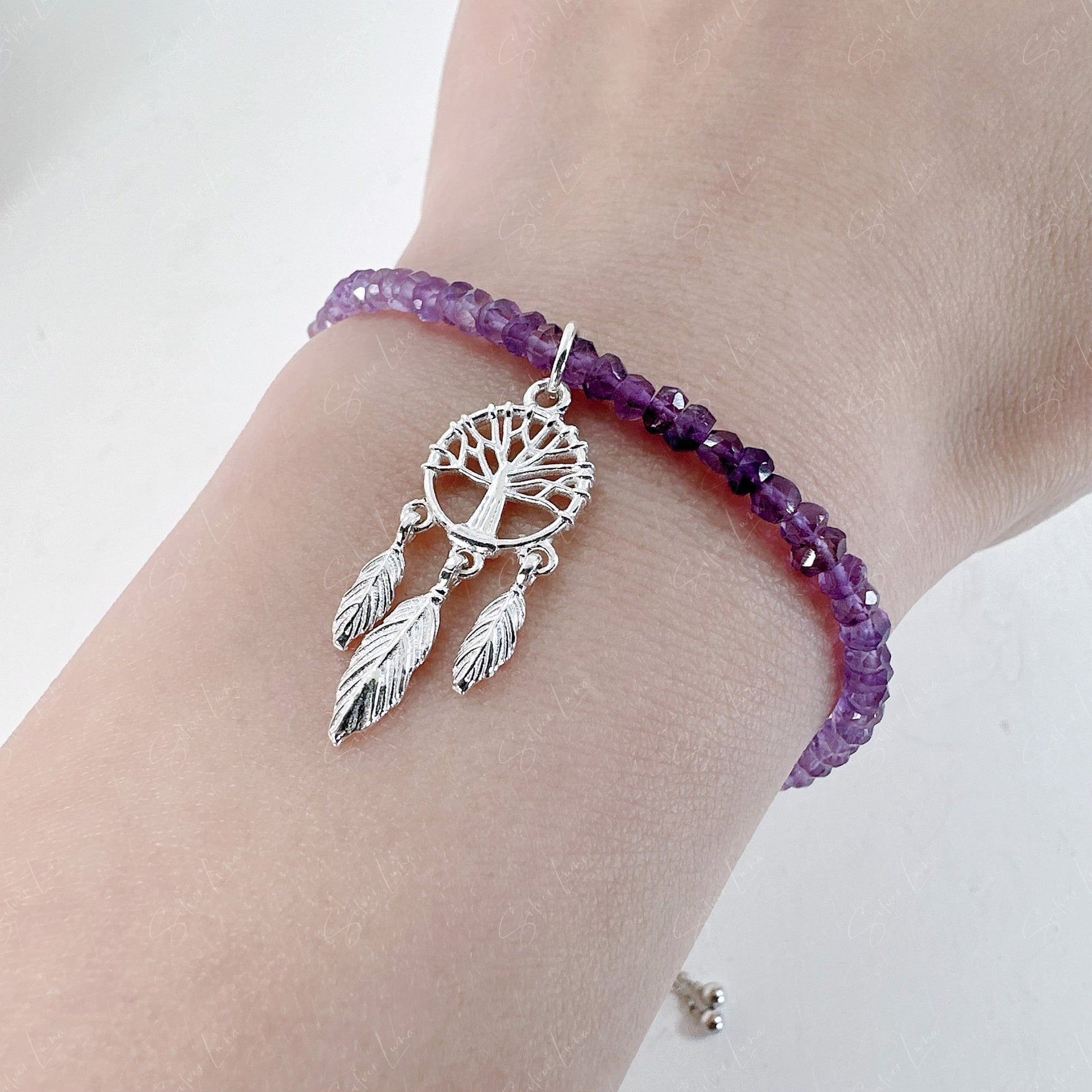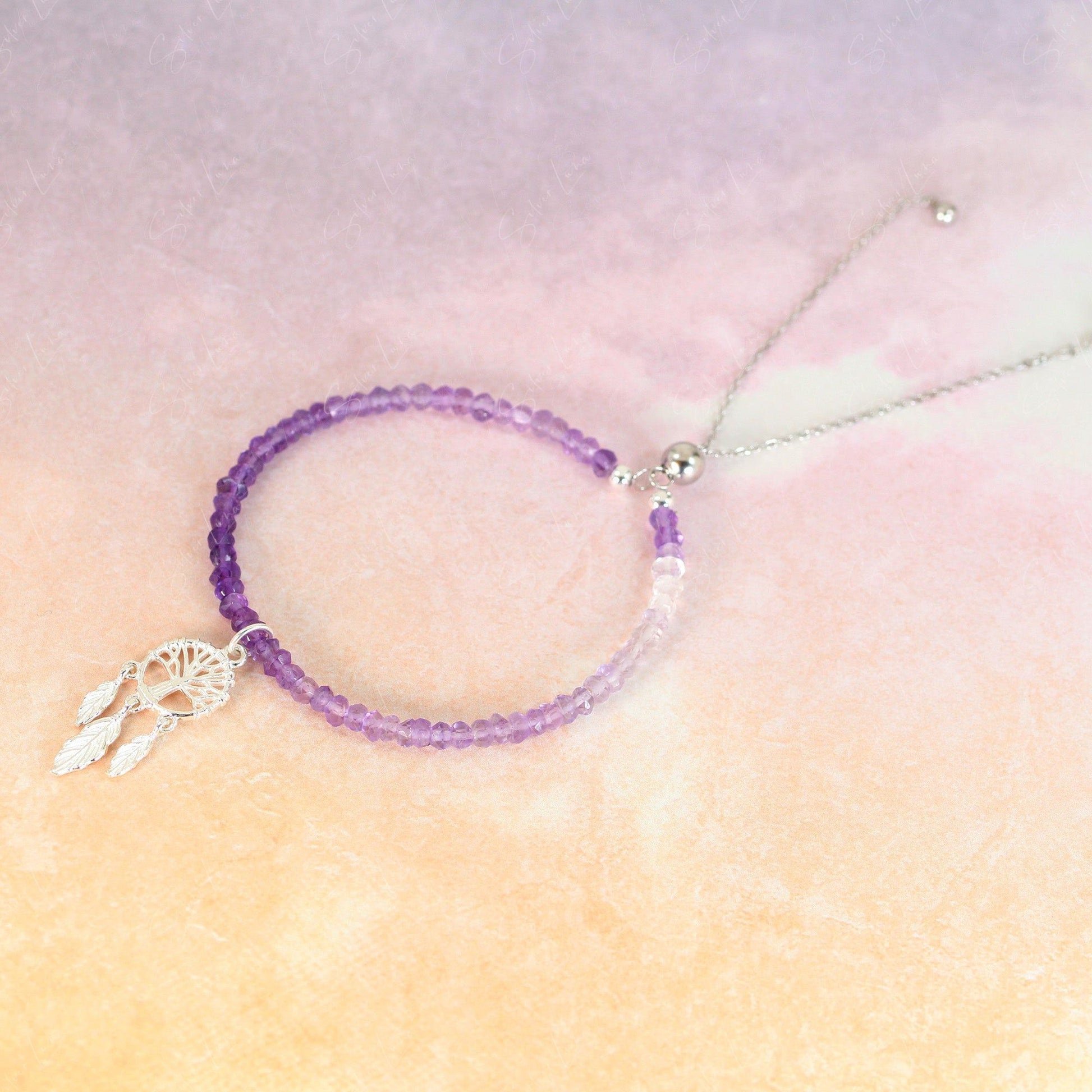 This handmade Amethyst beaded bracelet bursts with purple energy and dreams of faraway places. The ombre Amethyst beads gradually deepen in hue as they cascade down the strain, evoking a sunset over a magical land. Capping it all is a sterling silver dream catcher charm that will seem to catch your wishes as you drift off to sleep. Handcrafted by artisans using natural Amethyst gemstones and sterling silver, this bracelet combines bohemian charm with high-quality materials in a piece that's sure to become your go-to stackable staple. Wear it to infuse your day with a little purple magic—it just might catch your biggest dreams.