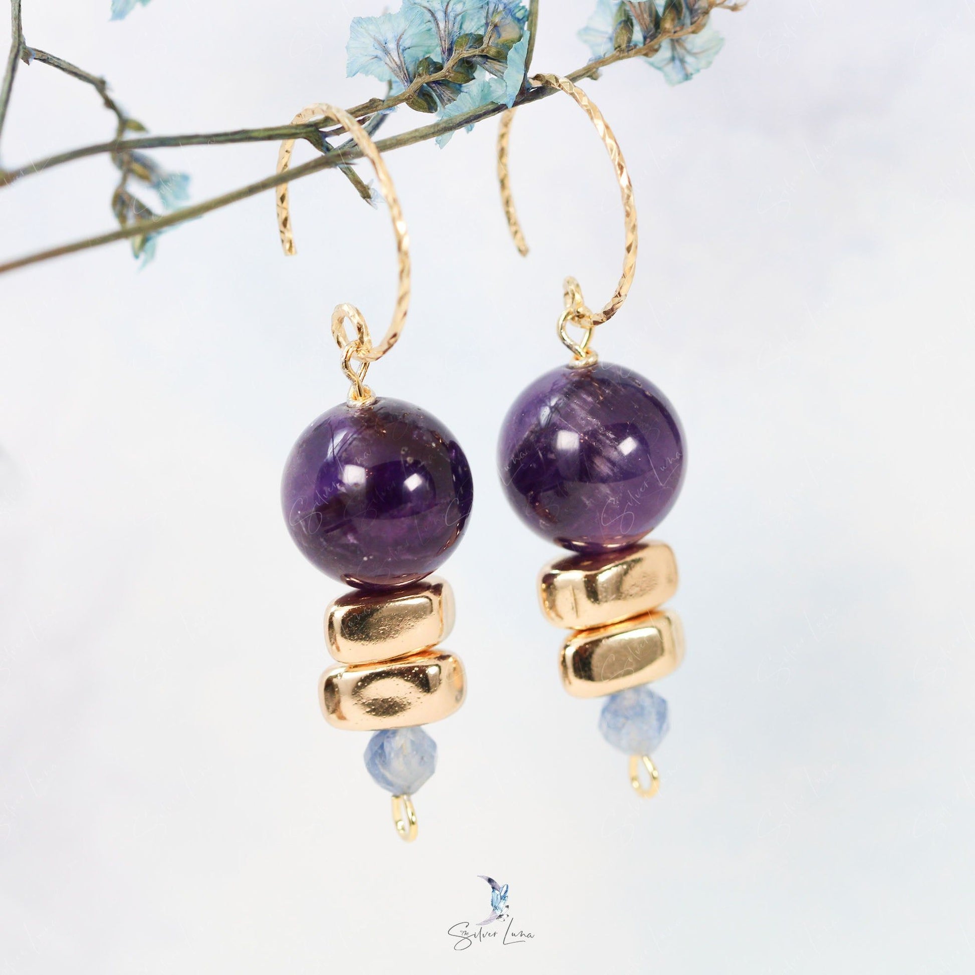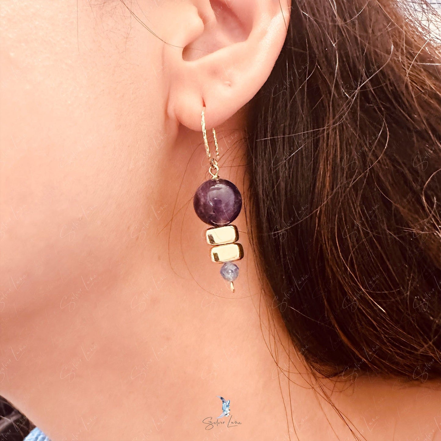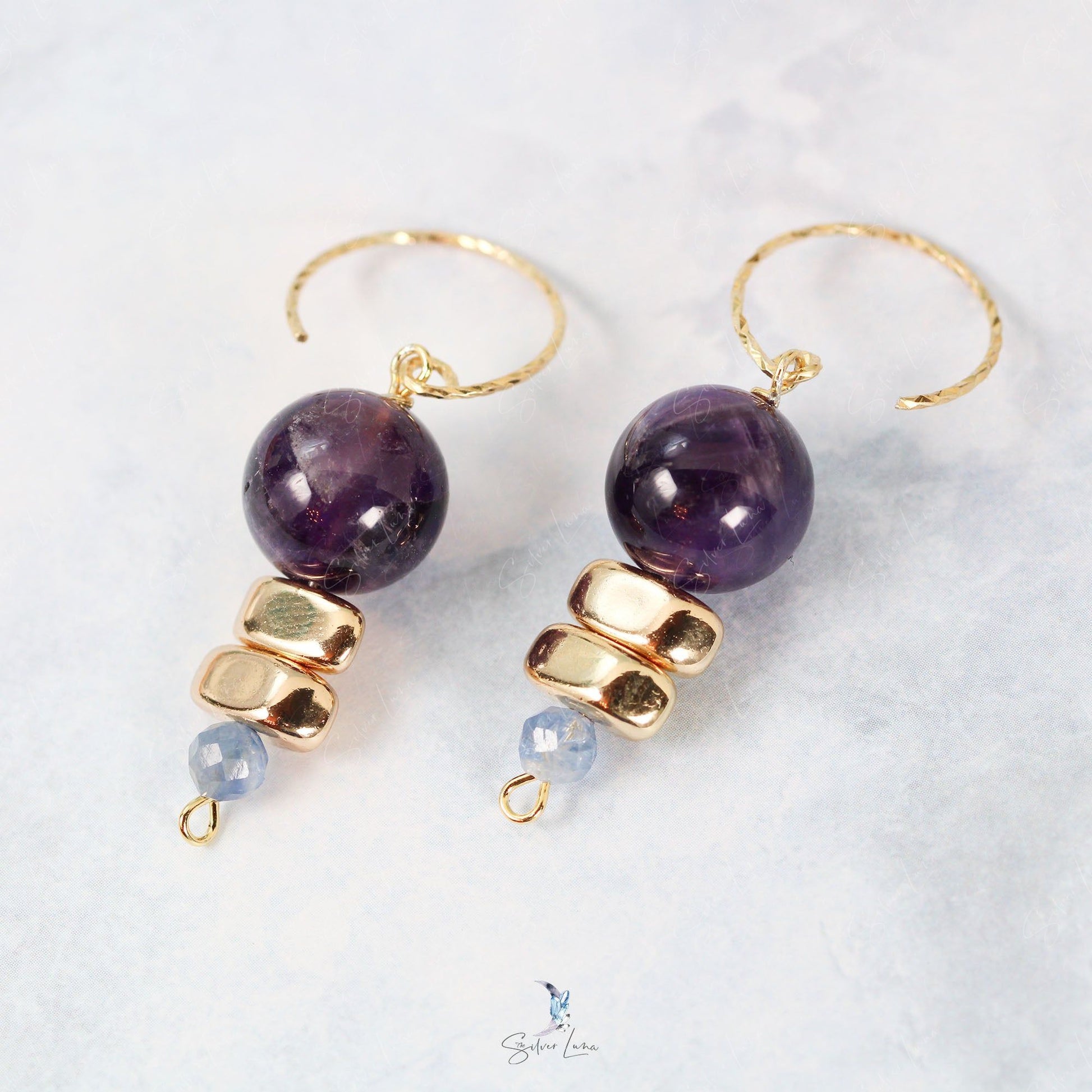 Indulge in the captivating beauty of these Amethyst natural multi stone beads earrings. Featuring a 12 mm purple Amethyst bead, two prayed gold color hematite beads, and a blue faceted Kyanite stone drop, these earrings are adorned with solid 925 sterling silver textured ear wires and 18k gold plated accents. The eye pins are also crafted from gold plated 925 sterling silver. Add these one-of-a-kind gems to your fine jewelry collection or gift them to someone special.