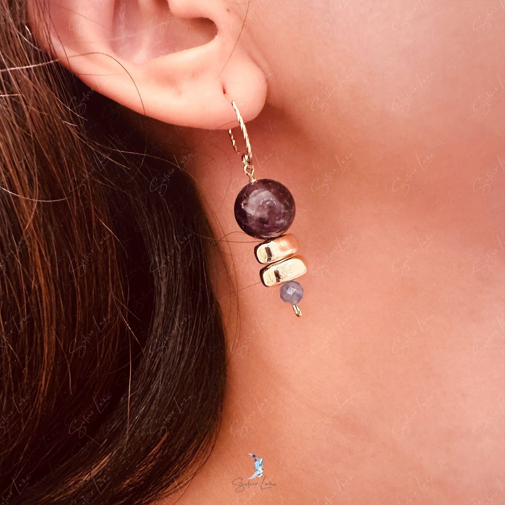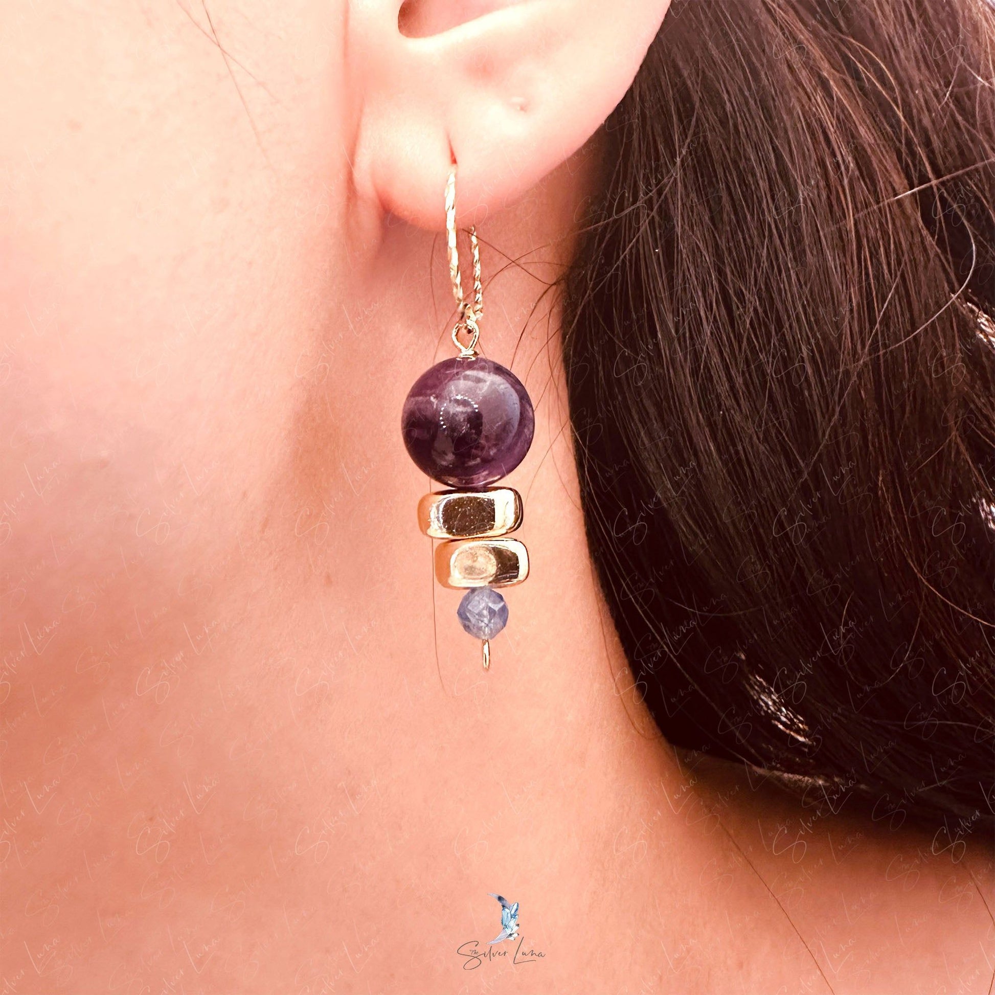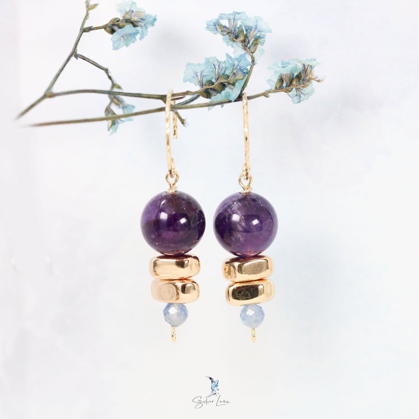 Indulge in the captivating beauty of these Amethyst natural multi stone beads earrings. Featuring a 12 mm purple Amethyst bead, two prayed gold color hematite beads, and a blue faceted Kyanite stone drop, these earrings are adorned with solid 925 sterling silver textured ear wires and 18k gold plated accents. The eye pins are also crafted from gold plated 925 sterling silver. Add these one-of-a-kind gems to your fine jewelry collection or gift them to someone special.