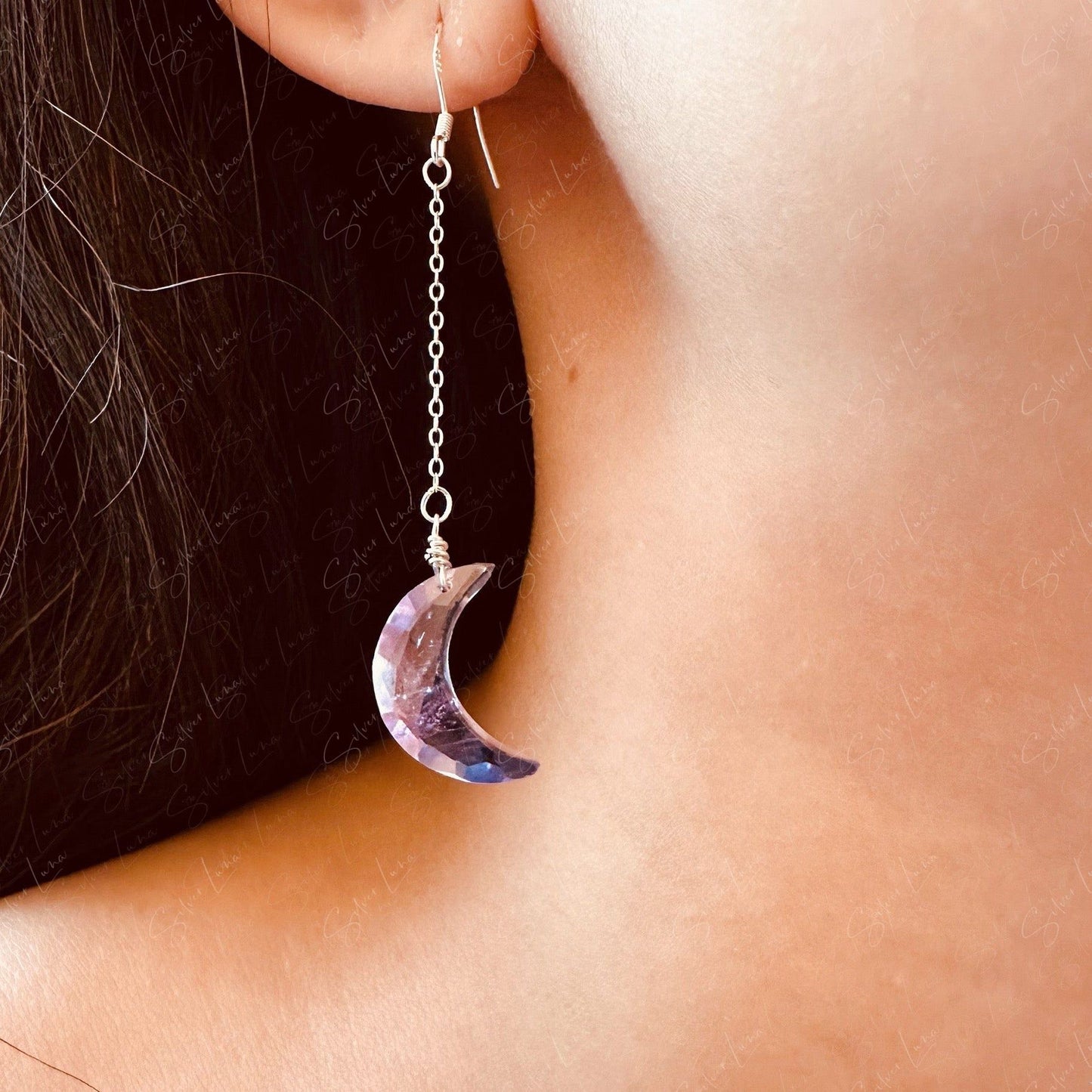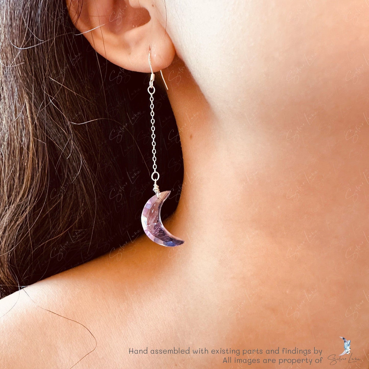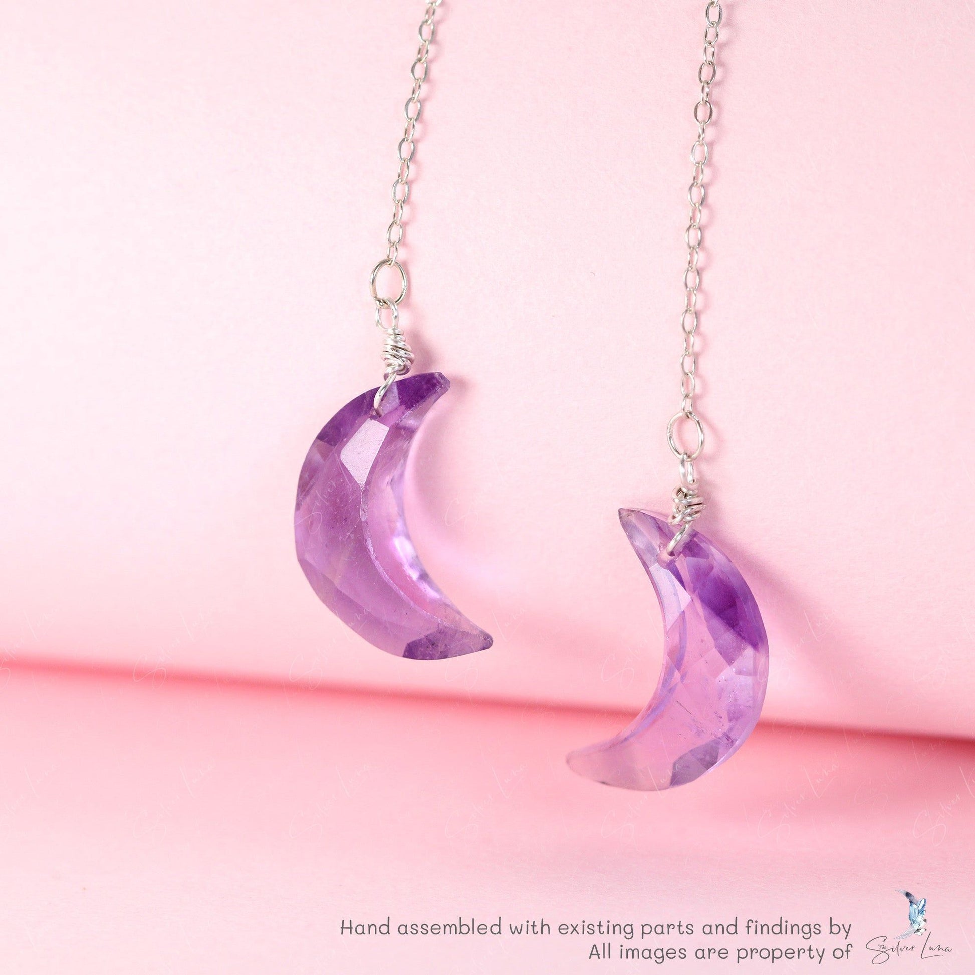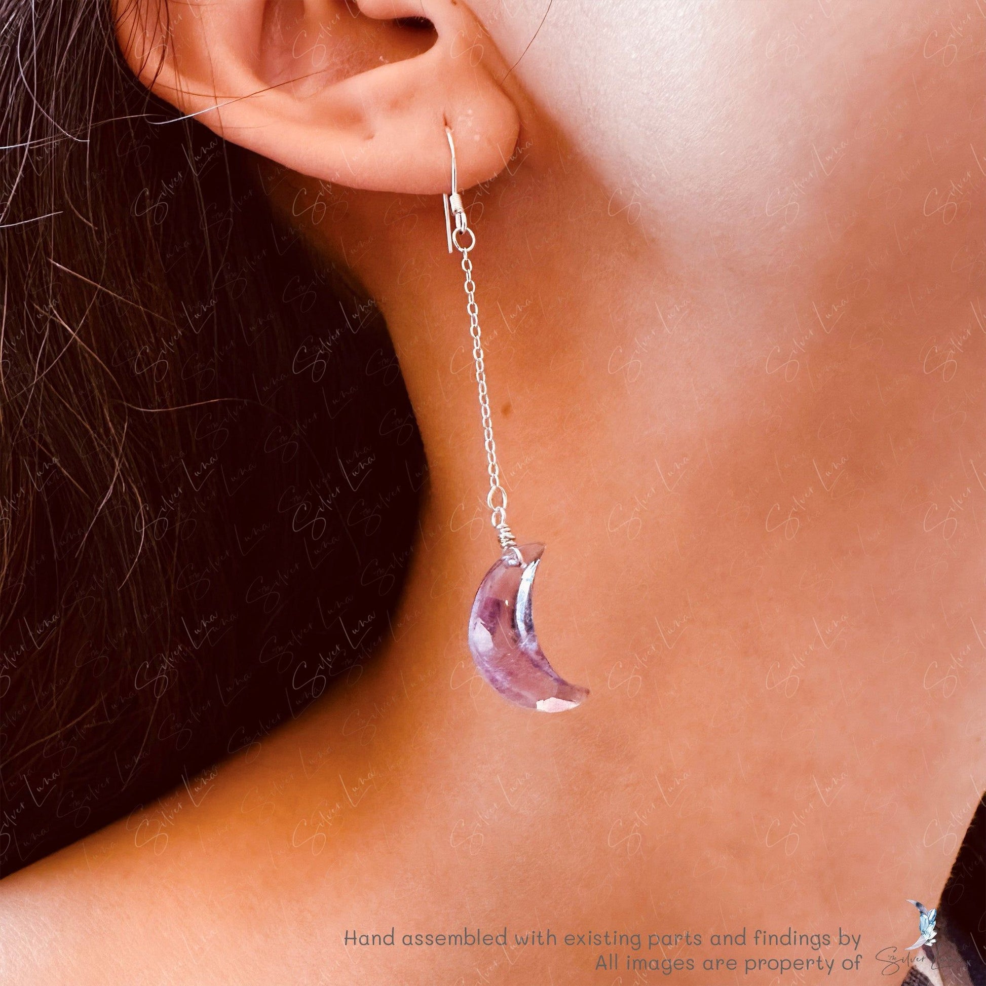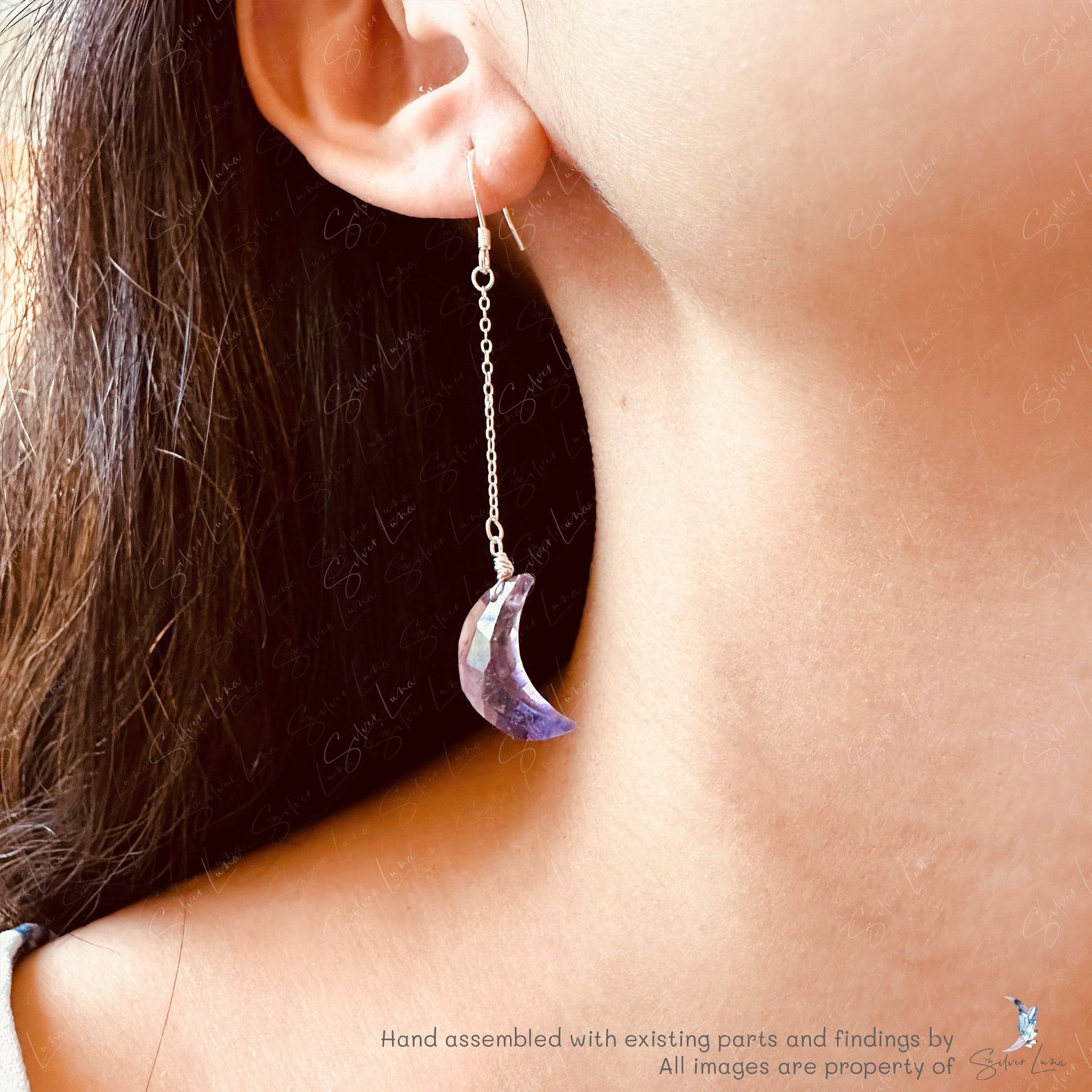 Discover the celestial beauty of amethyst with these stunning moon drop earrings. Crafted with a faceted crescent moon amethyst gemstone and solid sterling silver, these earrings exude elegance and sophistication. The light purple shade of the amethyst is ethically sourced and wire-wrapped to the chain using sterling silver wire. Elevate your everyday look or gift to someone special with these dazzling amethyst moon drop earrings.