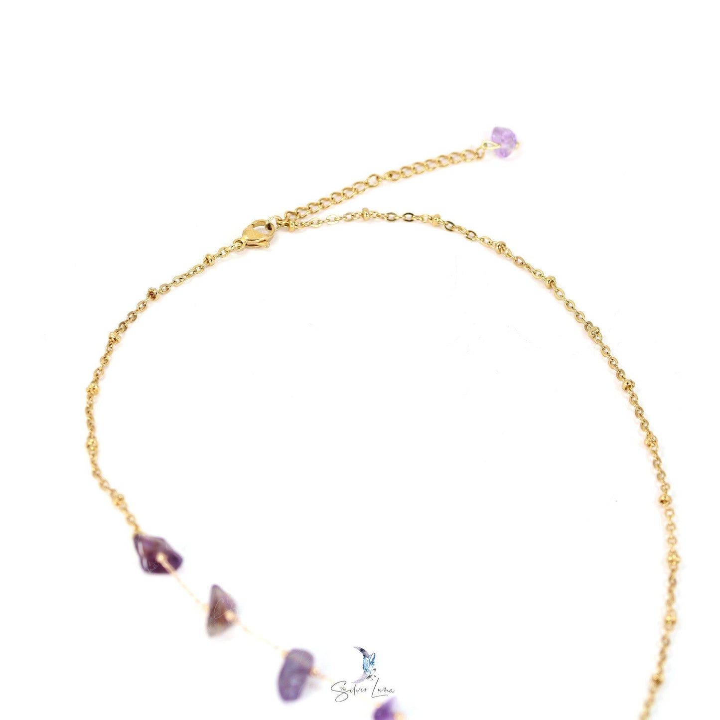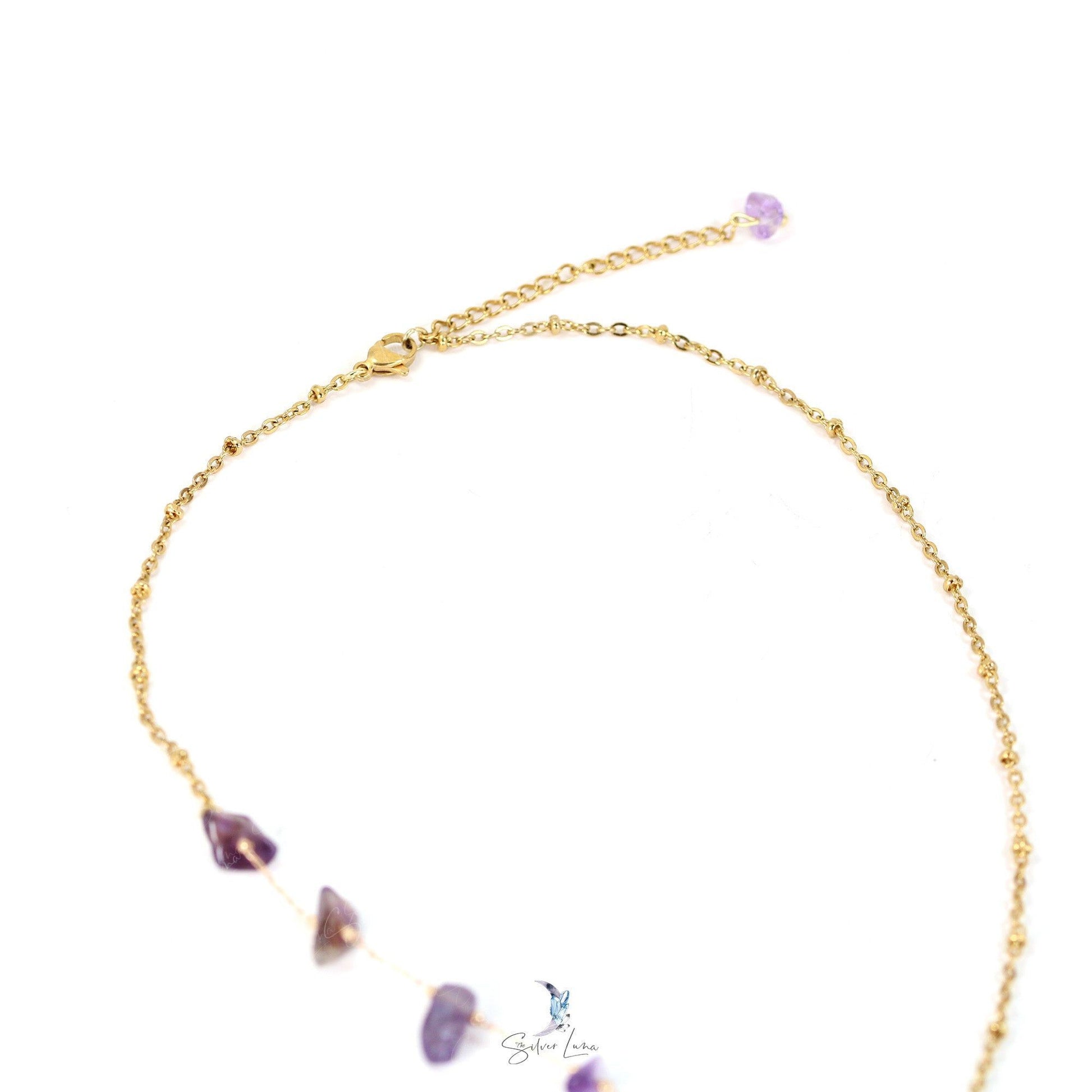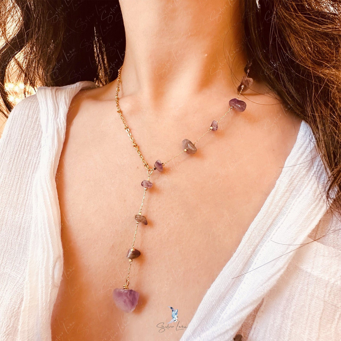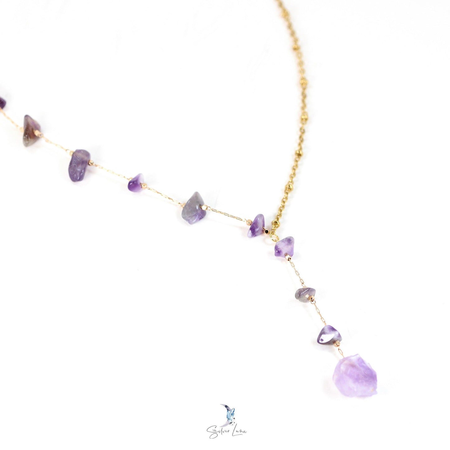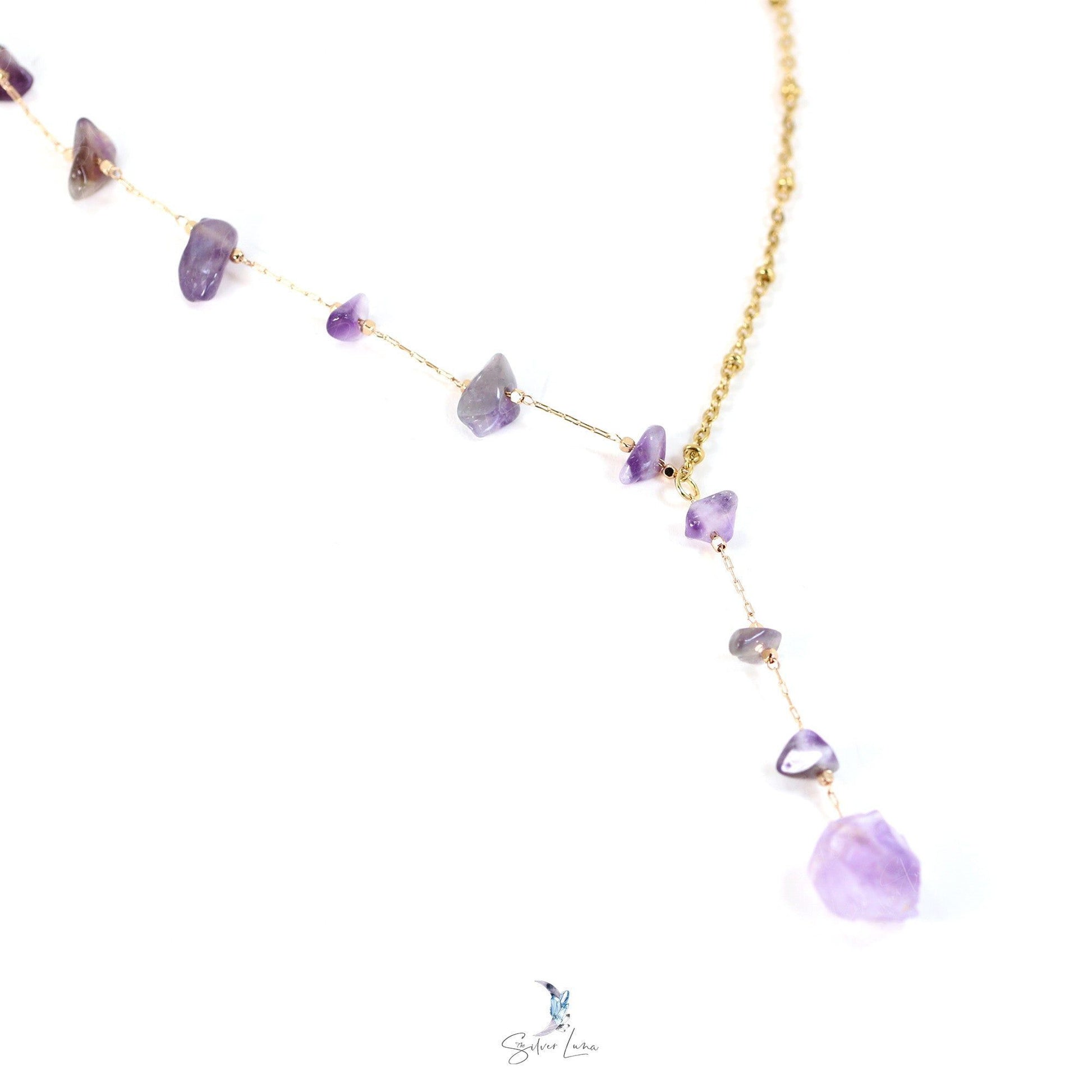 Experience the transformative power of this exquisite lariat necklace featuring a striking asymmetrical design and raw Amethyst stones. Elevate your style with the natural beauty of gravel chip stone Amethyst in a unique Y shape, complete with a 2.5 inch drop and a large, untamed Amethyst at the end. Crafted with tarnish resistant stainless steel, this necklace exudes both elegance and durability. Share its beauty with a loved one or indulge in a luxurious accessory for yourself.