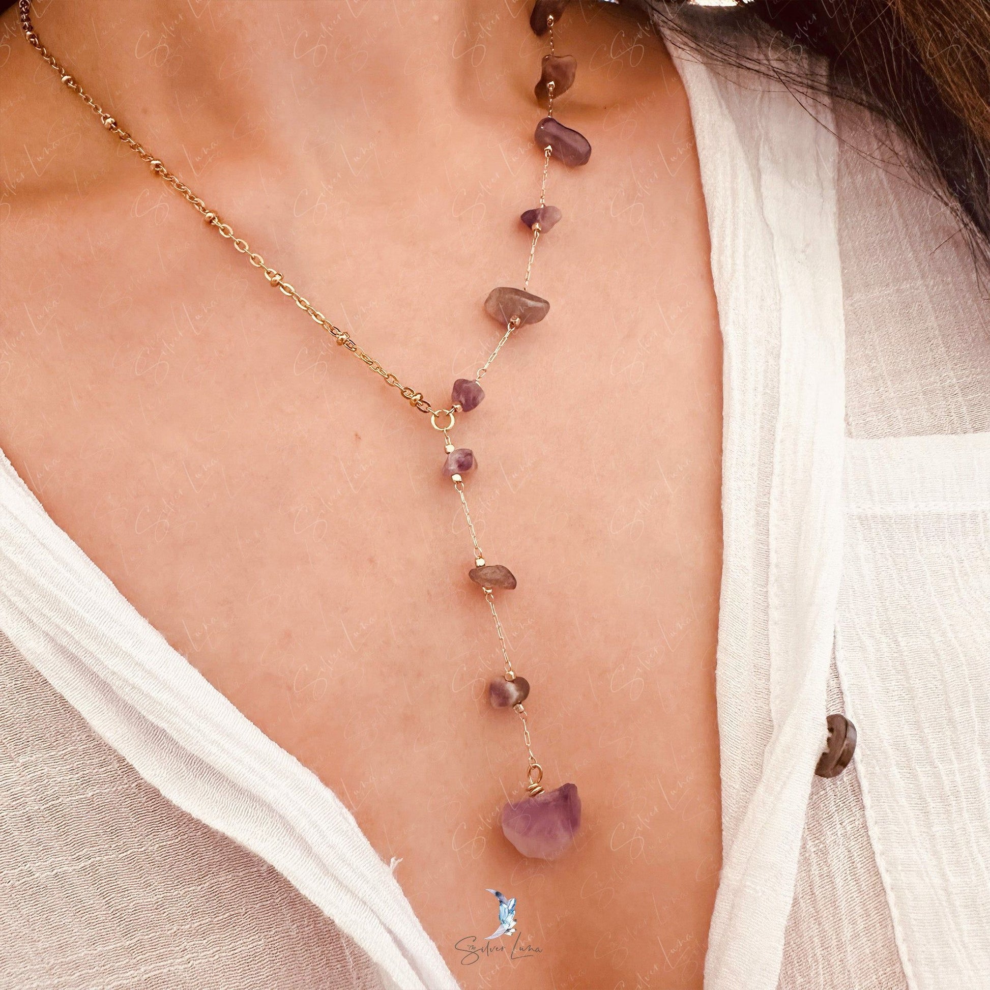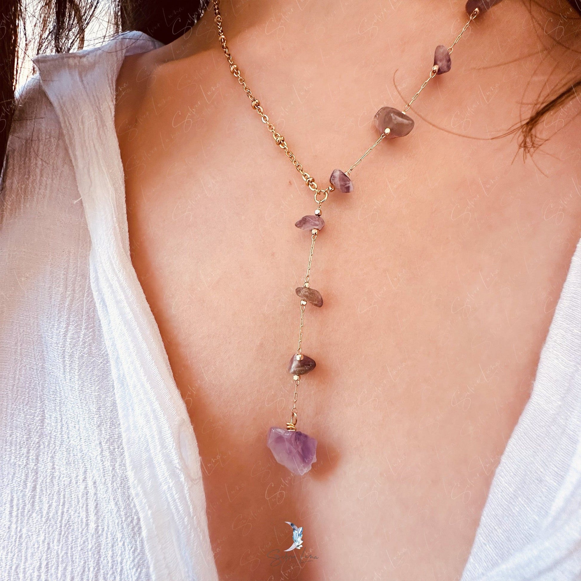 Healing Amethyst raw stone lariat Y stainless steel necklace