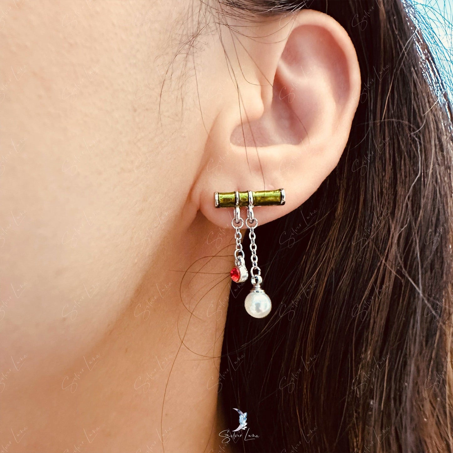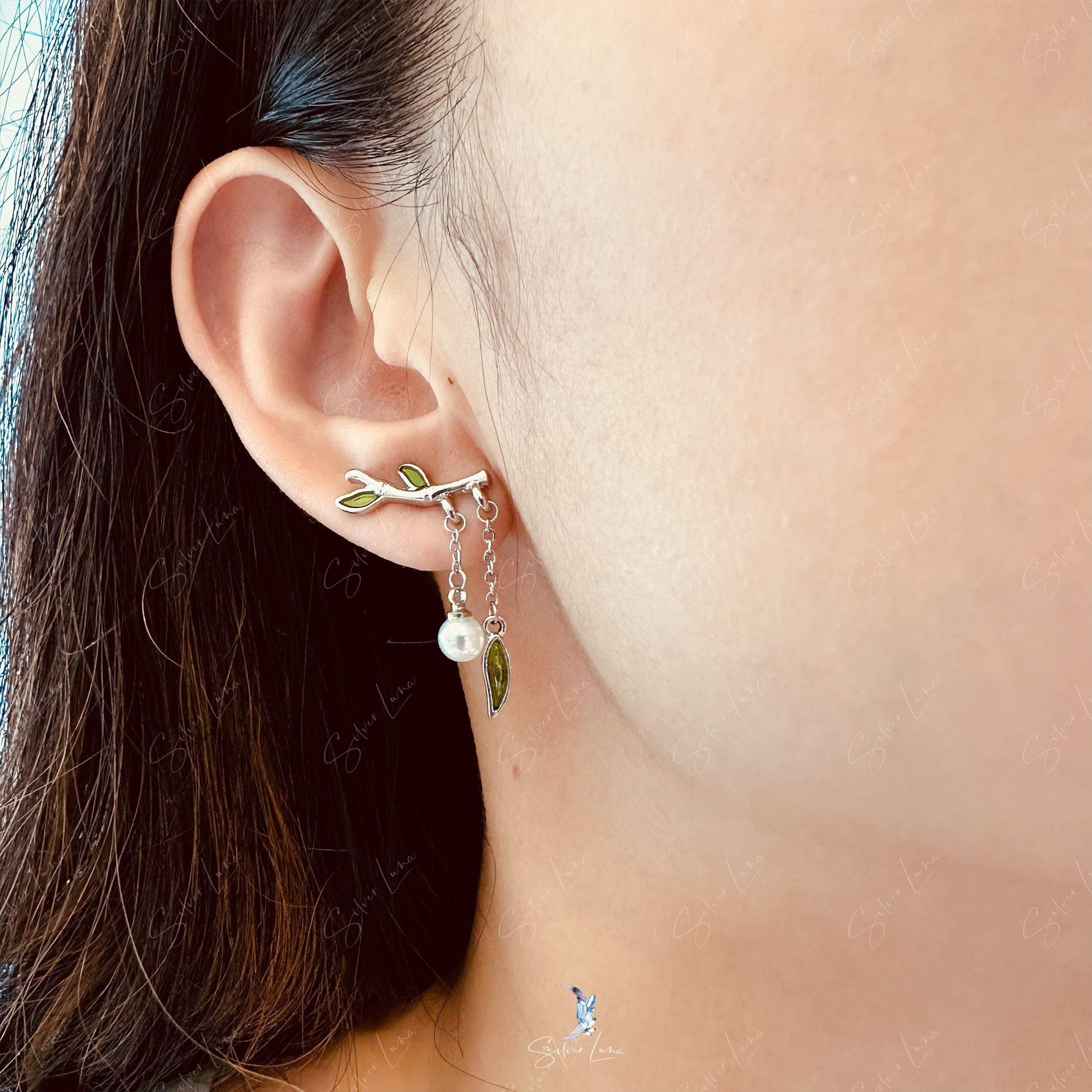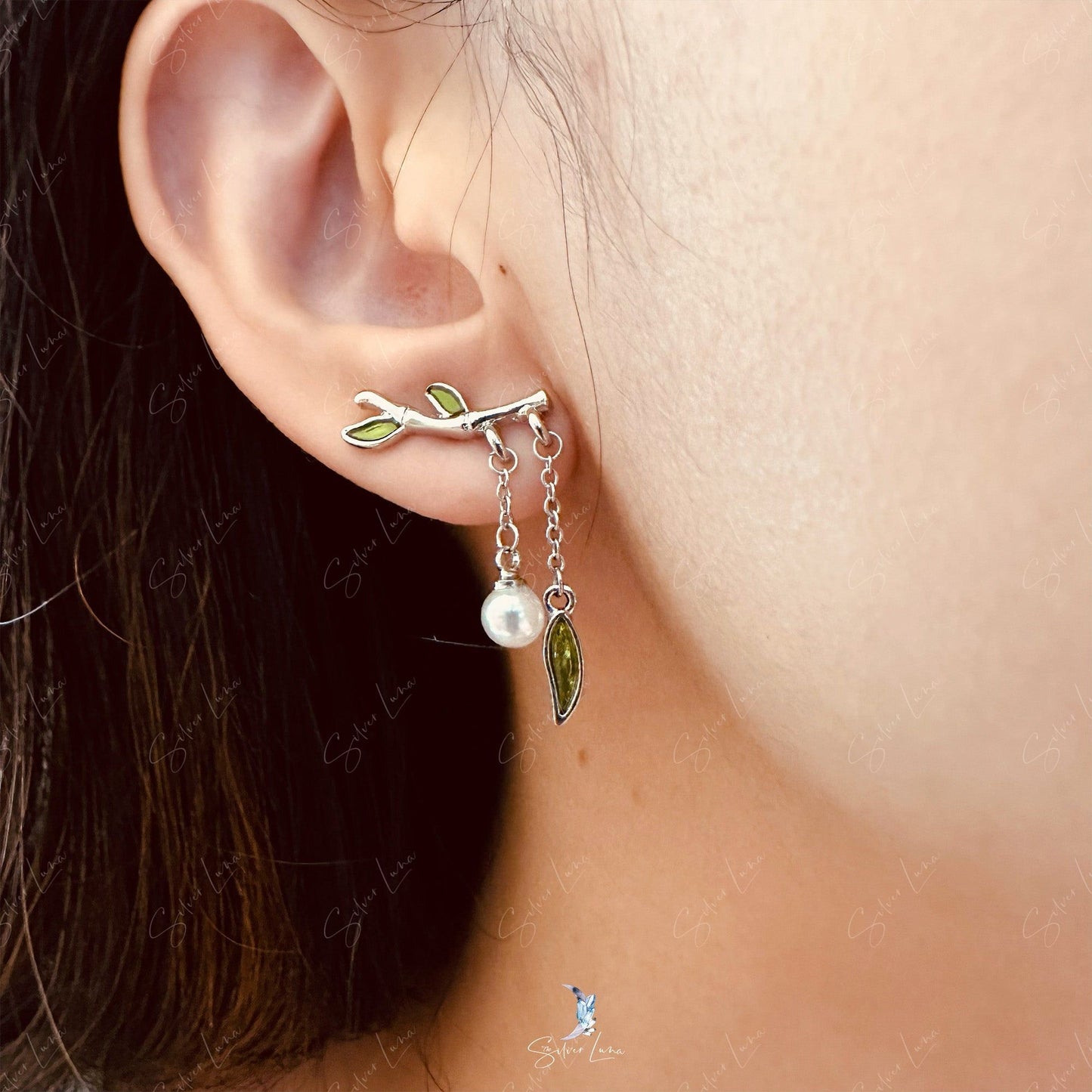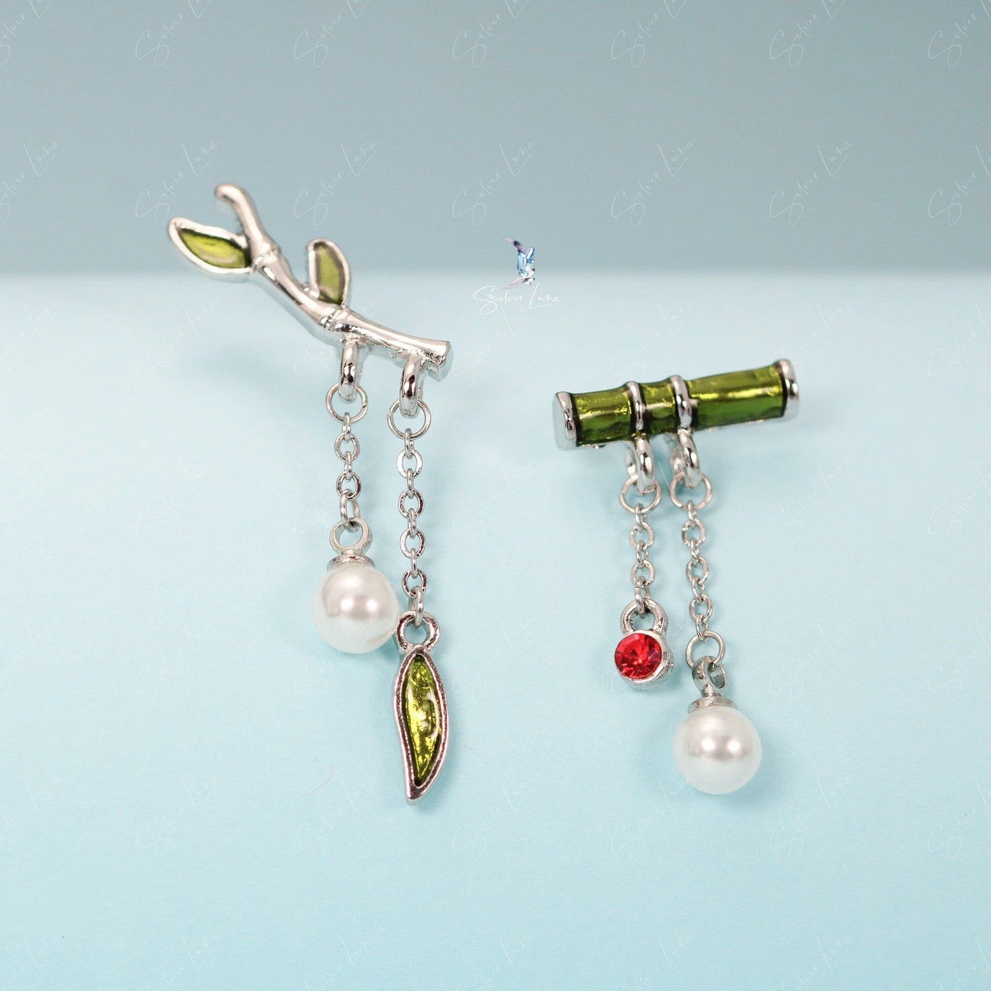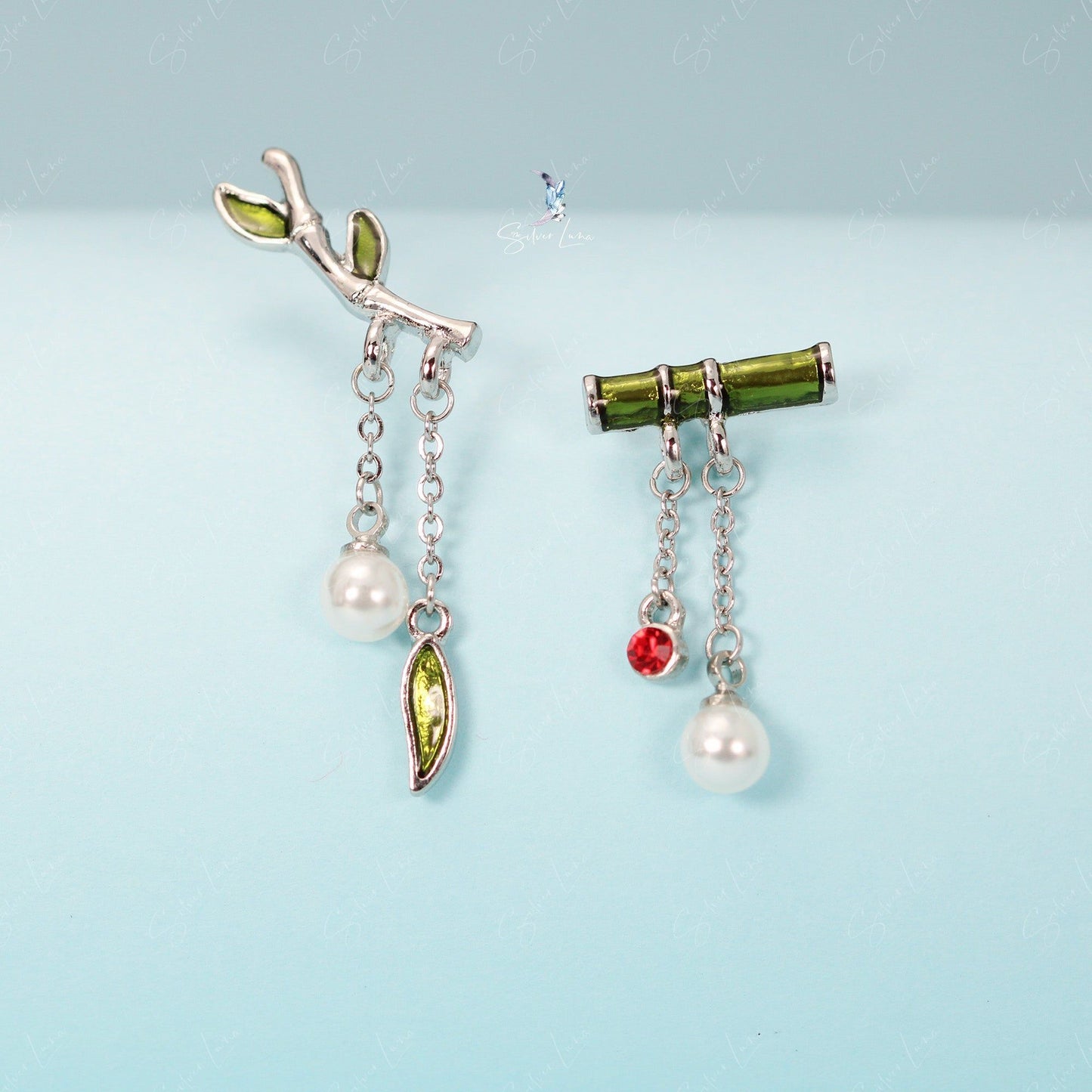 These asymmetric pearl drop earrings features cute bamboo tree branch shape with pearl dangle drop, a perfect fashion jewelry gift for your love one.