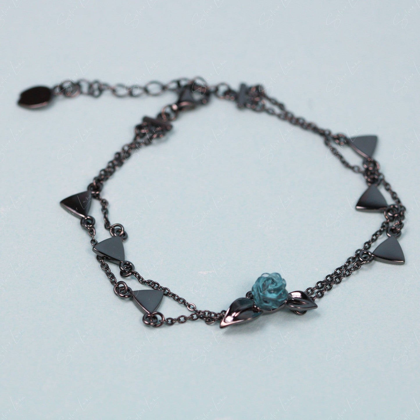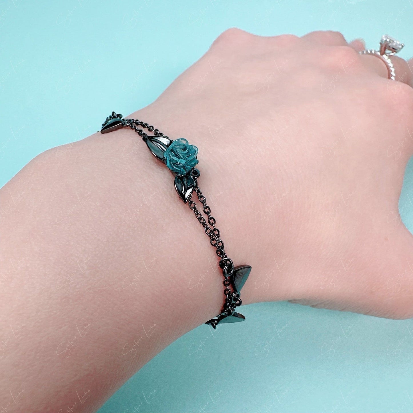 Experience the exquisite beauty of our gothic-inspired black thorn blue rose bracelet, featuring a stunning blue rose centerpiece and a sleek black double chain adorned with a triangular rose thorn. Crafted from high-quality 925 sterling silver and finished with black gold plating, this bracelet is truly one-of-a-kind. Elevate your style with this bold and alluring accessory.