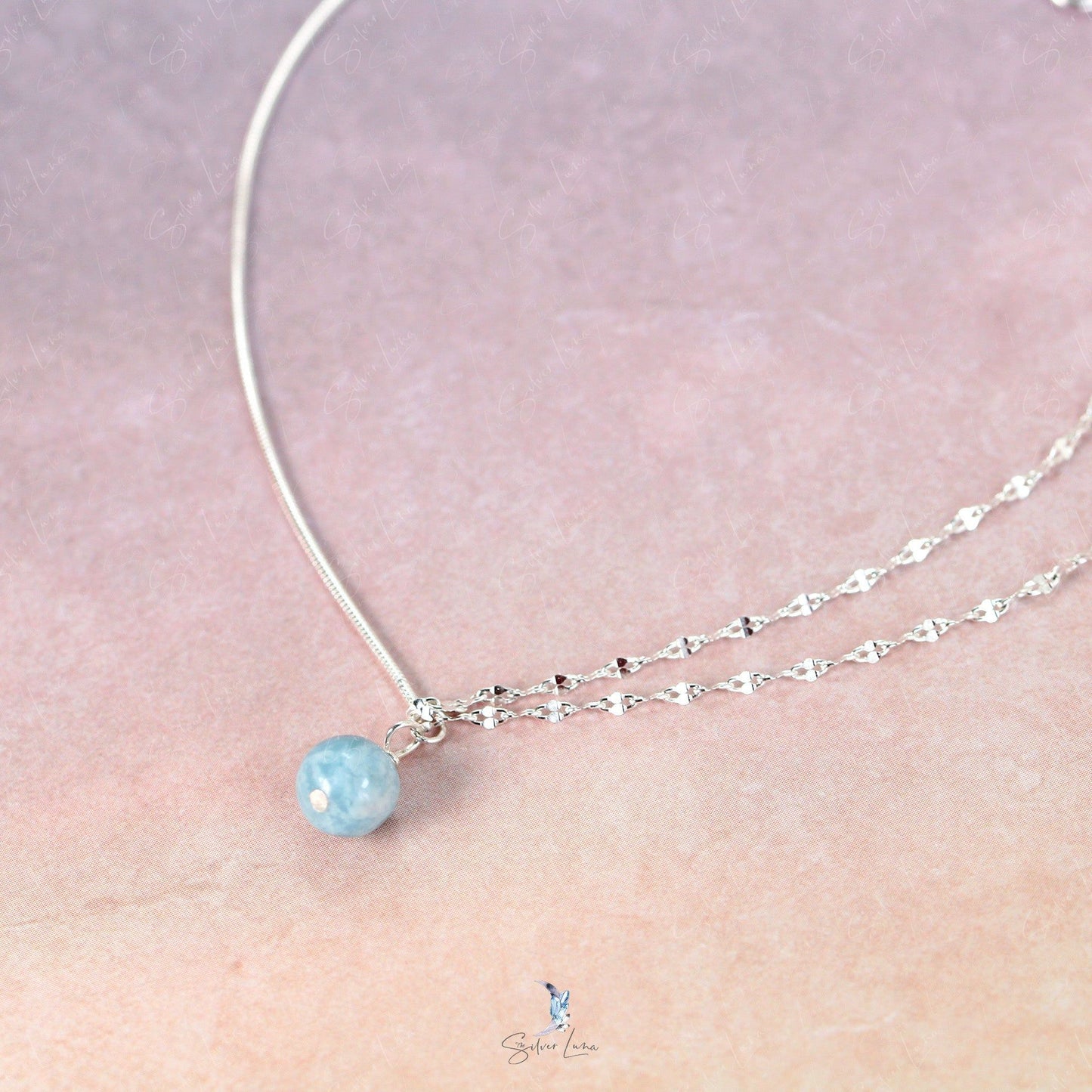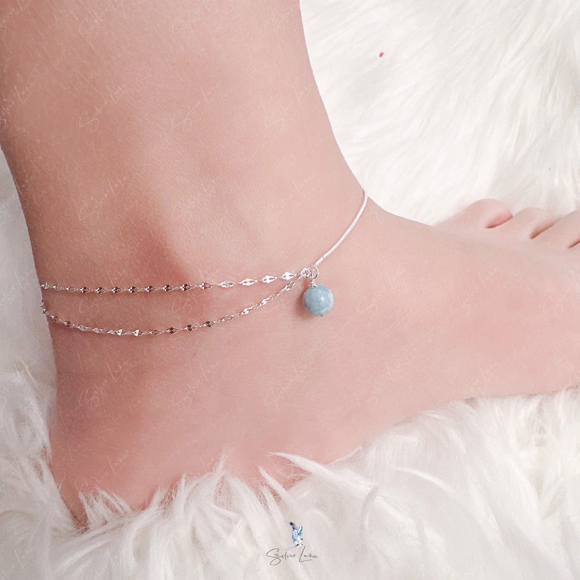 These cute dainty girl anklet features a simple Larimar round bead stone drop on a double twist chain and a snake chain, made of solid 925 sterling silver. Light and comfortable to wear, this Larimar stone drop anklet will complete your summer look.