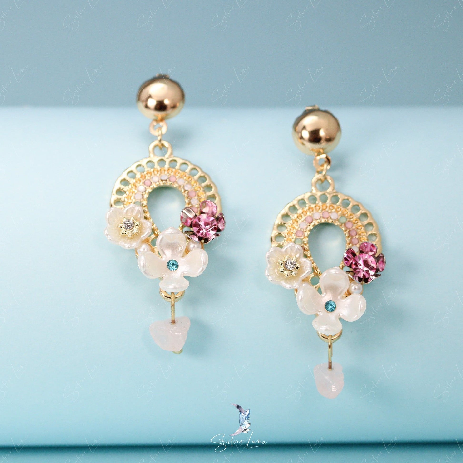 These gorgeous bohemian flower dangle drop earrings feature beautiful crystal and resin flower on bohemian design dangle drop with colored crystal gemstones, this pair of flower drop earrings will elevate your outfit and make you shine at the party. Add these beautiful bohemian flower drop earrings to your everyday party fashion earrings collection or as gift for your love one.