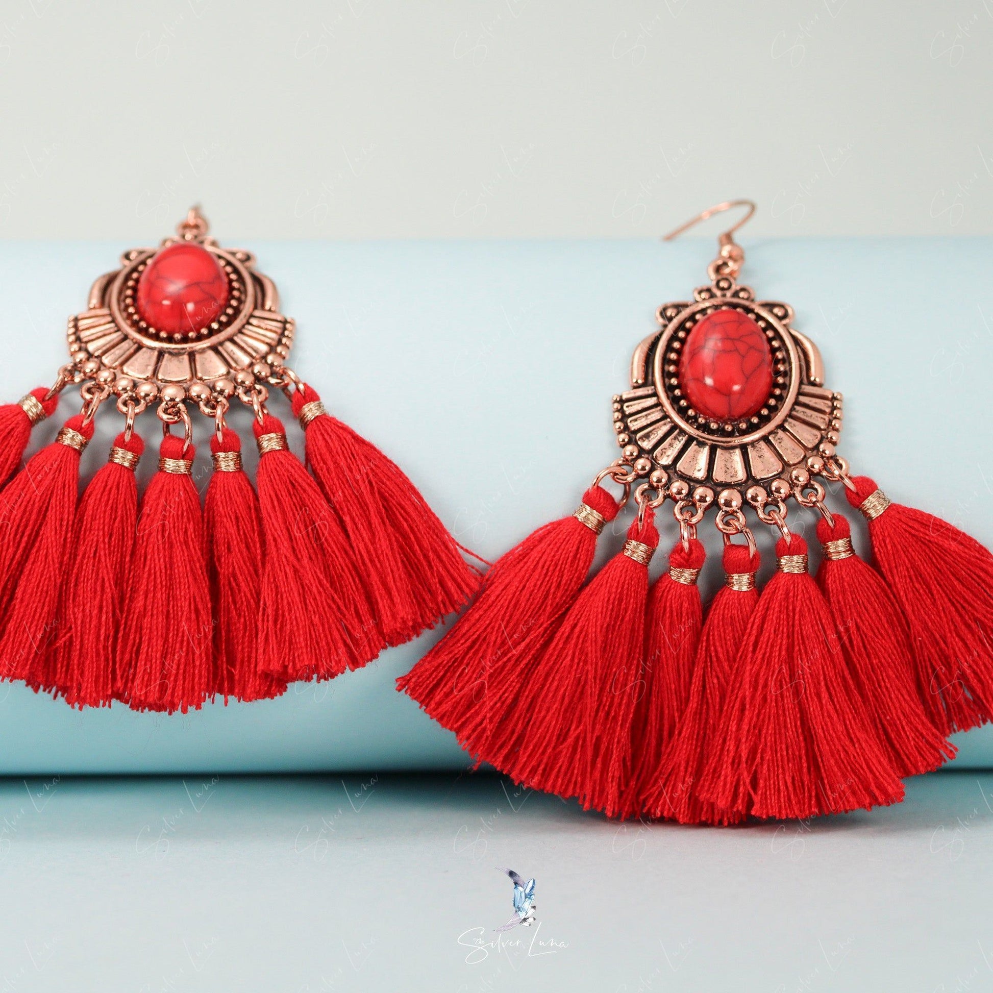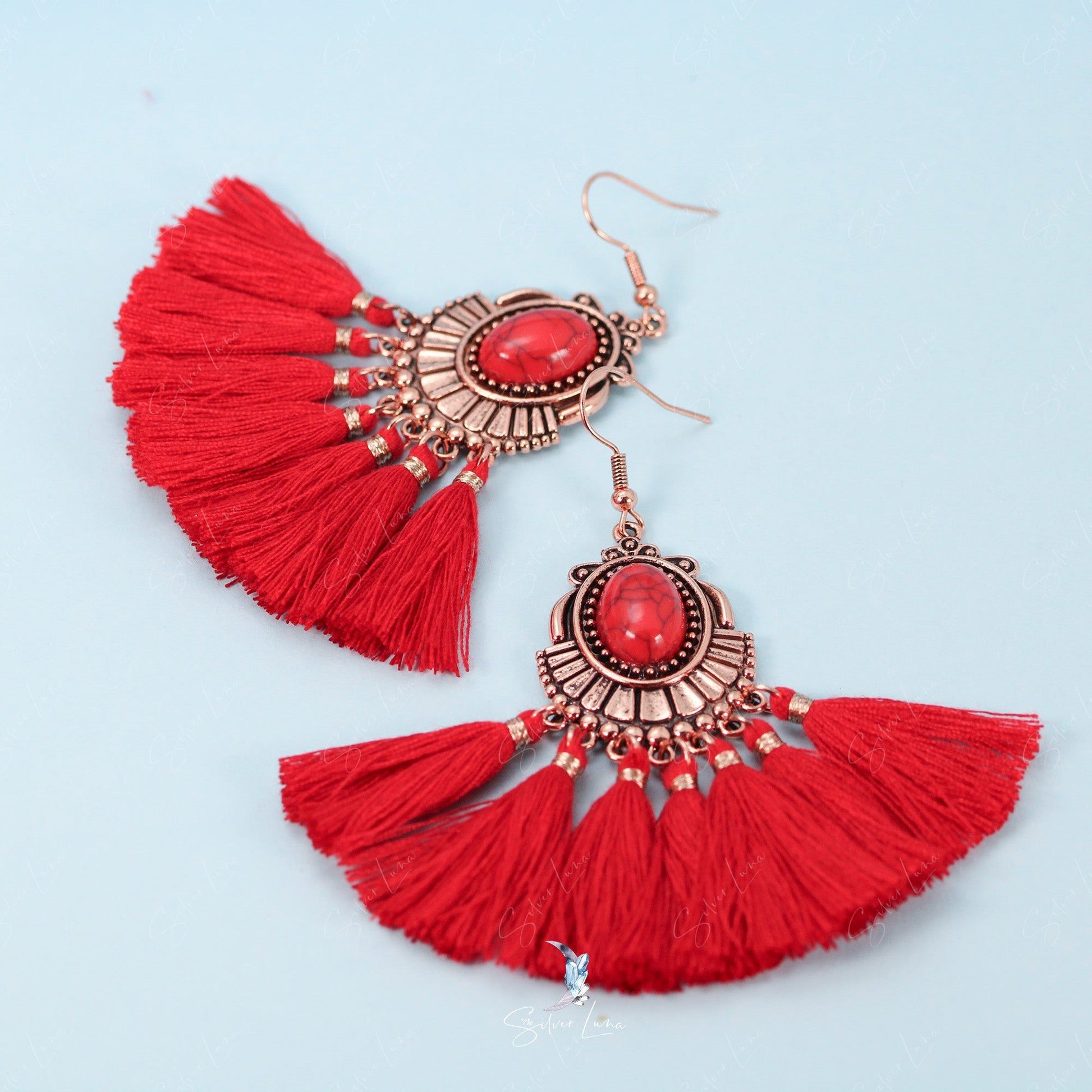 Make a unique statement with this bohemian dangle drop tassel earrings, made of red color thread tassel and bohemian motif on metal. These boho fan tassel dangle drop statement earrings can be a good match for your everyday outfit.