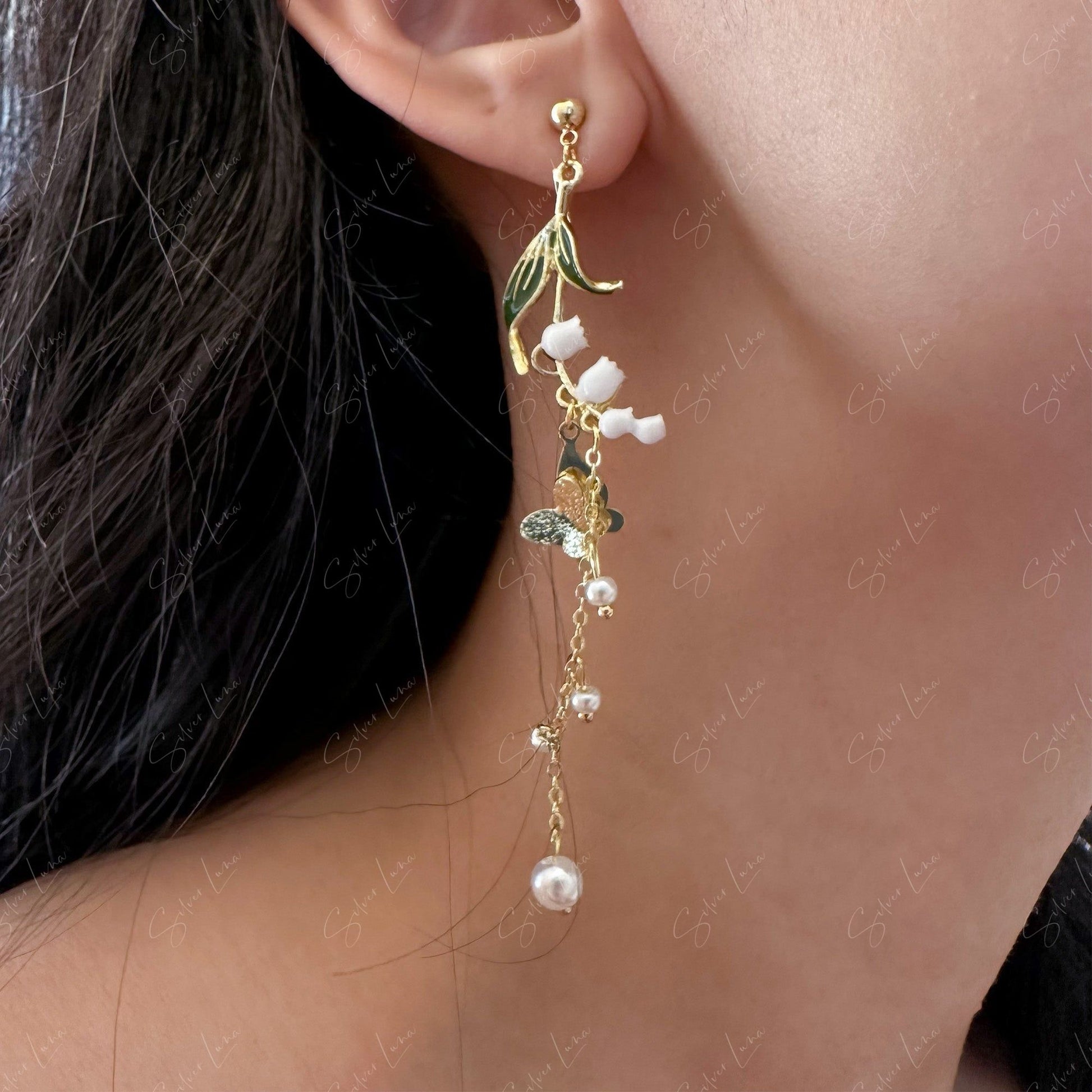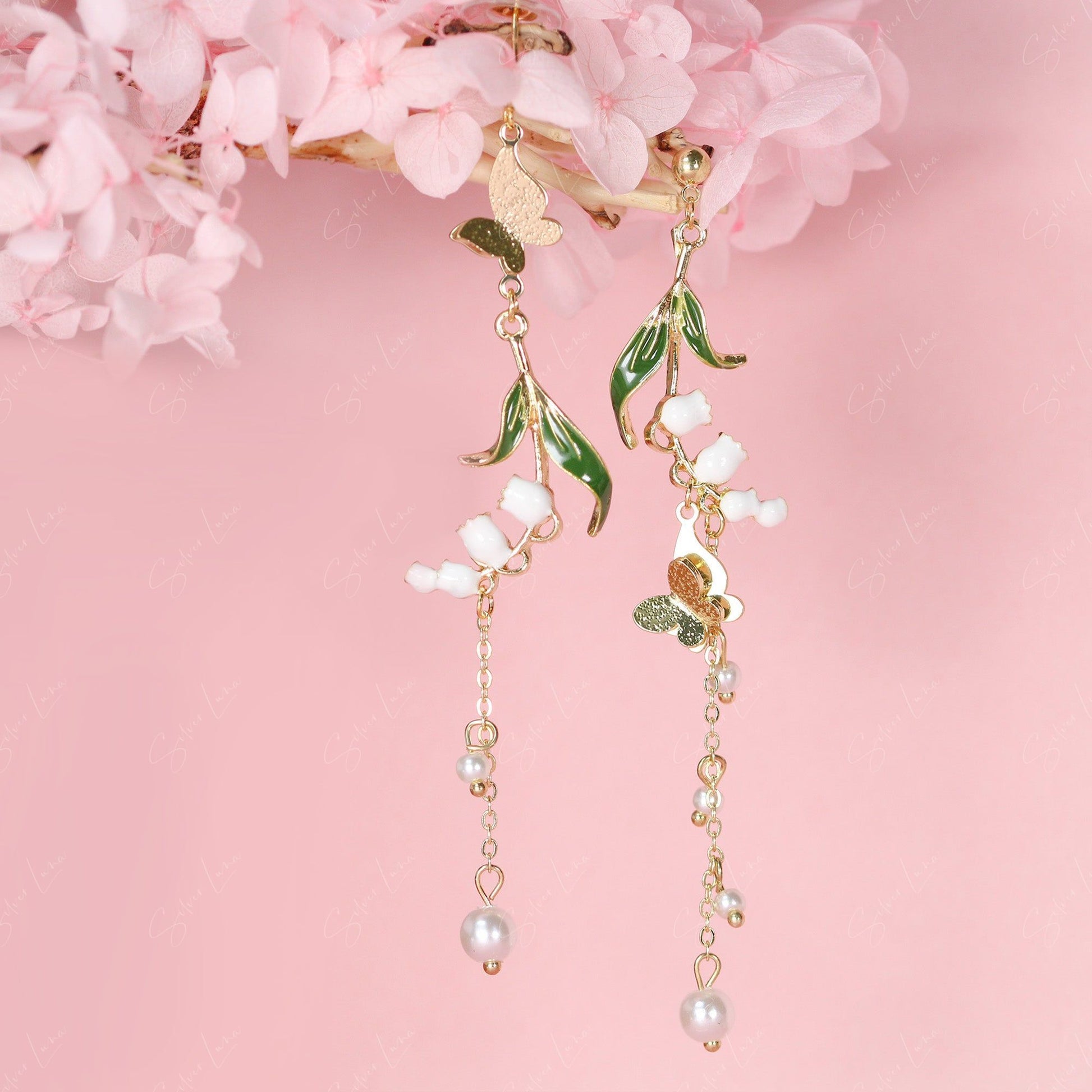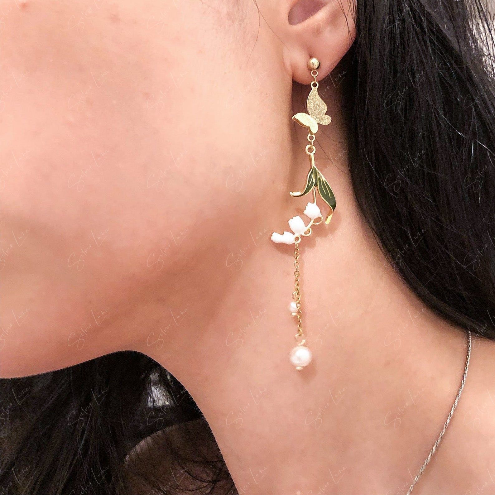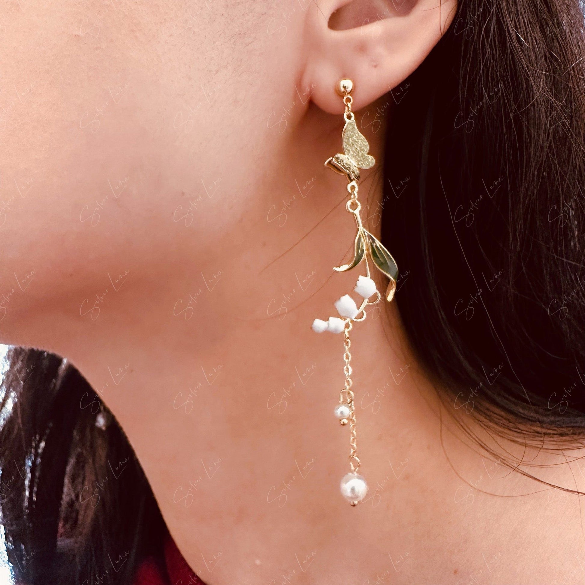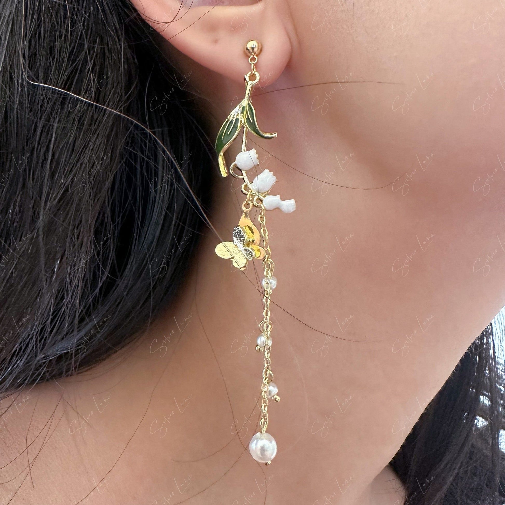 This pair of dangle drop earrings features butterflies and leaves charm dangle drop with little artificial pearl drop on long chain, asymmetrical design.
