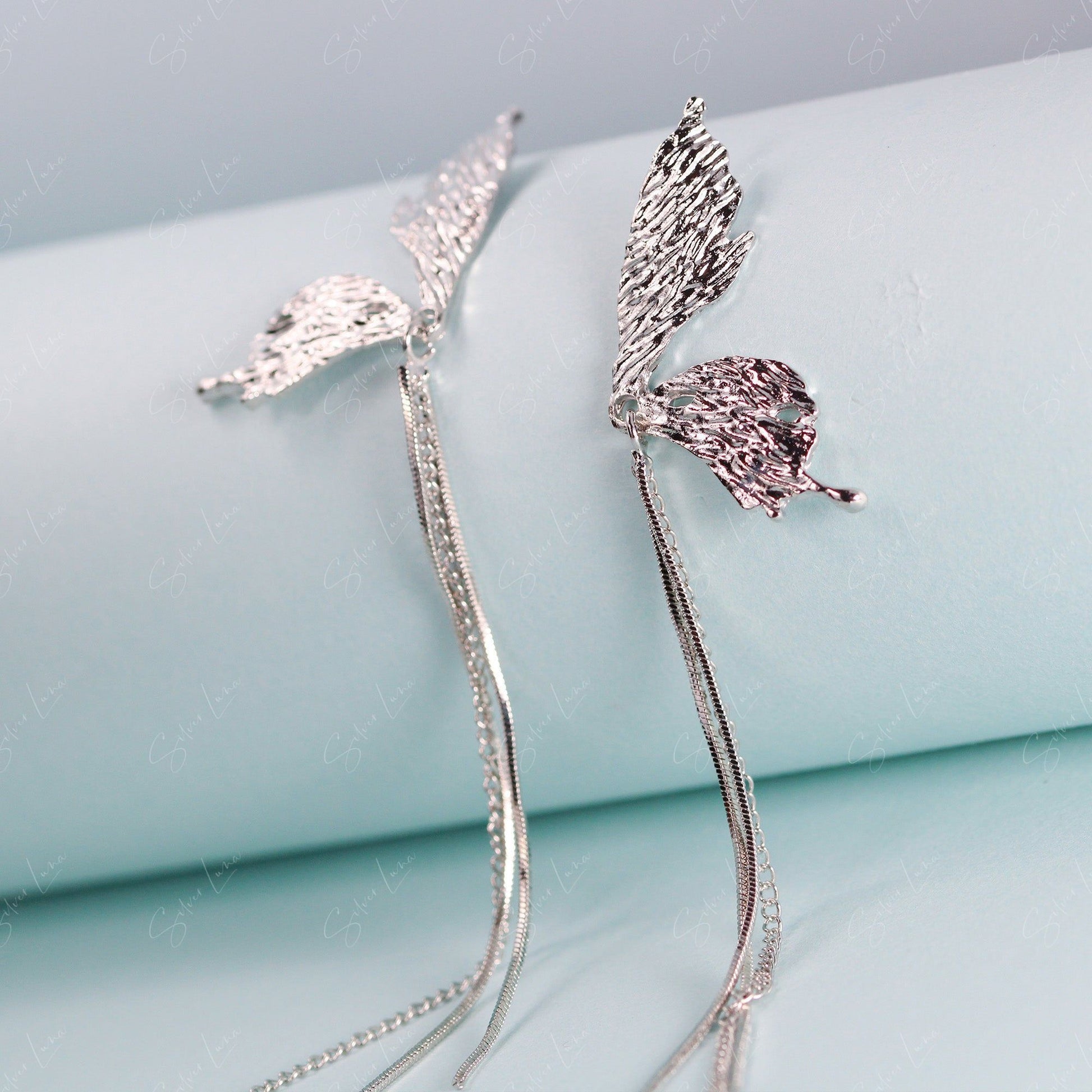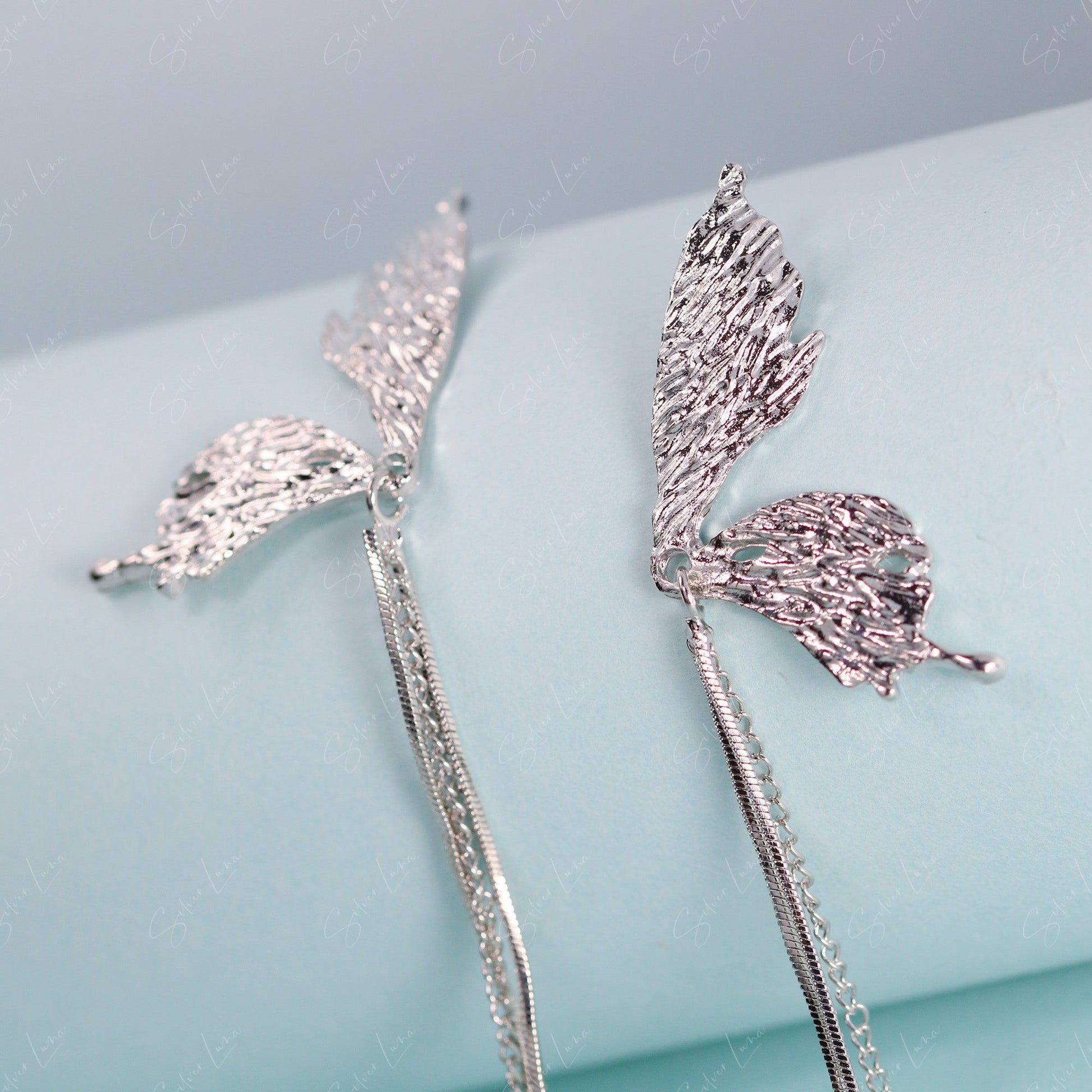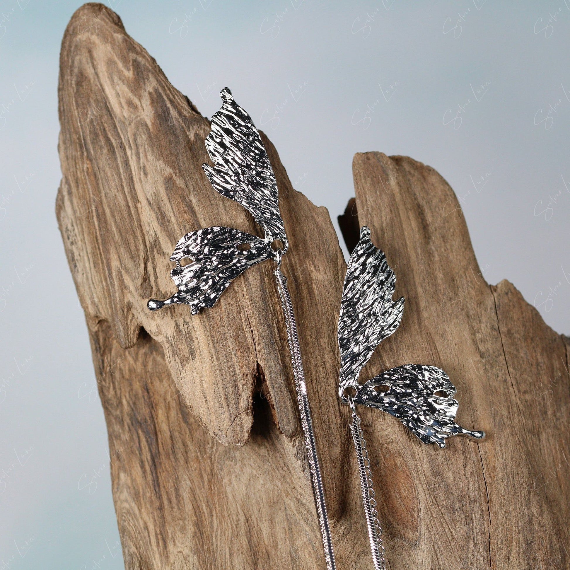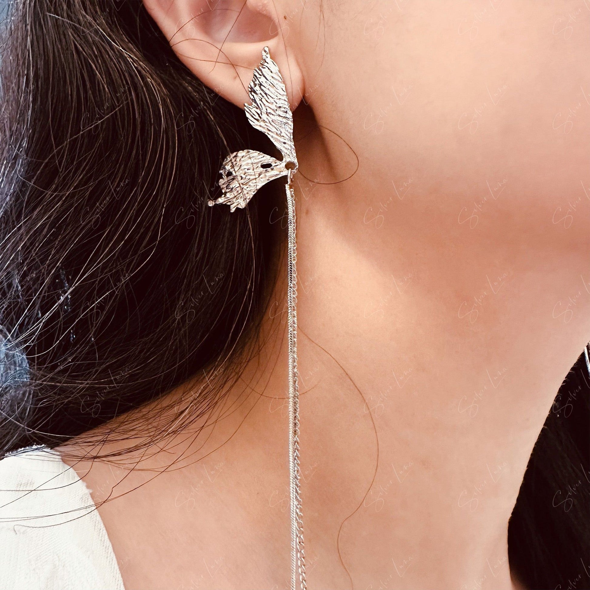 These elegant long chain drop metal butterfly earrings features a textured butterfly in silver color and long chains drop. These cute butterfly long drop earrings will make a unique statement and elevate your outfit.