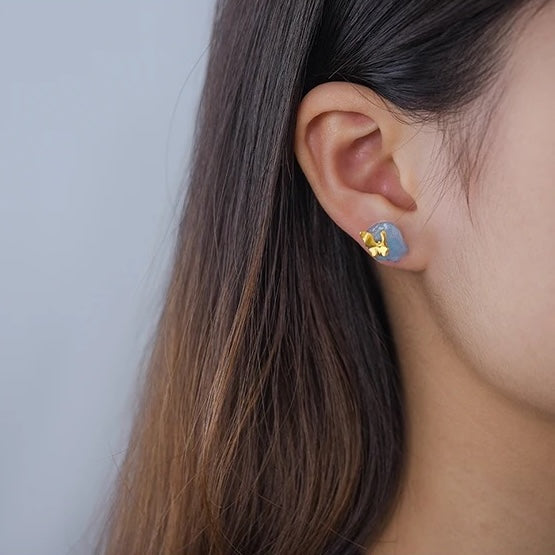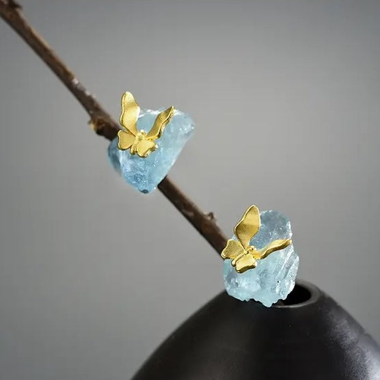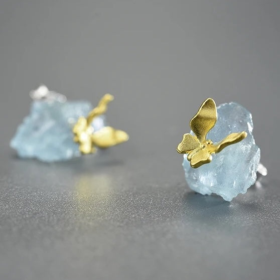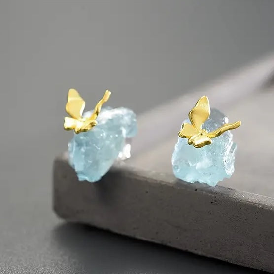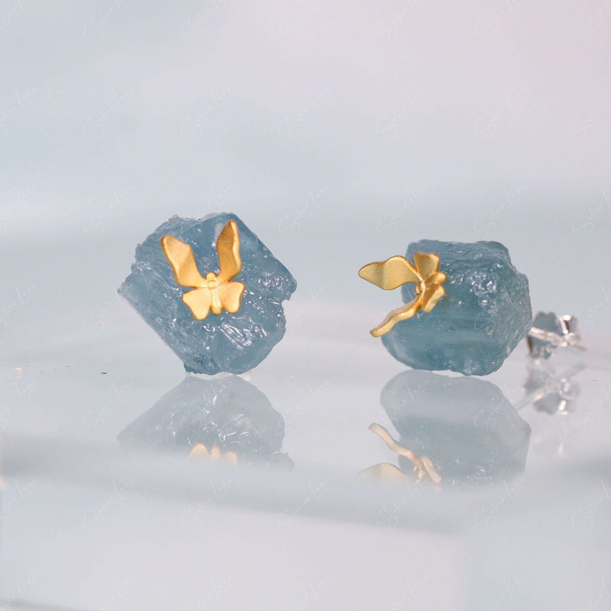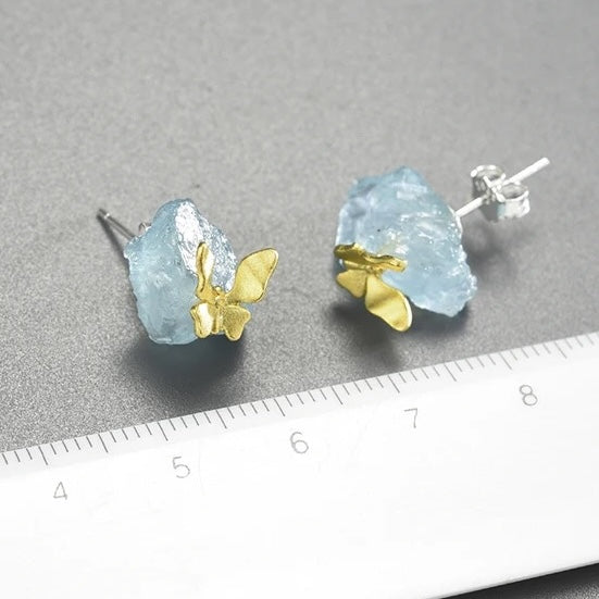 These darling butterfly stud earrings bring a touch of nature's beauty to your everyday jewelry collection. Crafted from sterling silver in a simple stud design, the base features a raw aquamarine stone that captures the light blue color of the sea. Perched atop the aquamarine stone is a tiny golden sterling silver butterfly, as if it just landed on a flower. The simple yet stylish design allows this pair of earrings to complement virtually any outfit, from casual to dressy, infusing your look with an understated sense of whimsy. Add a little butterfly magic to your wardrobe with these aquamarine and sterling silver earrings.