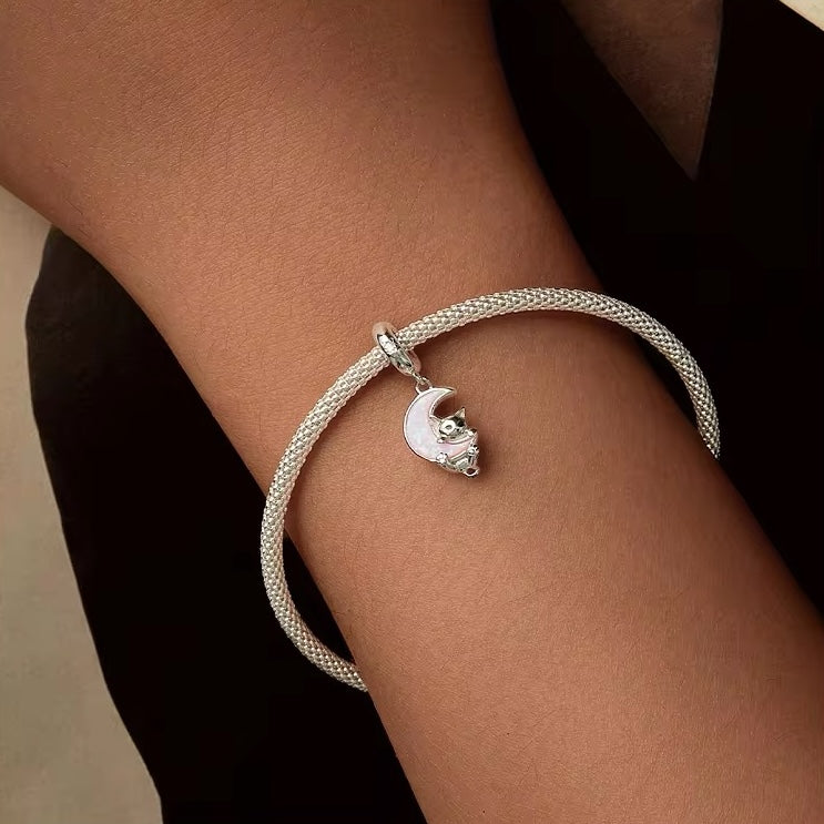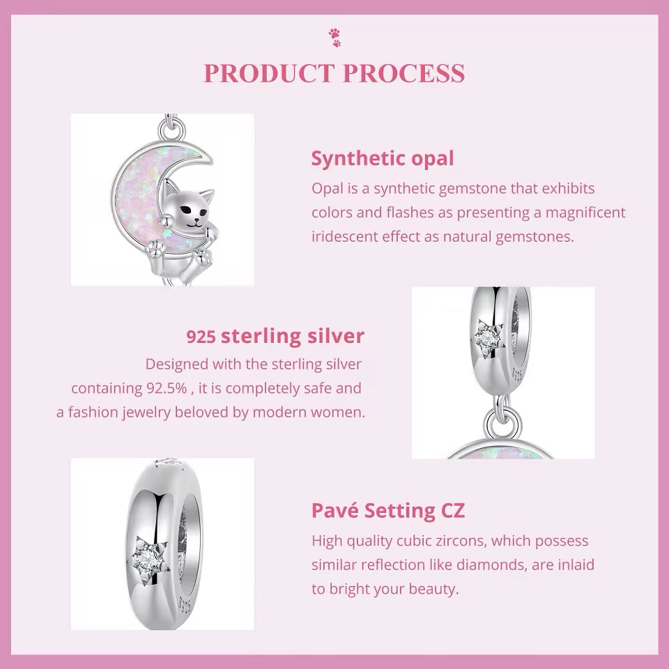 Bring some feline charm to your bracelet with our 925 sterling silver Cat hanging on Opal moon pendant charm! Crafted with quality materials, this unique charm is perfect for cat lovers and adds a touch of whimsy to any jewelry collection.