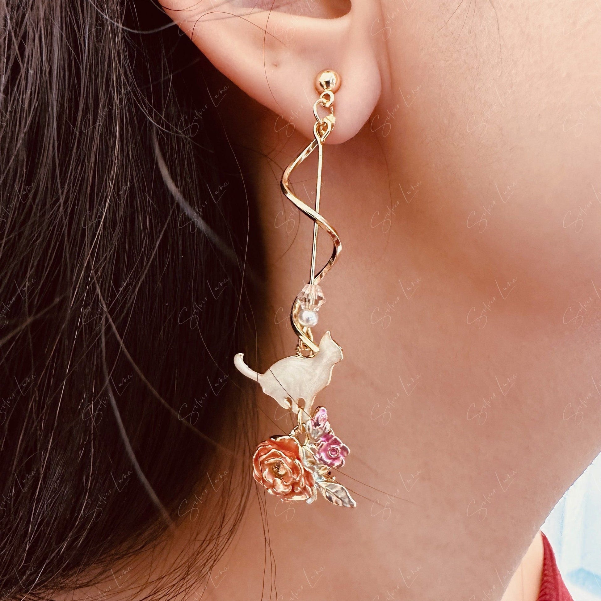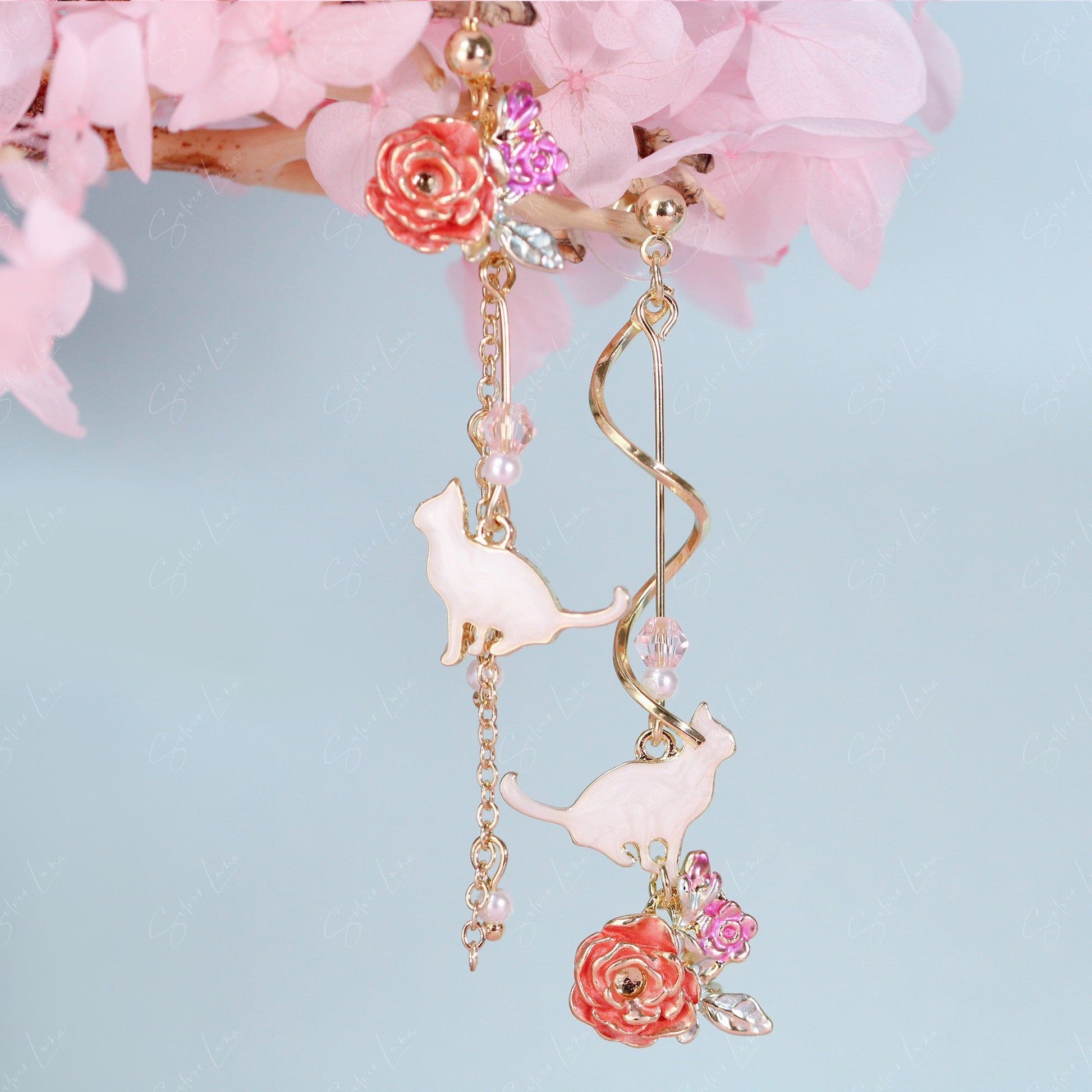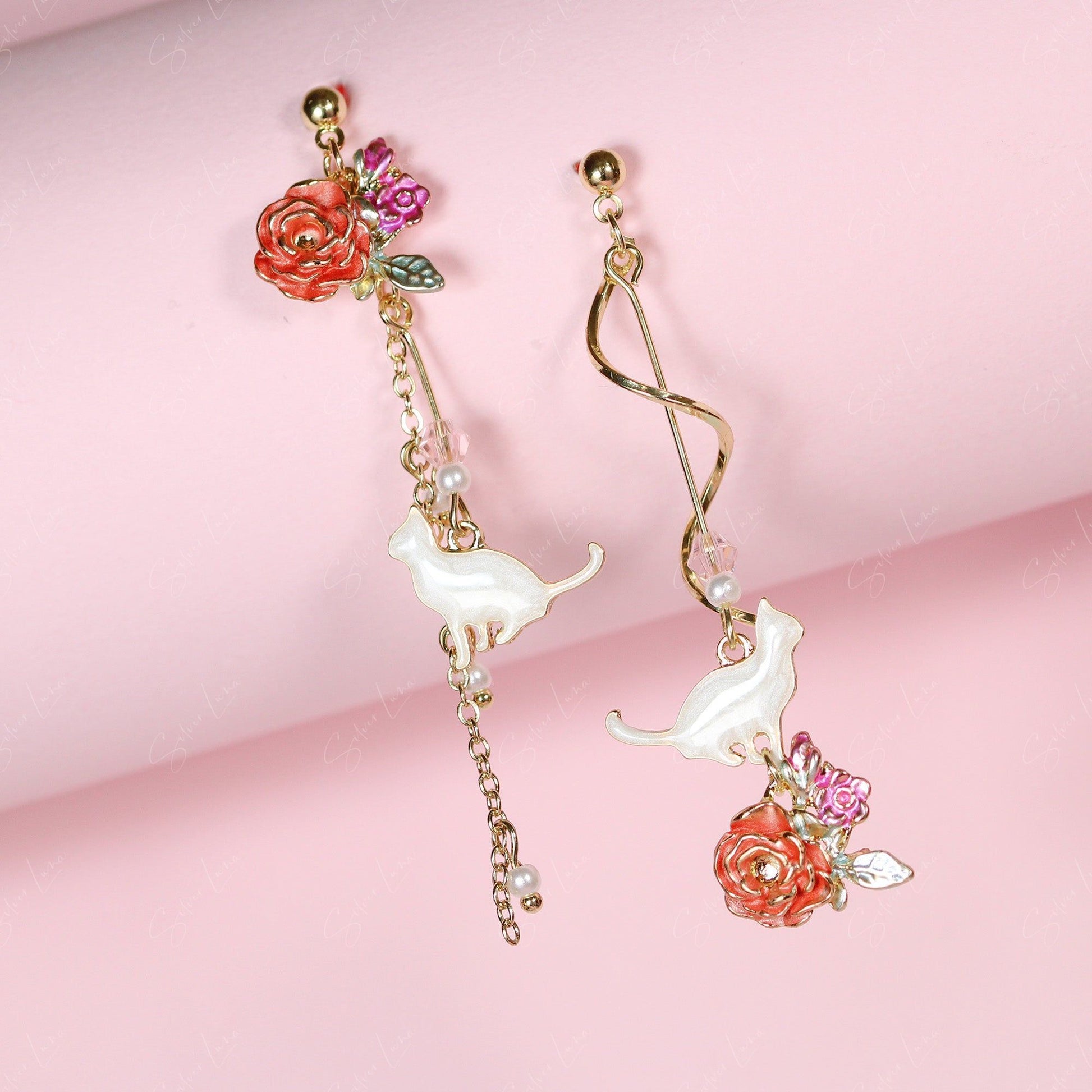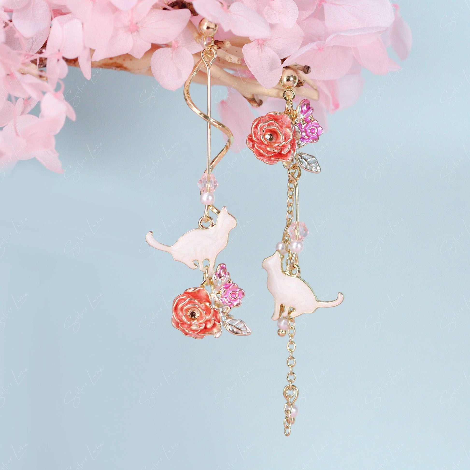 This pair of elegant dangle drop fashion earrings features a cat sitting on enamel rose flower. The asymmetric design makes these earrings unique and fun to wear as a perfect party jewelry that can elevate your outfit.