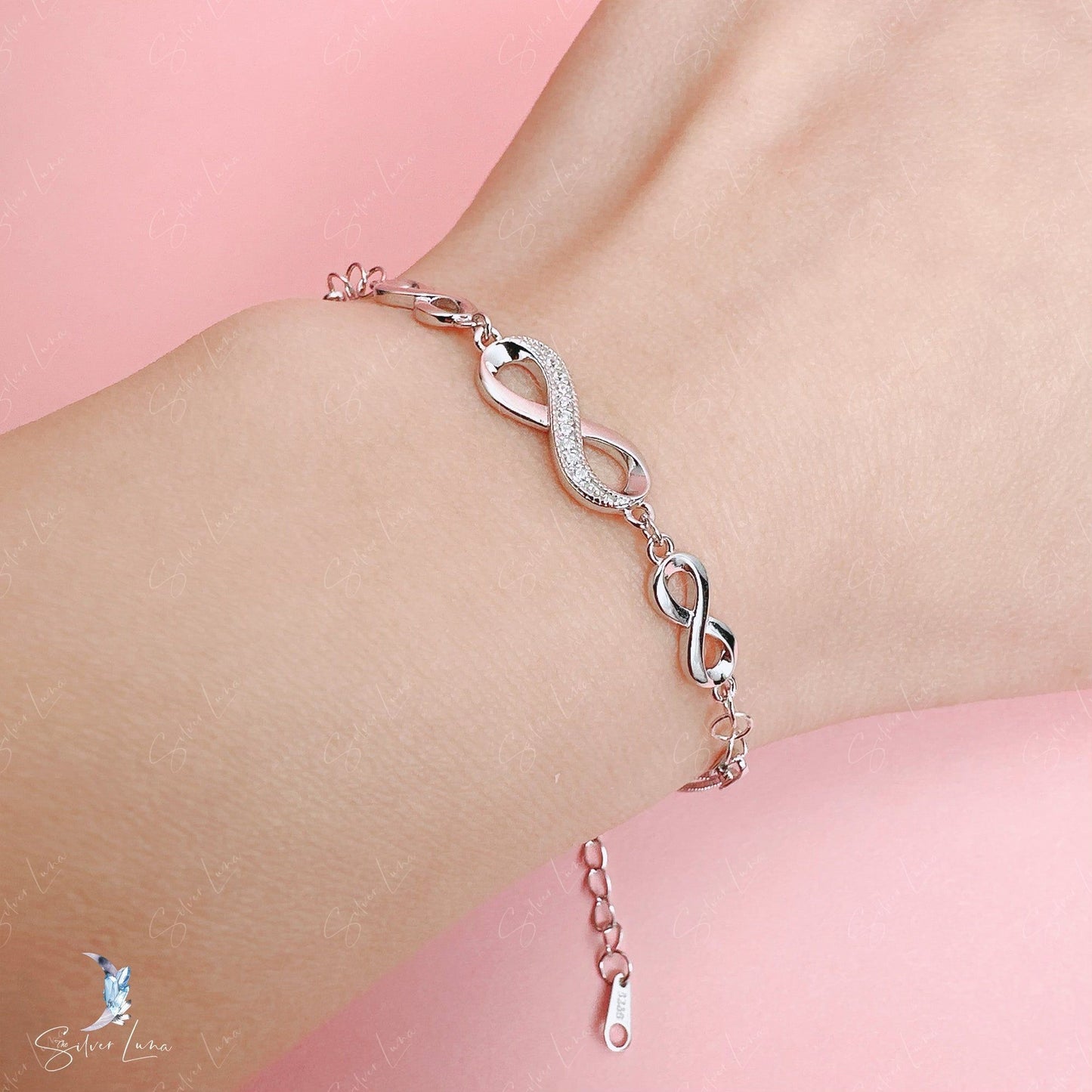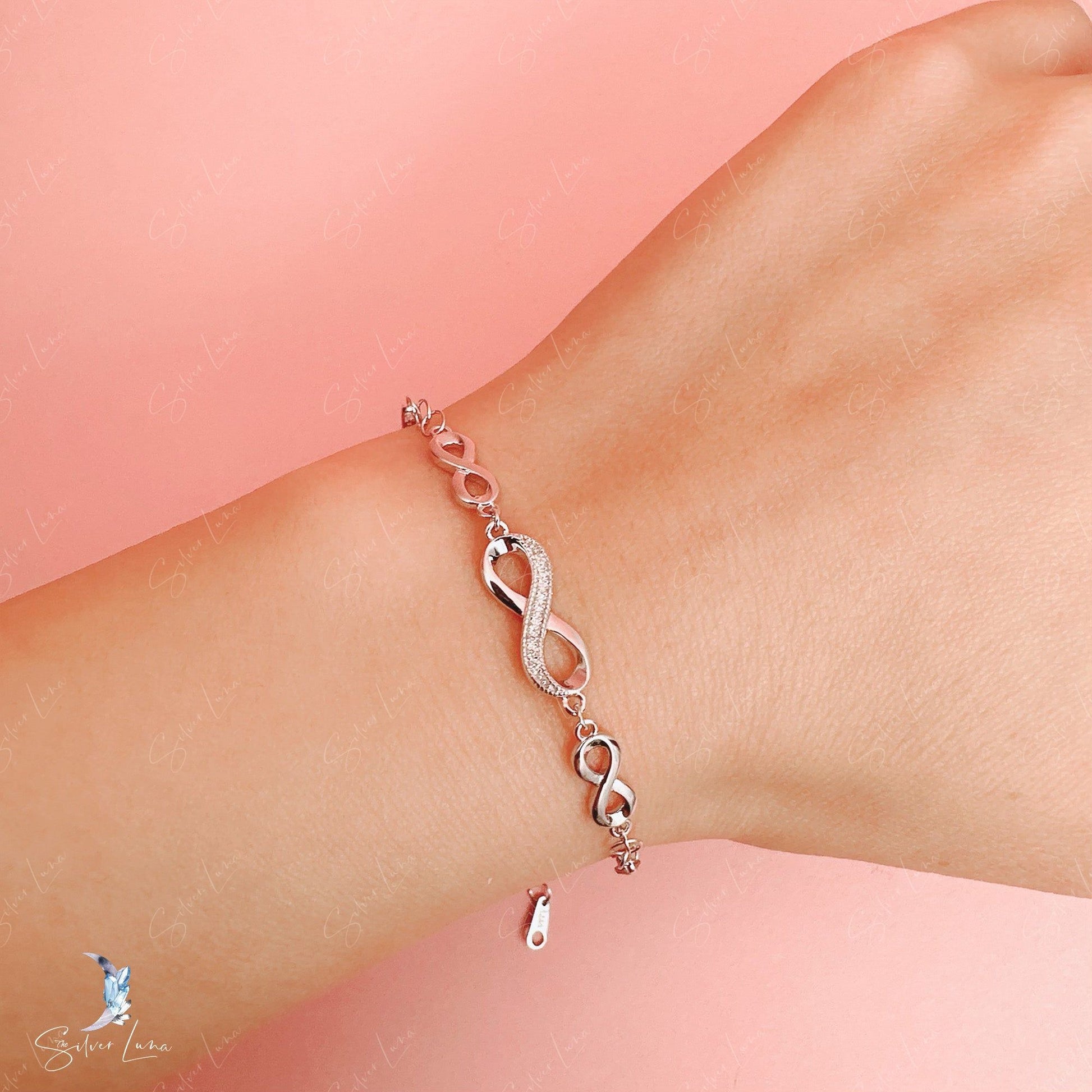 Upgrade your fine jewelry collection with this stunning Chain of Infinity bracelet. Crafted with love and care, this sterling silver bracelet features the timeless infinity symbol adorned with sparkling cubic zirconia gems. The platinum plating gives it a luxurious finish, ensuring long-lasting shine. Perfect as a gift for a loved one or a beautiful addition to your everyday wear.