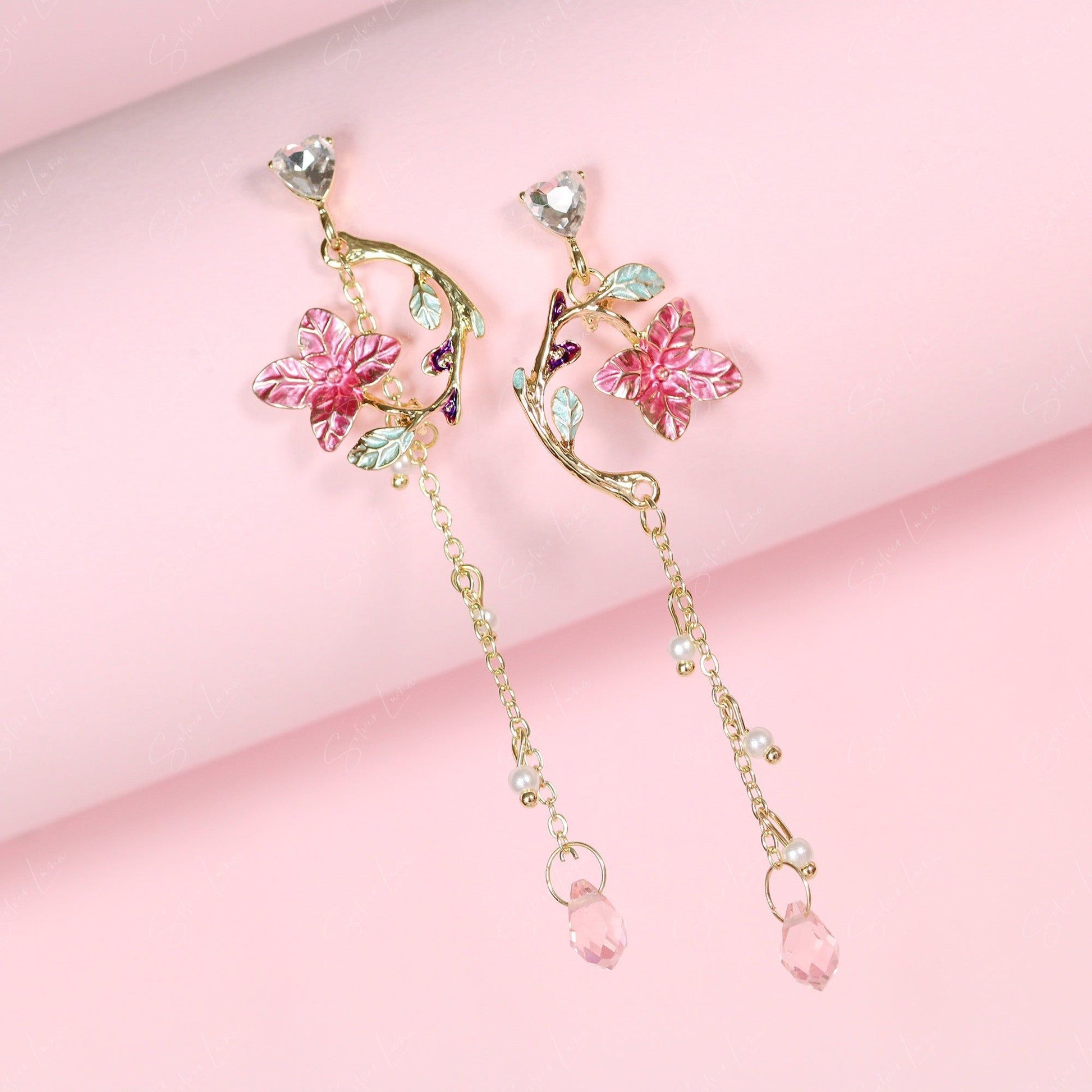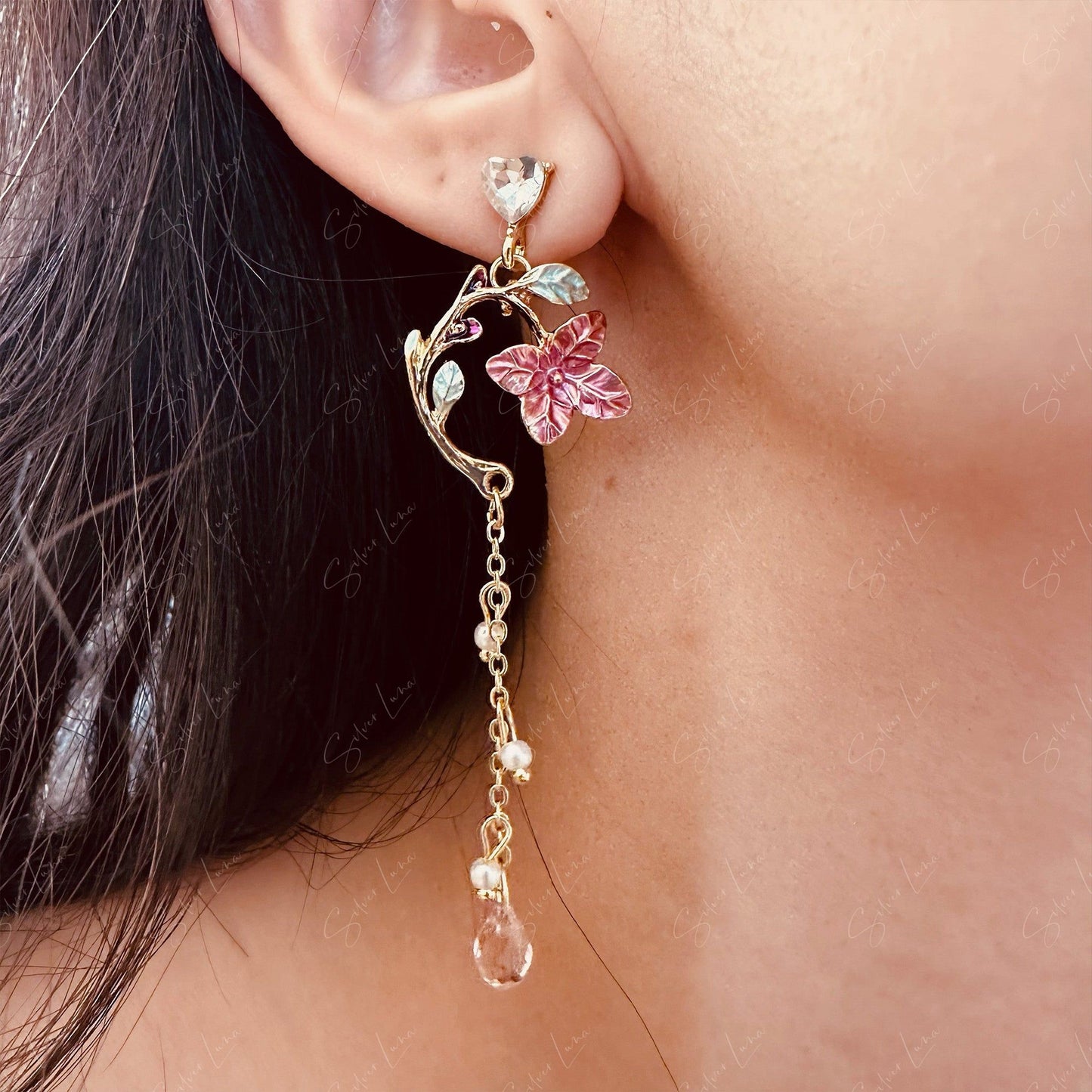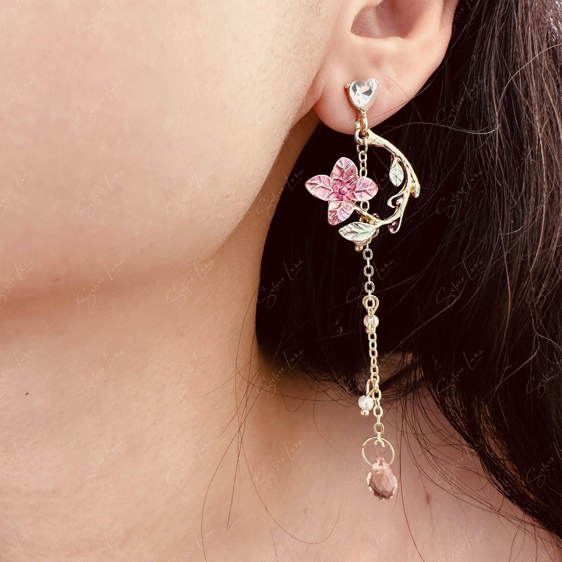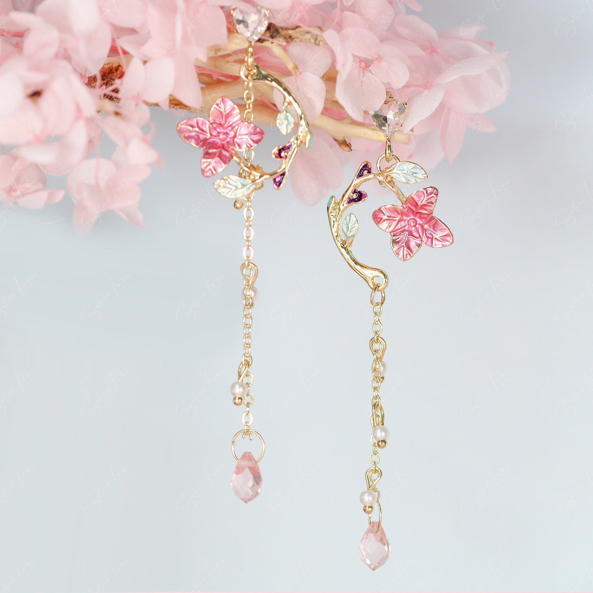 These elegant dangle drop fashion earrings features a Japanese cherry blossom enamel charm with long tails dangle drop, asymmetric design. With unique, elegant design, these earrings will elevate your outfit. Add these cherry blossom dangle drop earrings to your everyday jewelry collection or as gift for your love one.