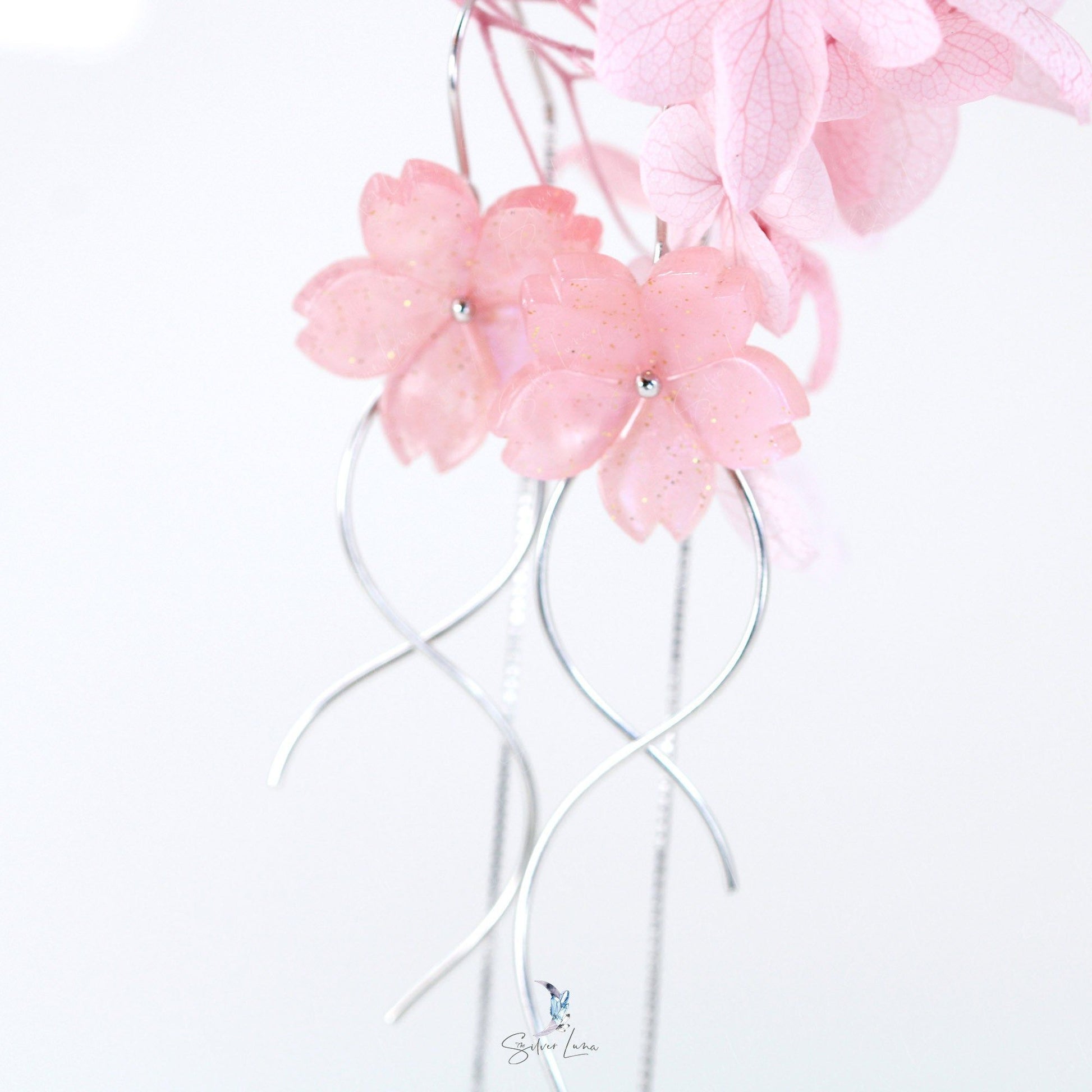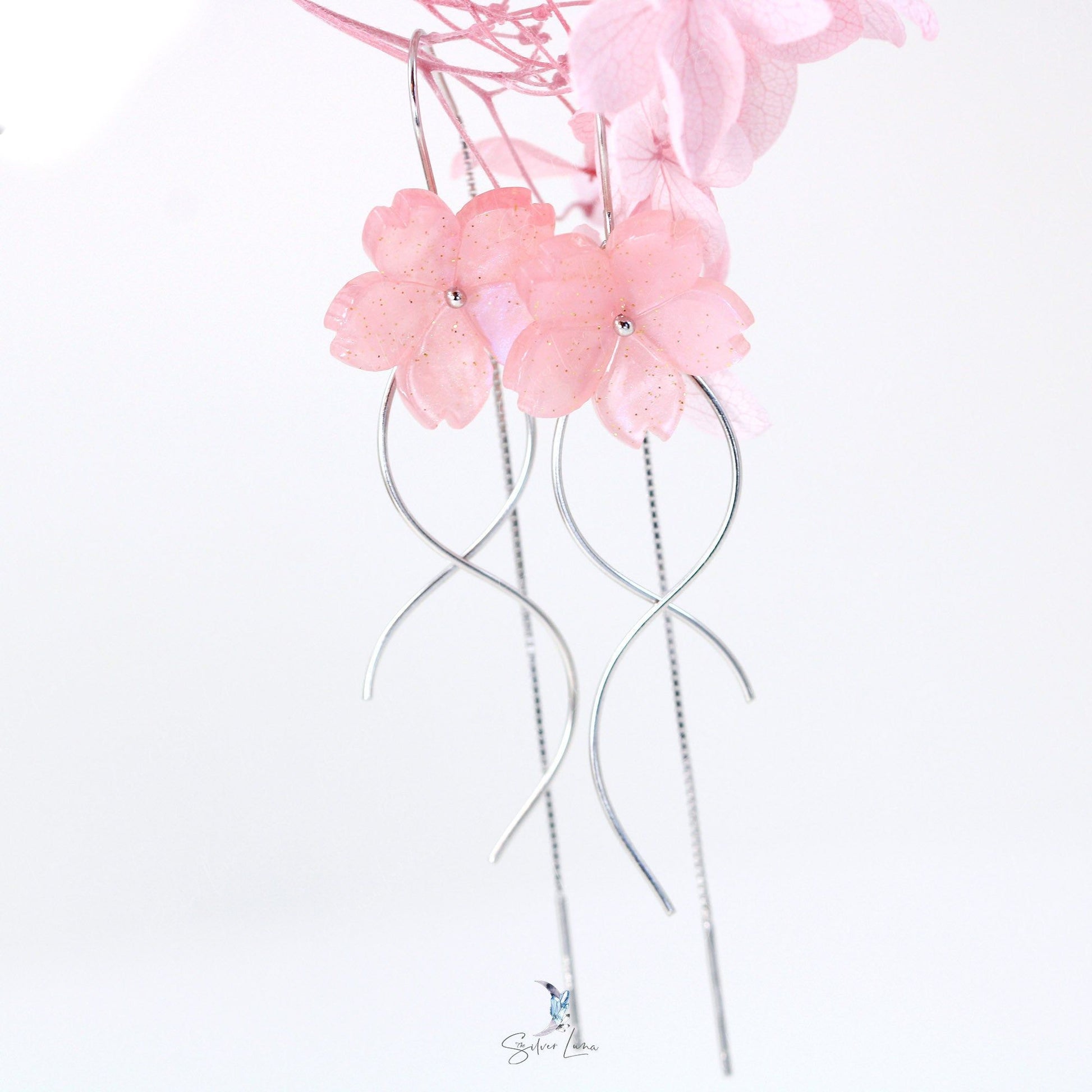 Elevate your gift-giving game with these stunning cherry blossom flower silver earrings! Experience the enchanting beauty of solid 925 sterling silver and resin pink cherry blossom flower charms, elegantly attached to long wave tassel drops on box chain ear threaders. Whether you're building your own fine jewelry collection or searching for the perfect gift, these charming earrings are sure to evoke strong emotions and add a touch of grace to any outfit.