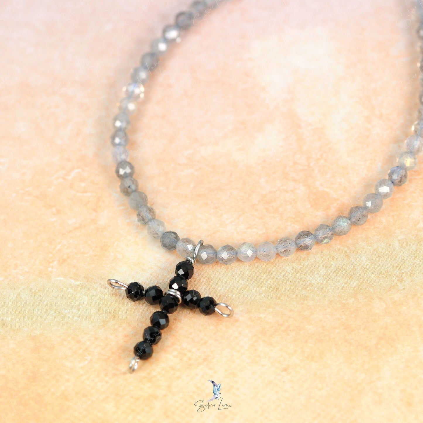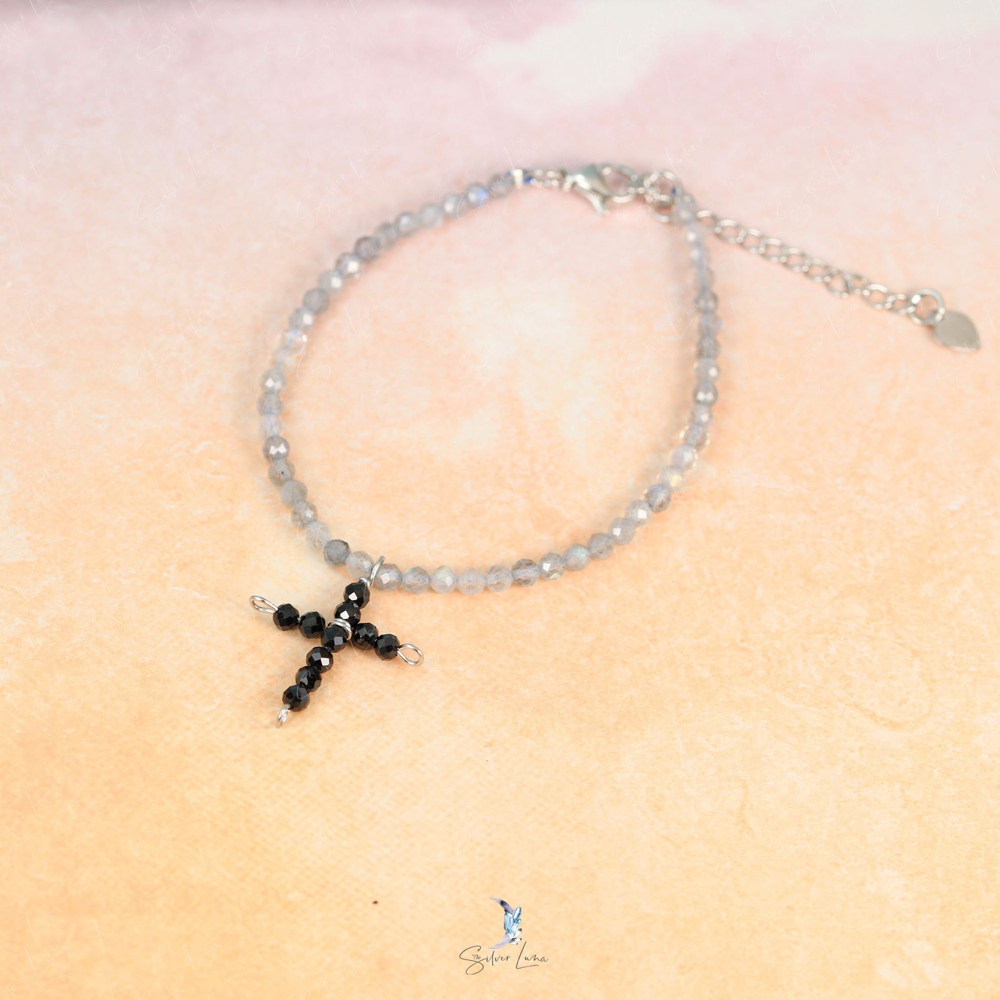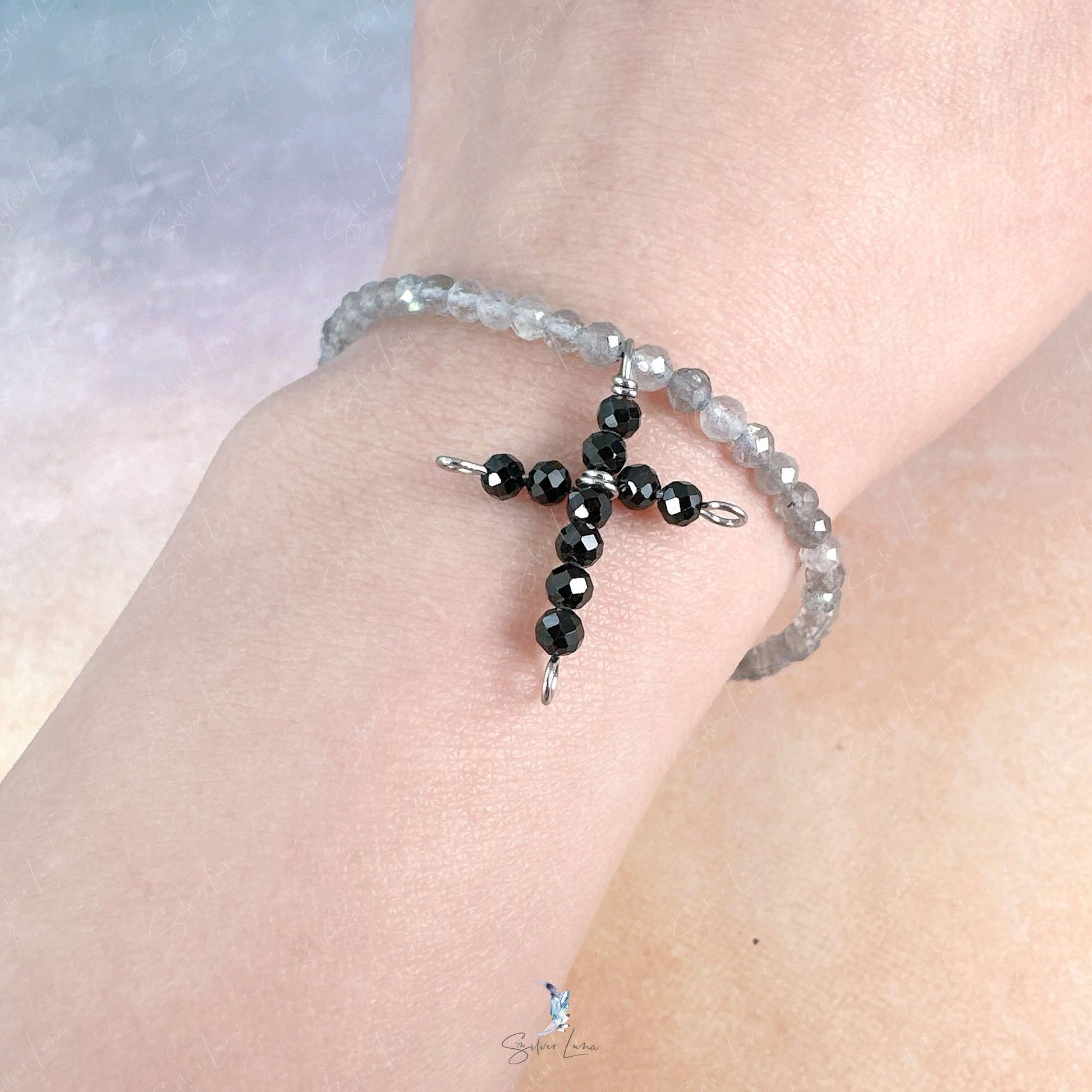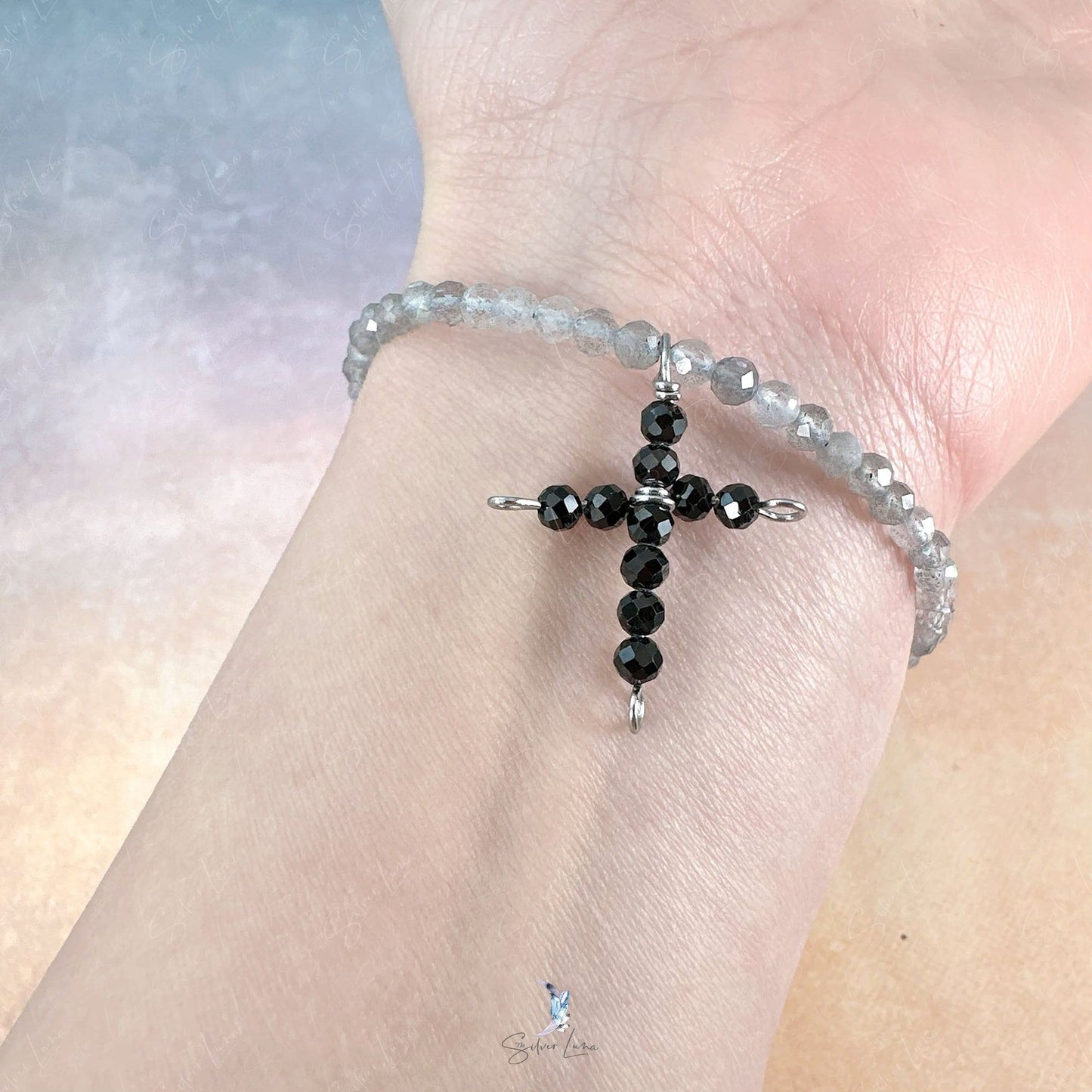 This captivating bracelet boasts a striking black cross and stunning Labradorite stone beads, complemented by small black spinel stones. The faceted gray Labradorite stones emit a mesmerizing sparkle, while the bold black cross adds a distinct element to the overall design. Whether worn daily or given as a thoughtful religious gift, this Labradorite beaded bracelet is a must-have accessory.