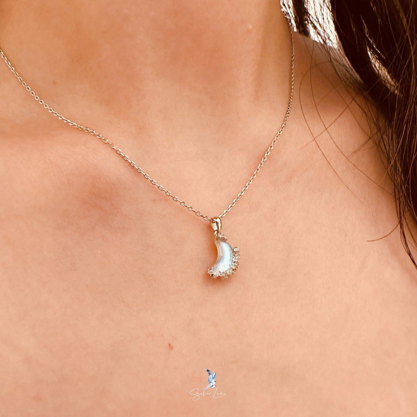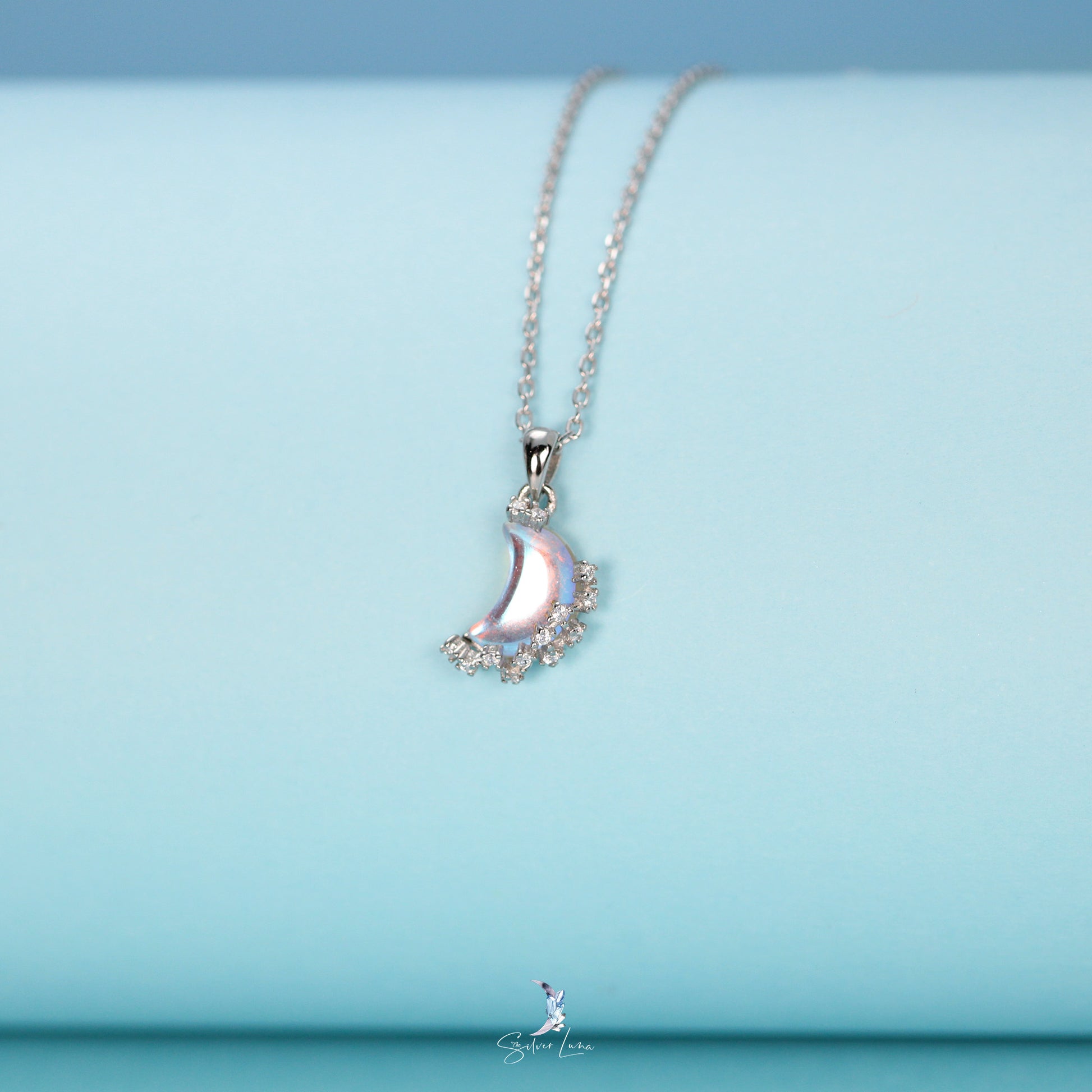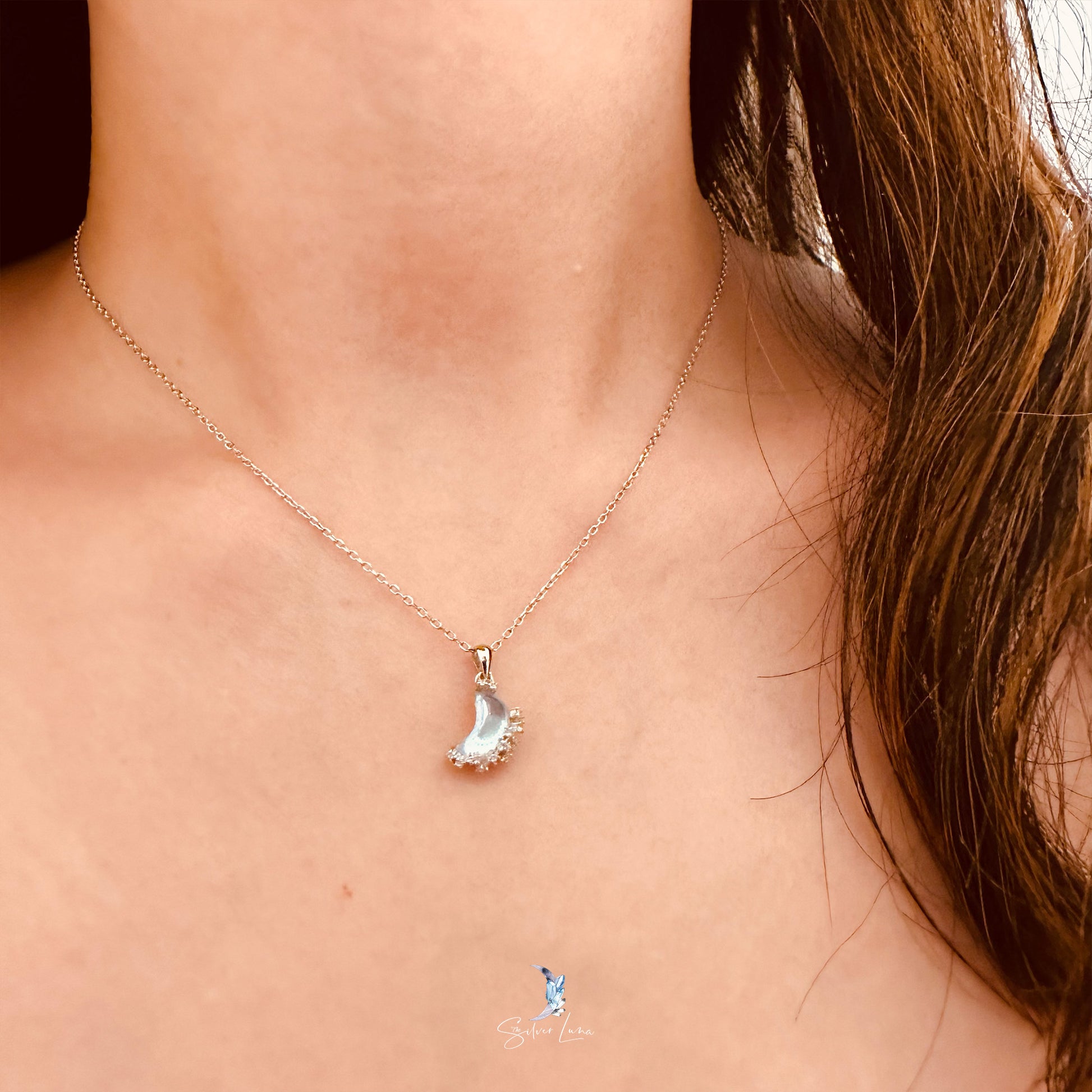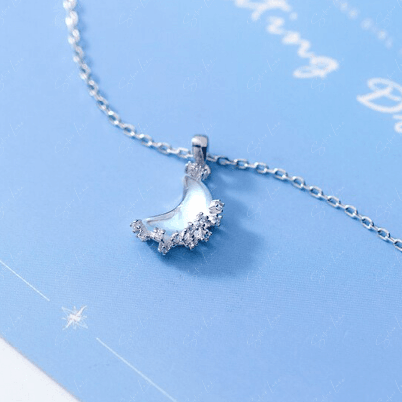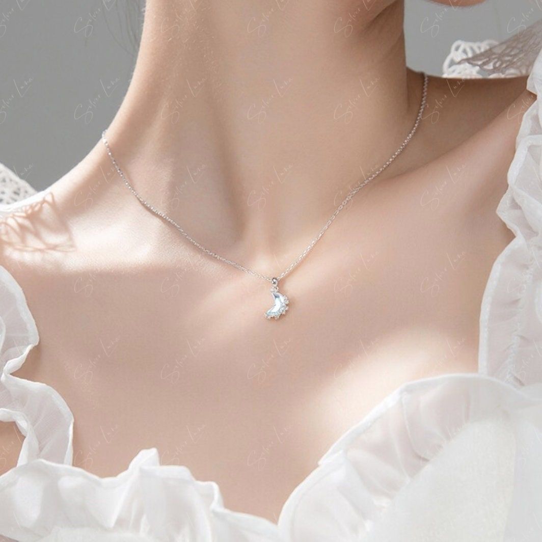 This stunning moon pendant necklace features a gorgeous moon-shaped crystal pendant adorned with sparkling cubic zirconia on a 925 sterling silver setting, complete with a matching cable chain necklace. Add this exquisite piece to your collection of fine jewelry or give it as a meaningful gift to a loved one.