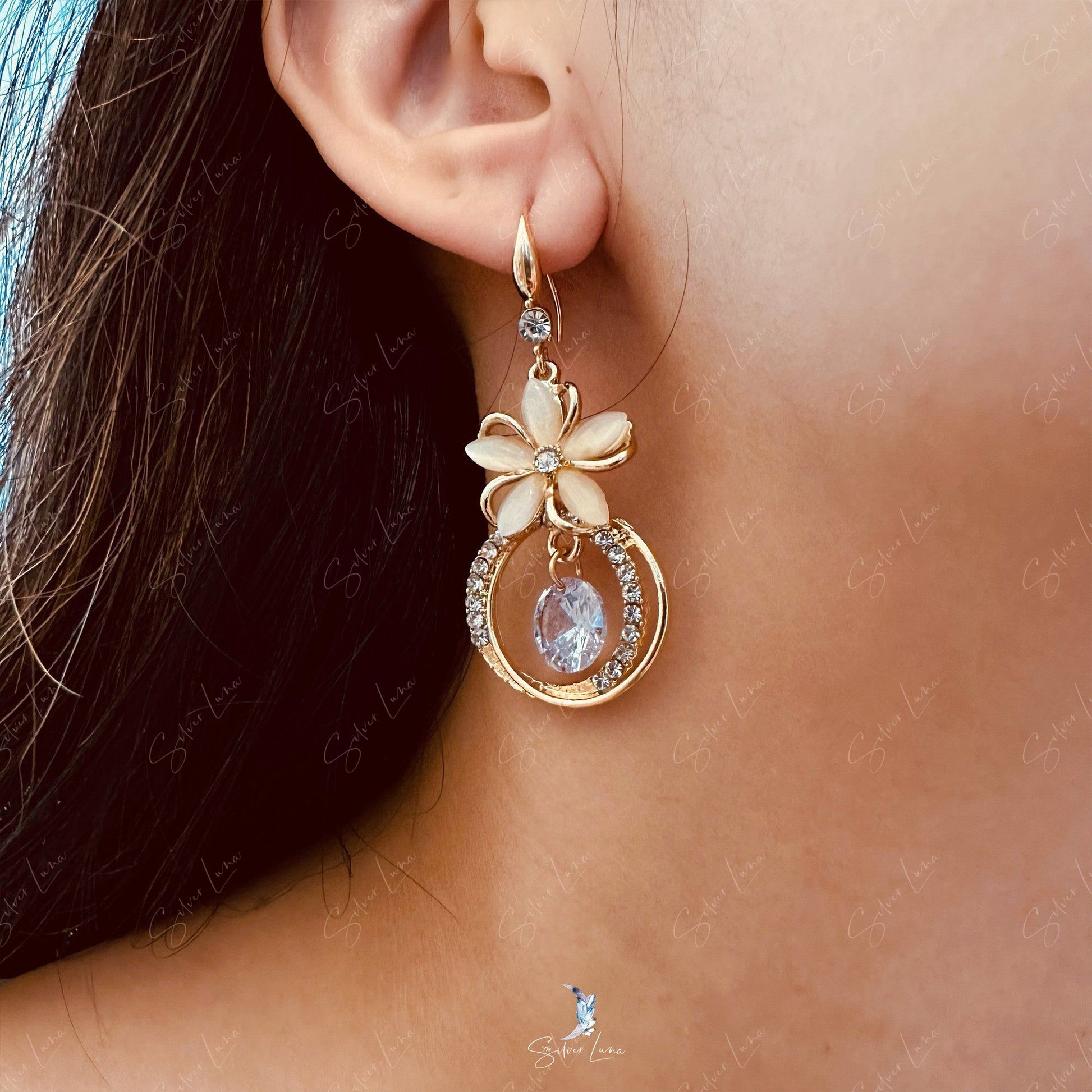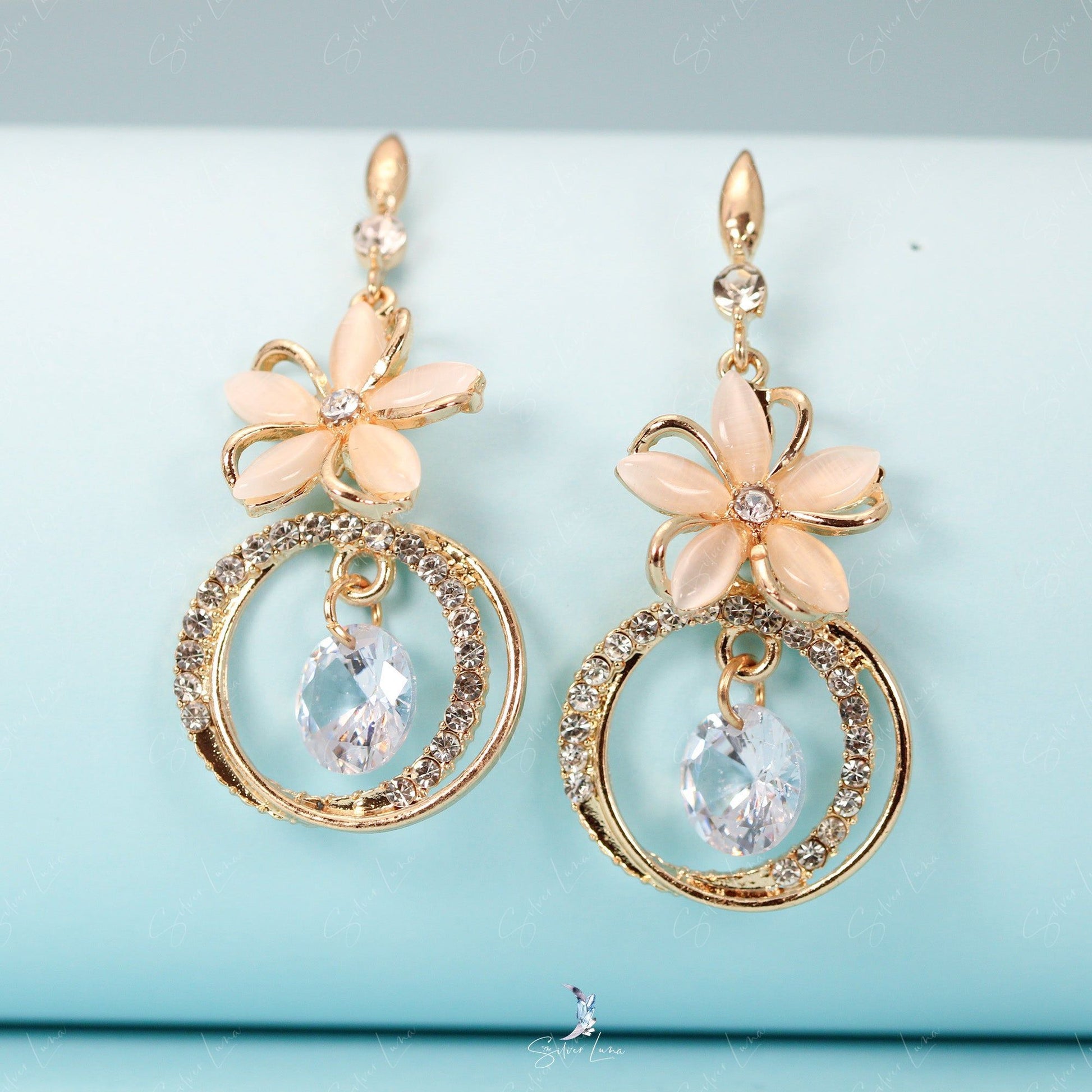 These cute Korean fashion earrings features elegant crystal flower with crystal rhinestone circle and diamond shape crystal drop to maximum light reflection and make you shine at the party. Add these elegant crystal rhinestone fashion earrings to your everyday fine jewelry collection or as gift for your love one.