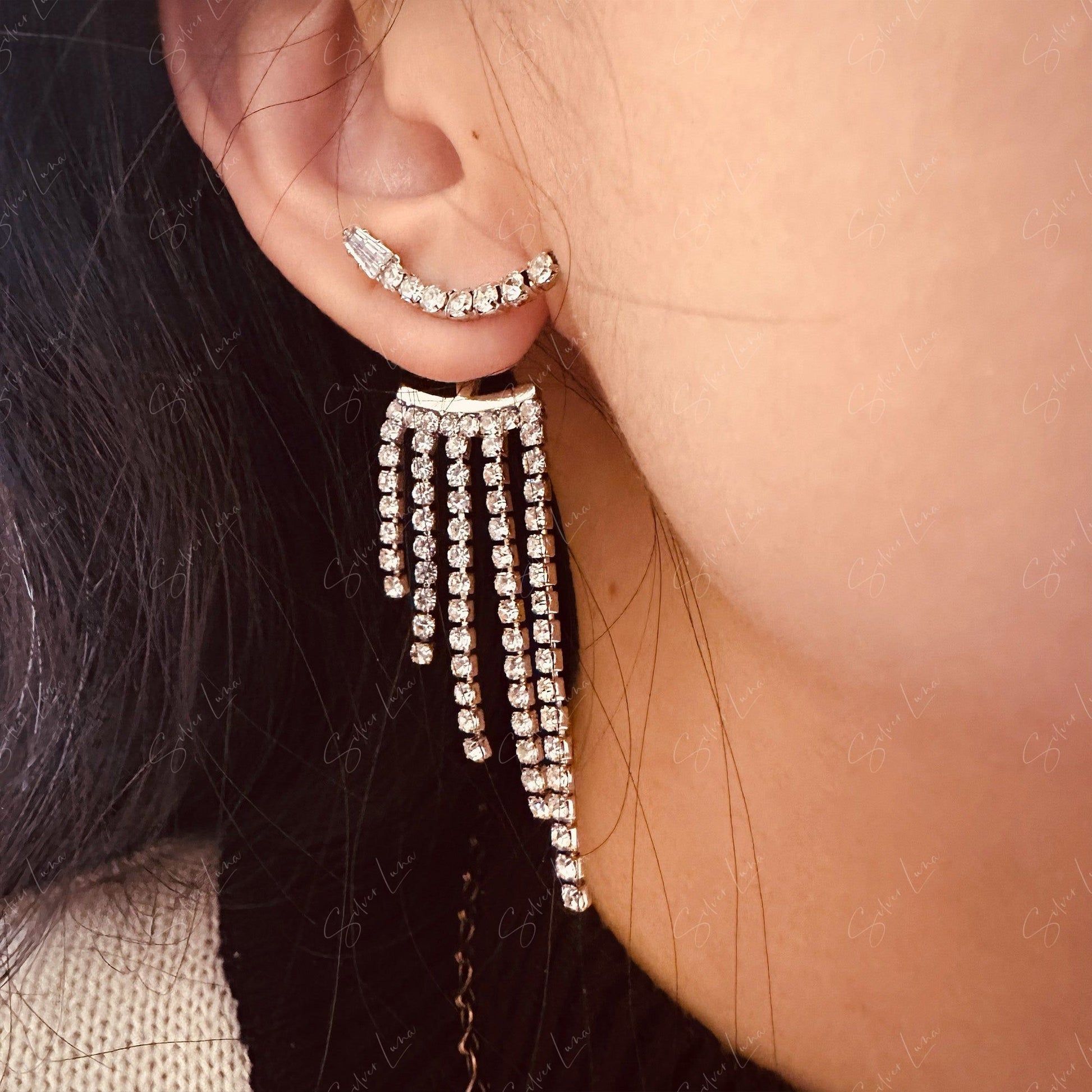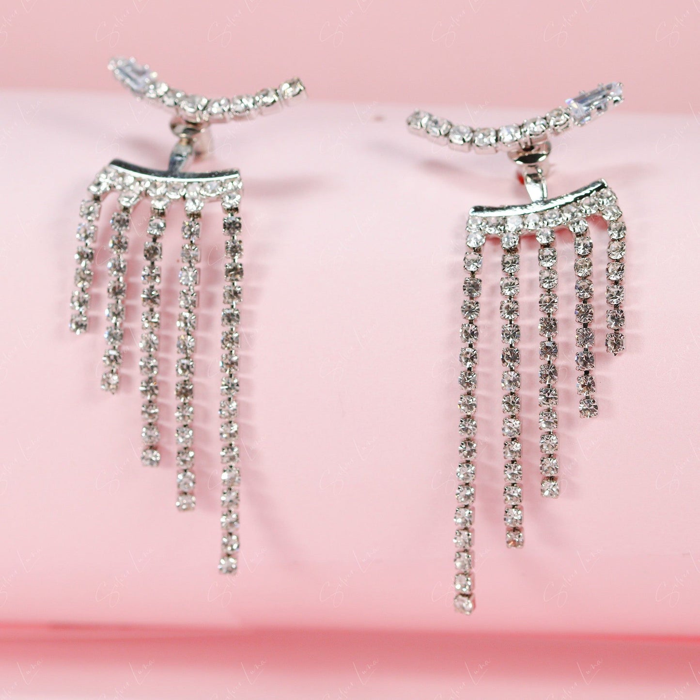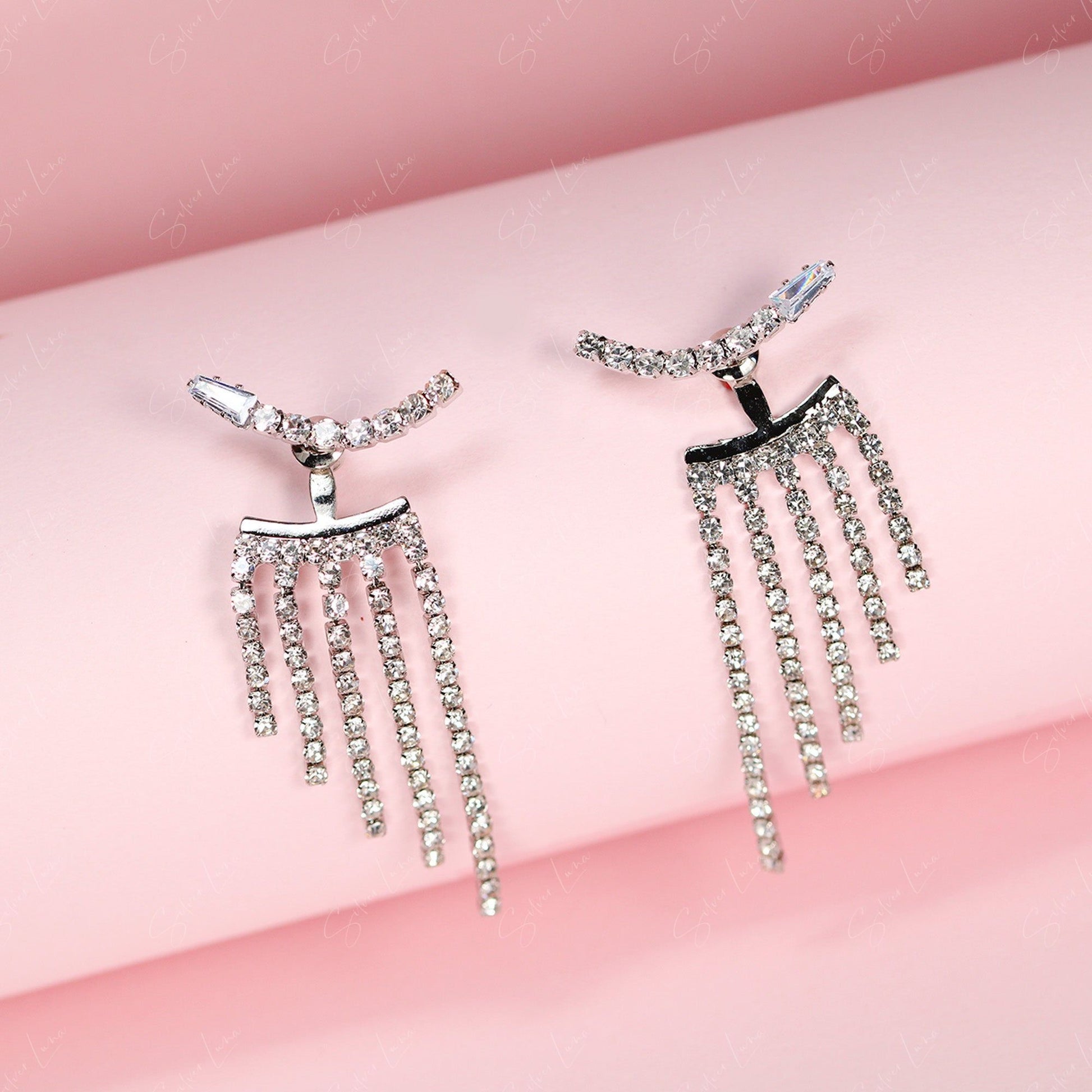 These bling bling crystal rhinestone ear jacket drop earrings feature all shiny crystal rhinestone drop as ear jacket on a rhinestone arc shape as stud earrings. These rhinestone earrings will maximum light refection and make you shine at the party.