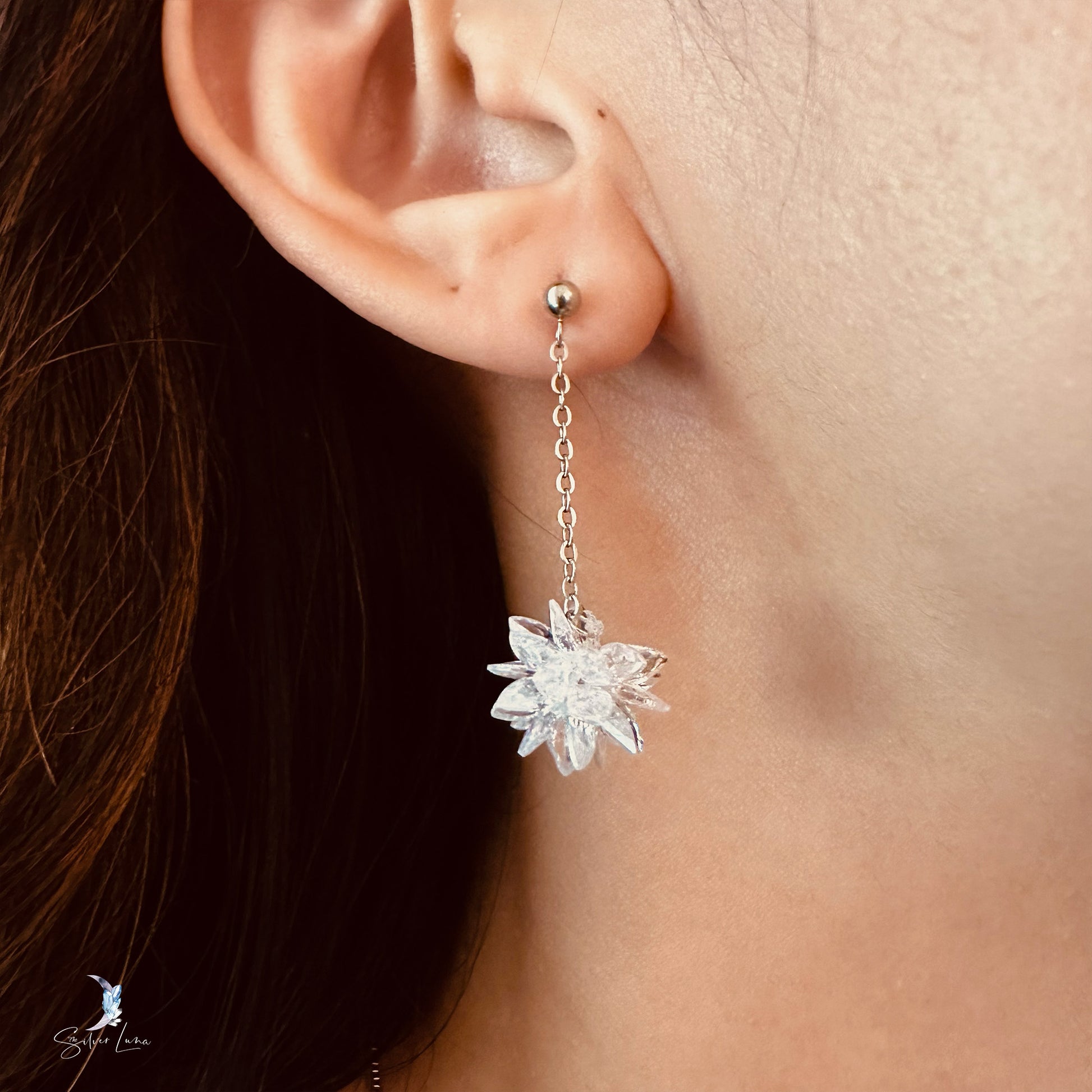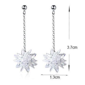 This stunning pair of snow flower dangle drop earrings showcases a delicate snowflake or lotus flower crafted from luminous white crystals, suspended from a dainty chain made of high-quality 925 sterling silver with a luxurious platinum plating. Elevate your fine jewelry collection with these elegant white flower dangle drop earrings, or delight your loved ones with them as a thoughtful Christmas gift.