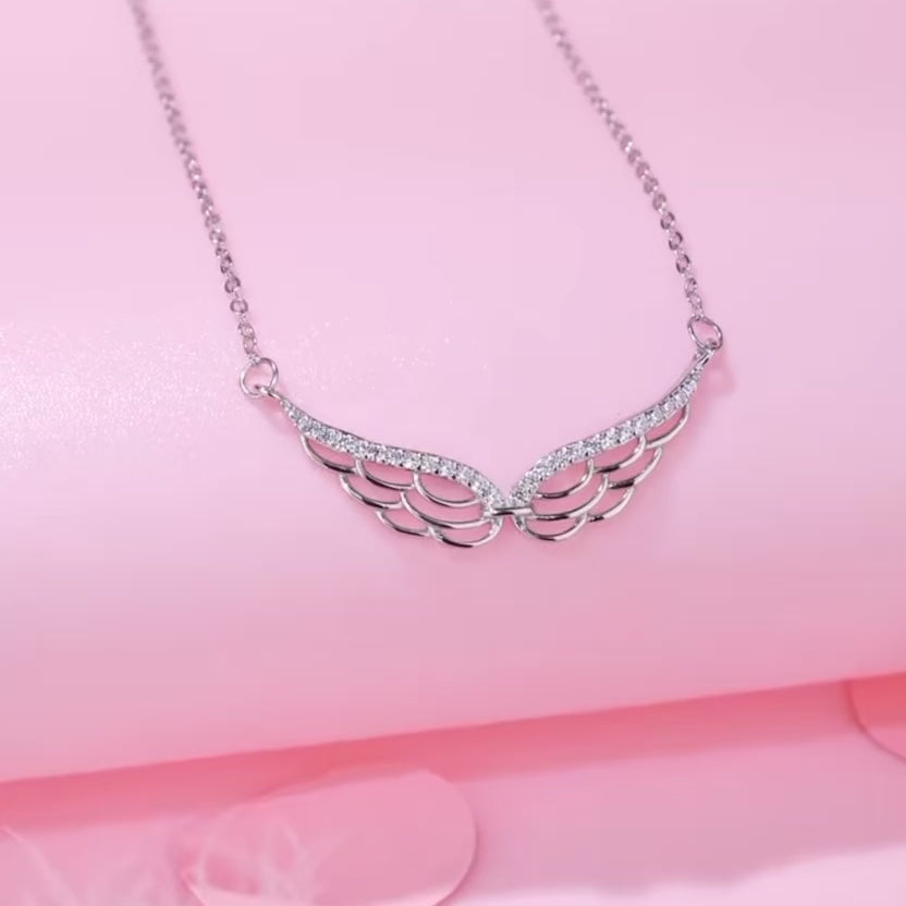 This elegant angel wing pendant necklace features a cute angel wing pendant with cubic zirconia pave in 925 sterling silver and dainty cable chain. Transform your style with this stunning angel wing necklace that shines bright with cubic zirconia pave and 925 sterling silver. The delicate cable chain adds a touch of femininity to any outfit. Elevate your look with this beautiful piece of jewelry.