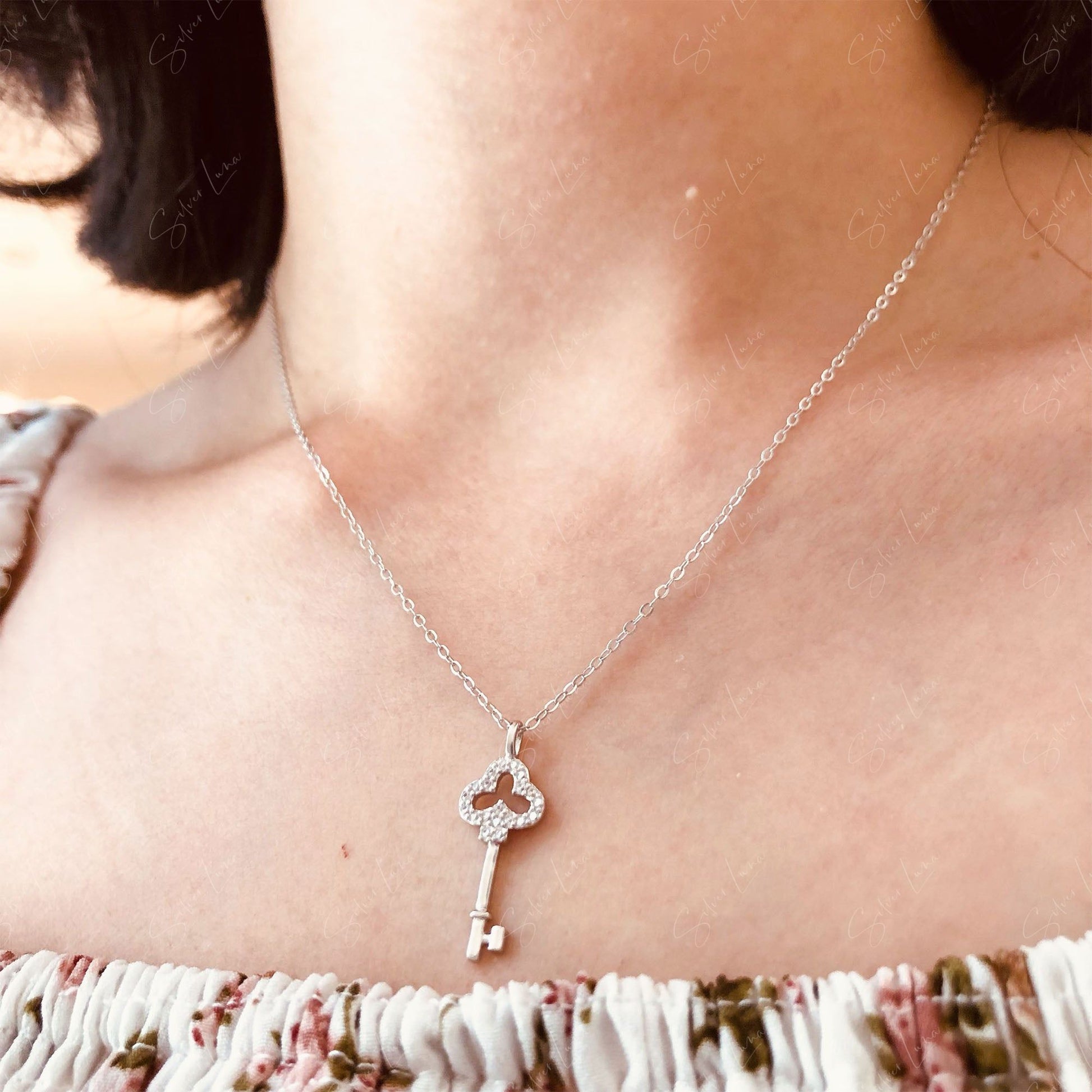 Experience elegance with this dainty key pendant necklace made of solid 925 sterling silver. The delicate cubic zirconia key pendant hangs from a cable chain, and is plated with platinum or gold for a high-end finish and lasting shine.