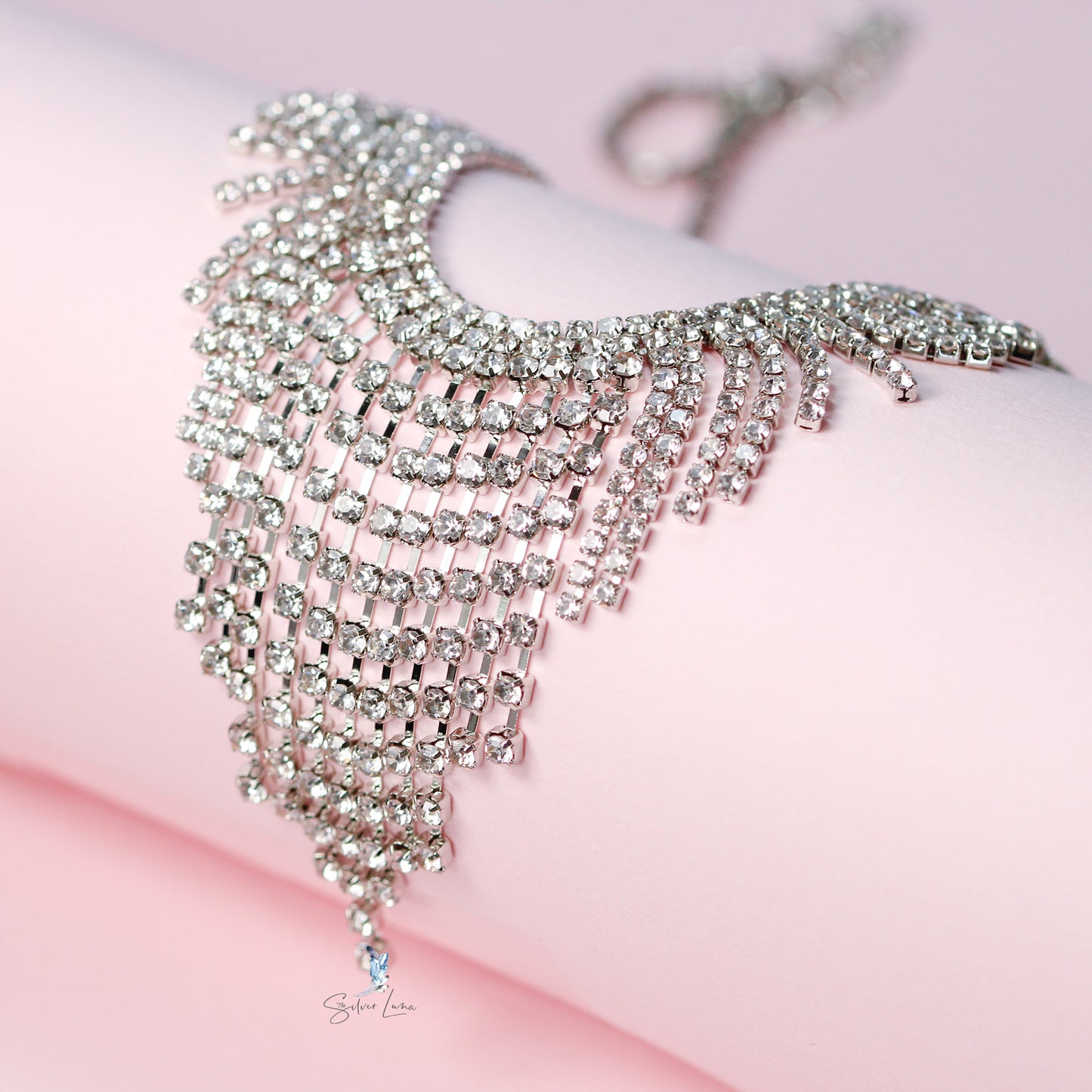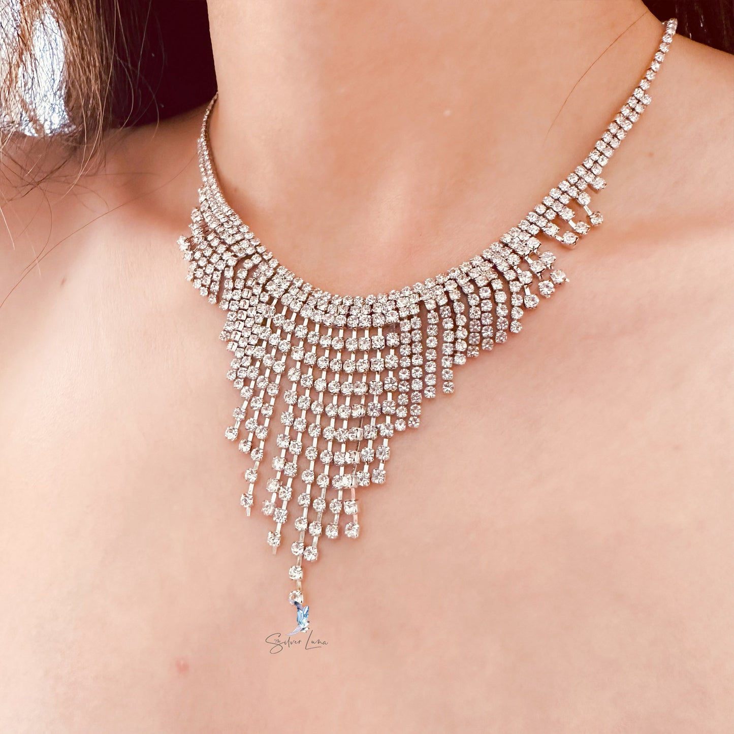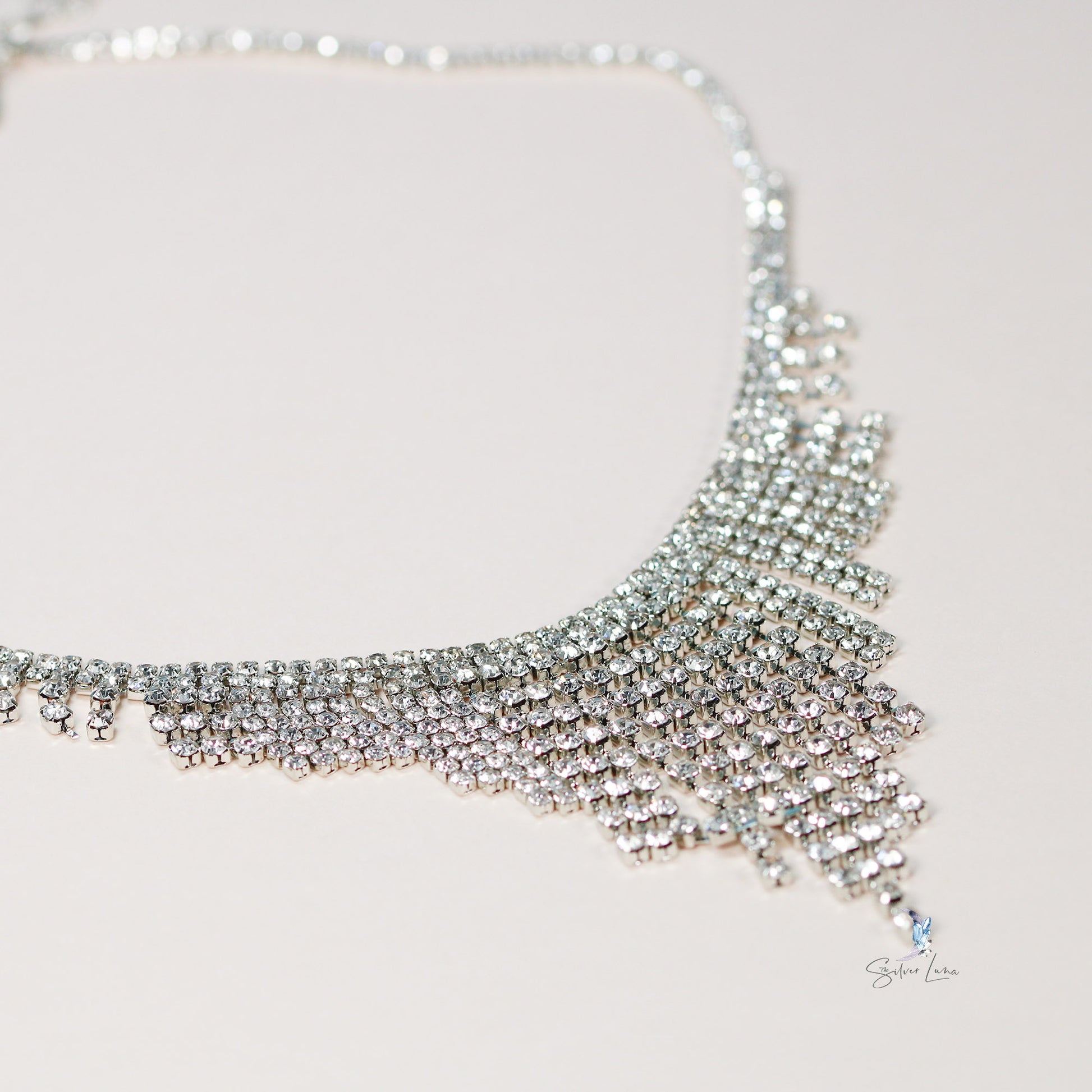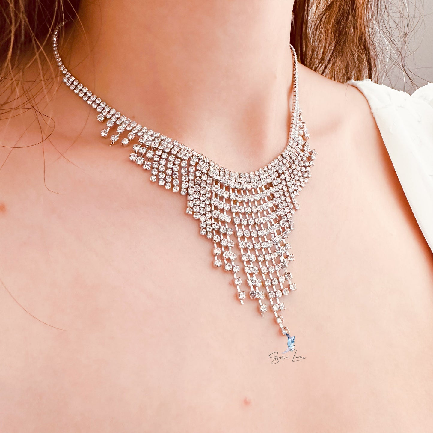 This breathtaking bridal necklace features dazzling crystal rhinestones that will make any bride shine on her special day. Add a touch of glamour and elegance to your wedding look and make a statement as you walk down the aisle. Elevate any bridal gown with this stunning necklace and sparkle all night long!